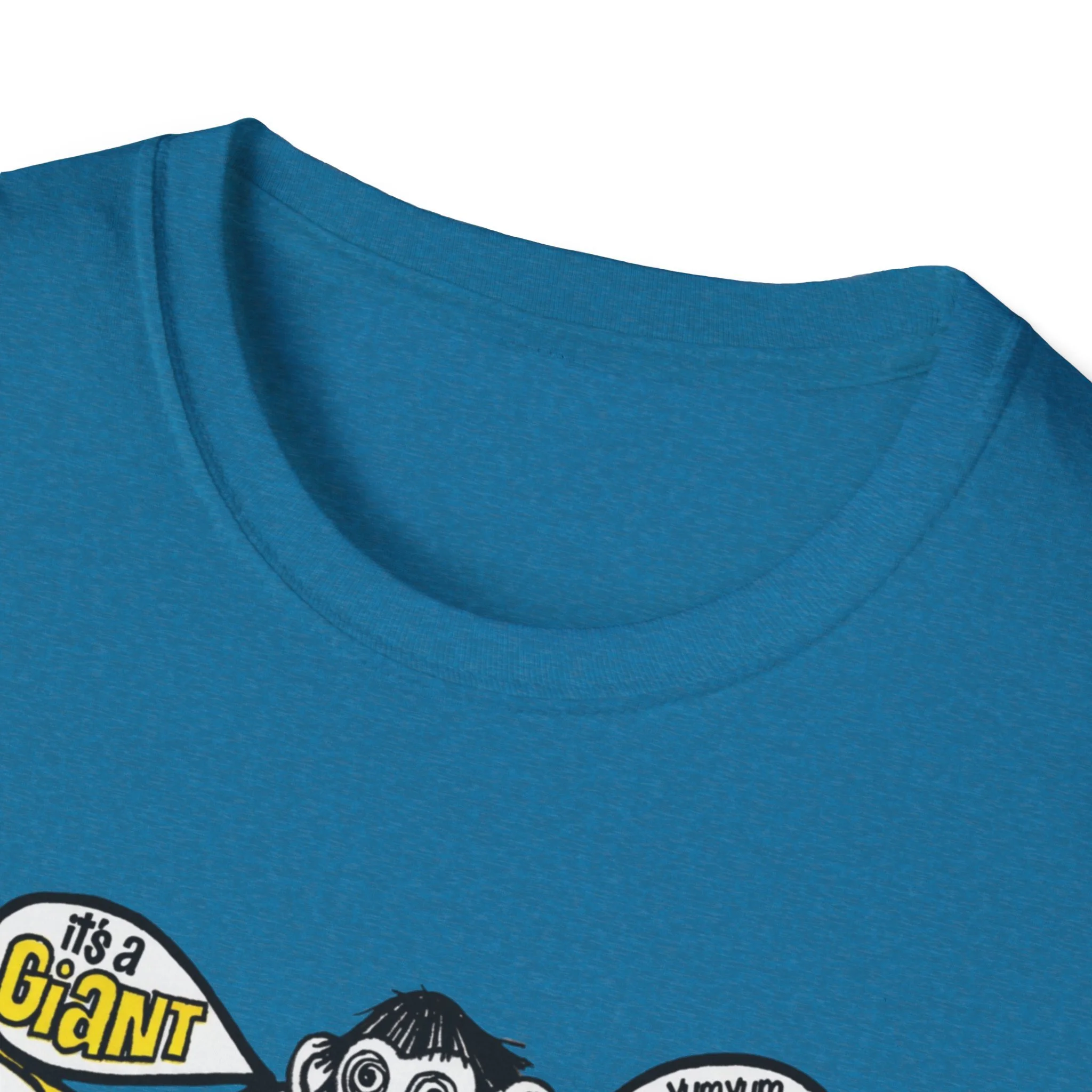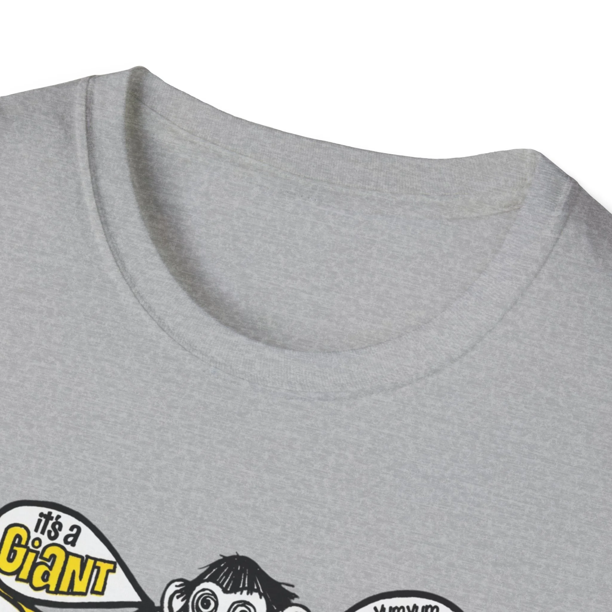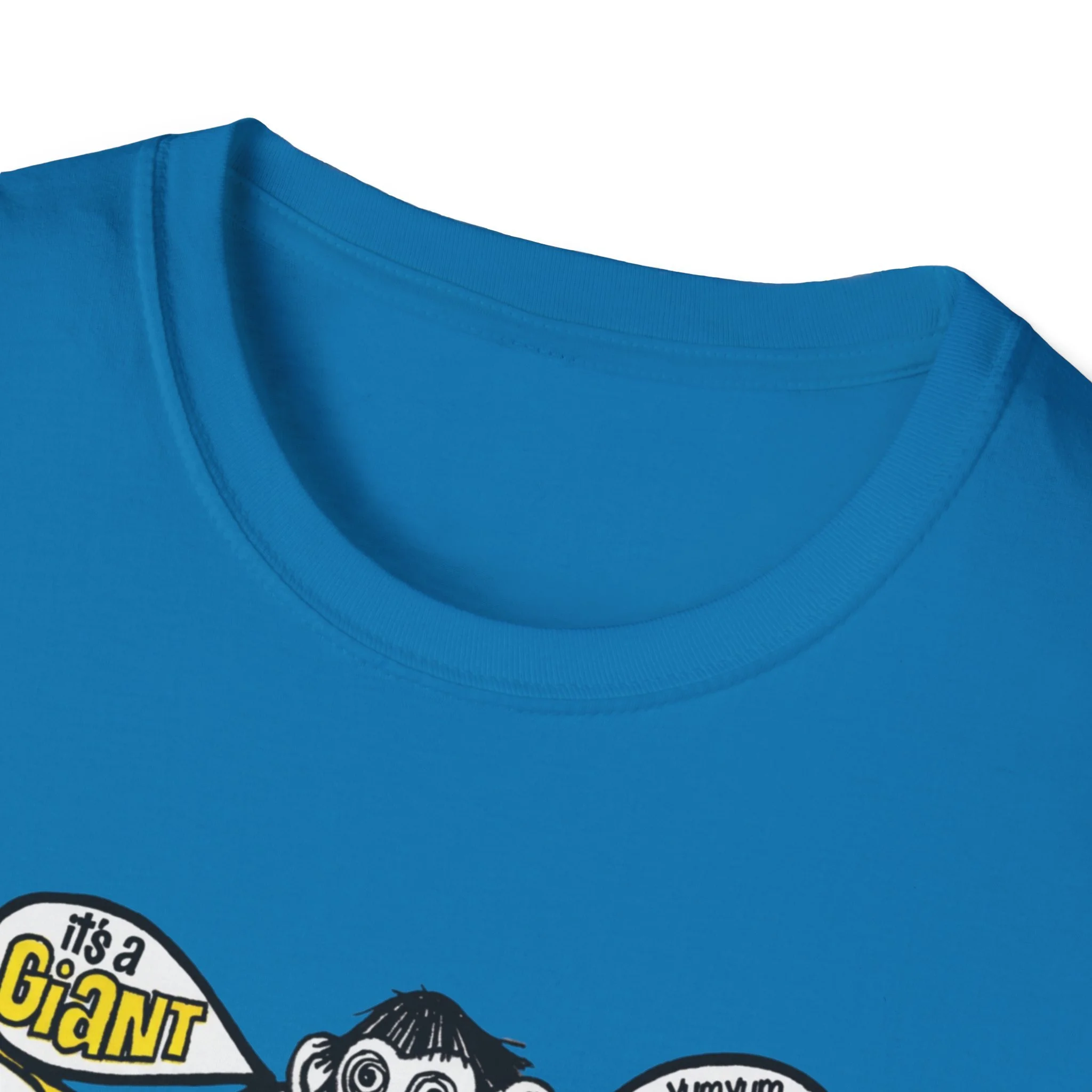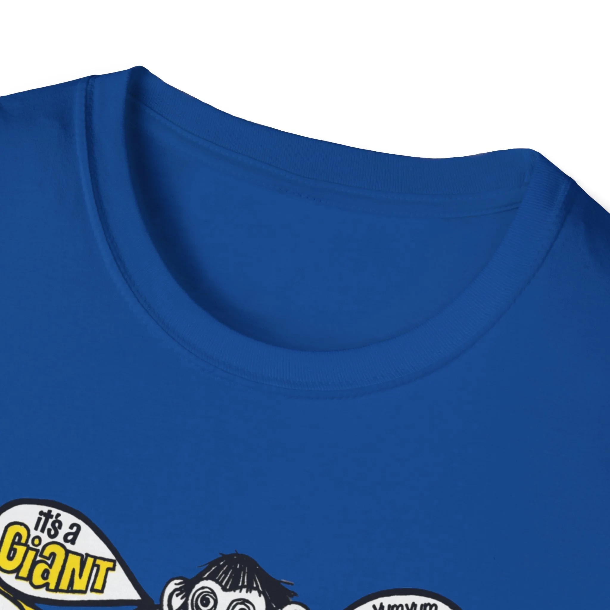 Peel back the good times! Remember the absolute thrill of spotting that giant banana-shaped pack of Big BaNaNa bubble gum on the candy rack? With its cheeky monkey mascot peeking out, tongue out, and those hilarious speech bubbles promising “It’s a Giant” and “Jumpin’ Sweet! Juicy!”, this was the king of sugar-sweet, stretchy bubble gum that delivered pure fruity fun in every stick. This vibrant retro tee faithfully recreates the classic packaging in all its bold yellow, blue, and white glory — the big curved banana, the playful monkey, and the proud “sugar-sweet bubble gum” banner. It’s pure penny-candy nostalgia that instantly transports you back to the corner store, baseball card trades, and epic bubble-blowing contests. Soft, comfortable, and built for everyday wear (or your next gum-chewing marathon), this shirt is perfect for: