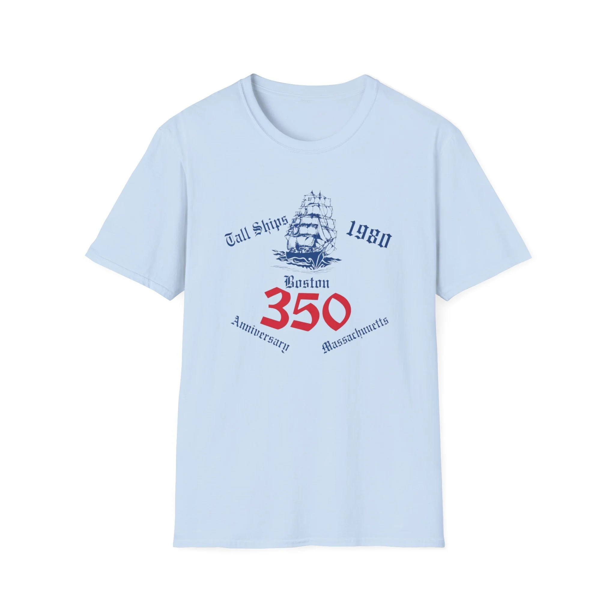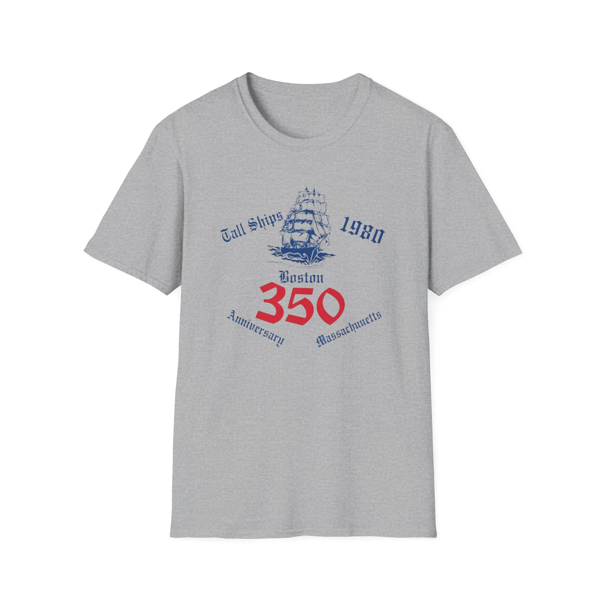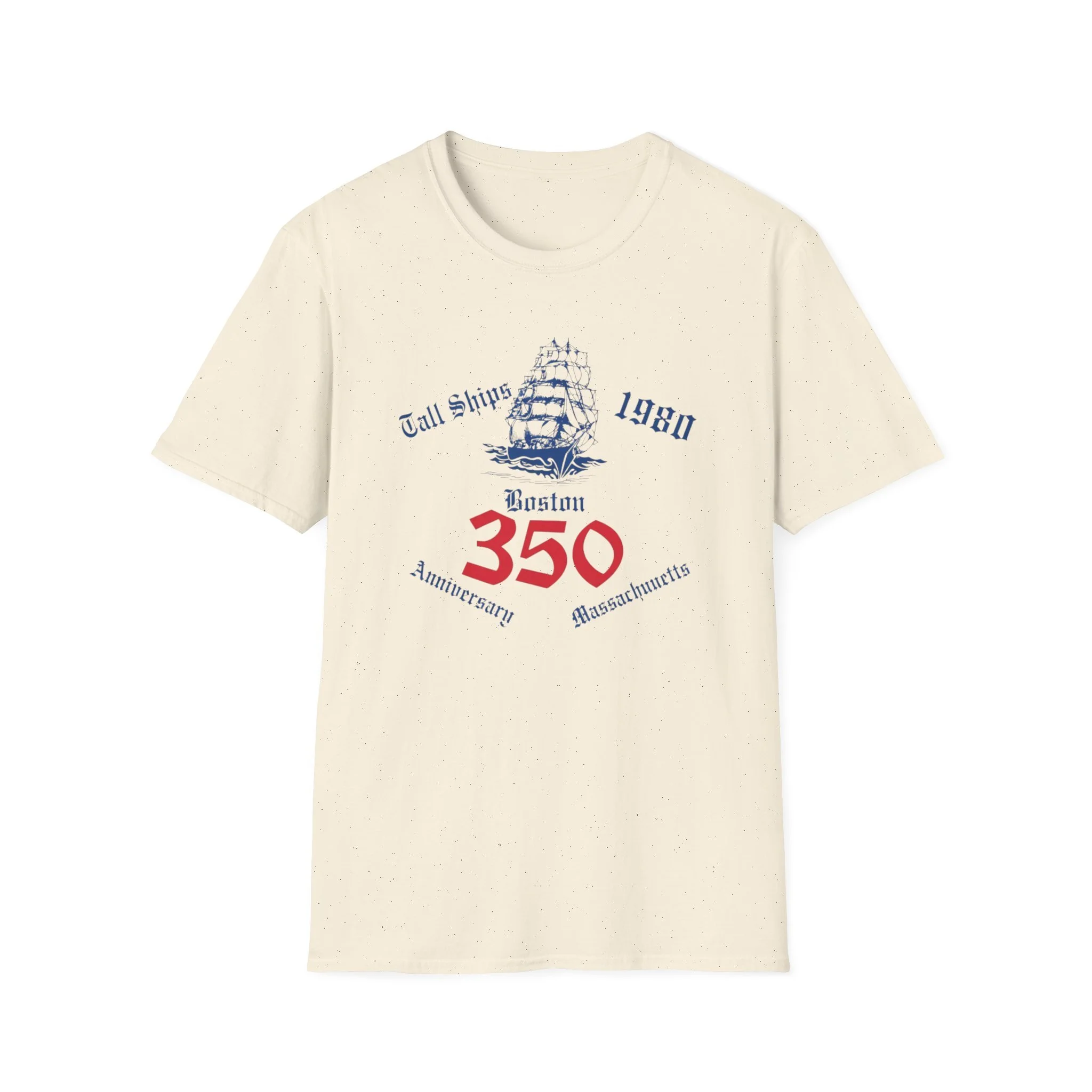 In 1980, Boston proudly celebrated its 350th anniversary with one of the most spectacular maritime events the city had ever seen — the Tall Ships 1980 gathering. As part of the international Operation Sail flotilla, dozens of majestic tall ships sailed into Boston Harbor, creating a breathtaking parade of sail that drew massive crowds to the waterfront. The event honored Boston’s rich seafaring history while marking the city’s milestone anniversary with fireworks, public tours, music, and harborfront festivities that turned the entire waterfront into a living celebration of Massachusetts maritime heritage. This t-shirt revives the classic 1980 Tall Ships / Boston 350 commemorative design with the elegant tall ship illustration, “Tall Ships 1980” arched above, the bold red “350” centerpiece, and “Boston Anniversary Massachusetts” framing the scene. Soft, breathable, and built for everyday wear — perfect for waterfront strolls, summer days in Boston, or proudly repping a piece of the city’s historic 350th anniversary. Wear it and spark those “I saw the tall ships in Boston Harbor in 1980!” stories from anyone who witnessed the majestic fleet or joined the waterfront celebrations that year.
