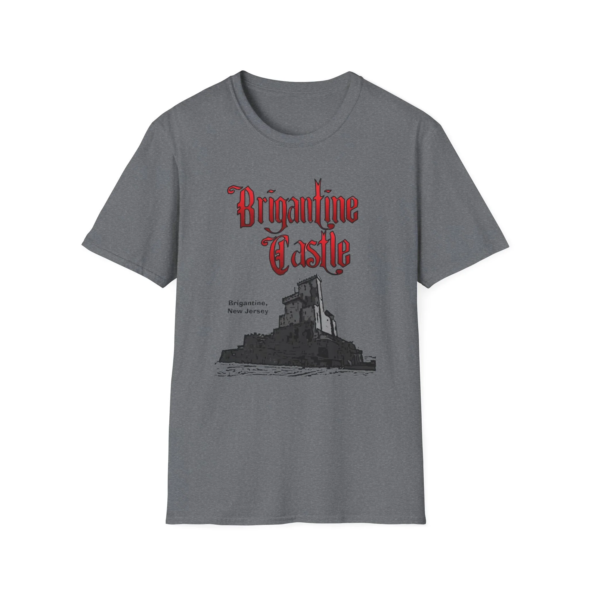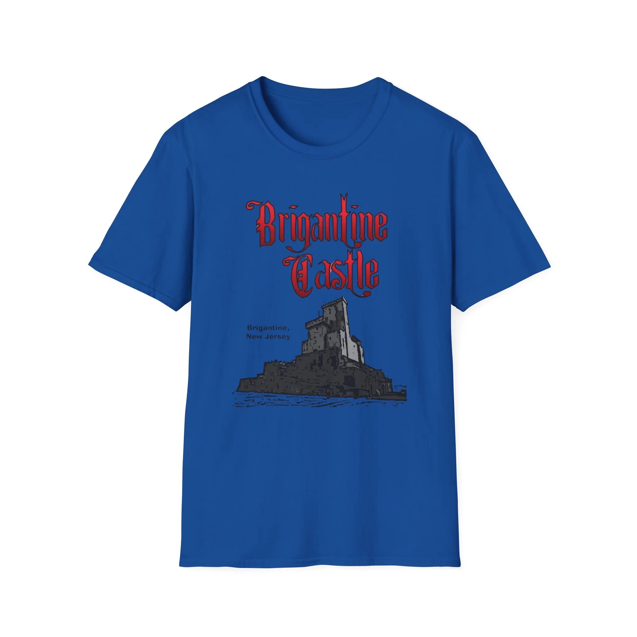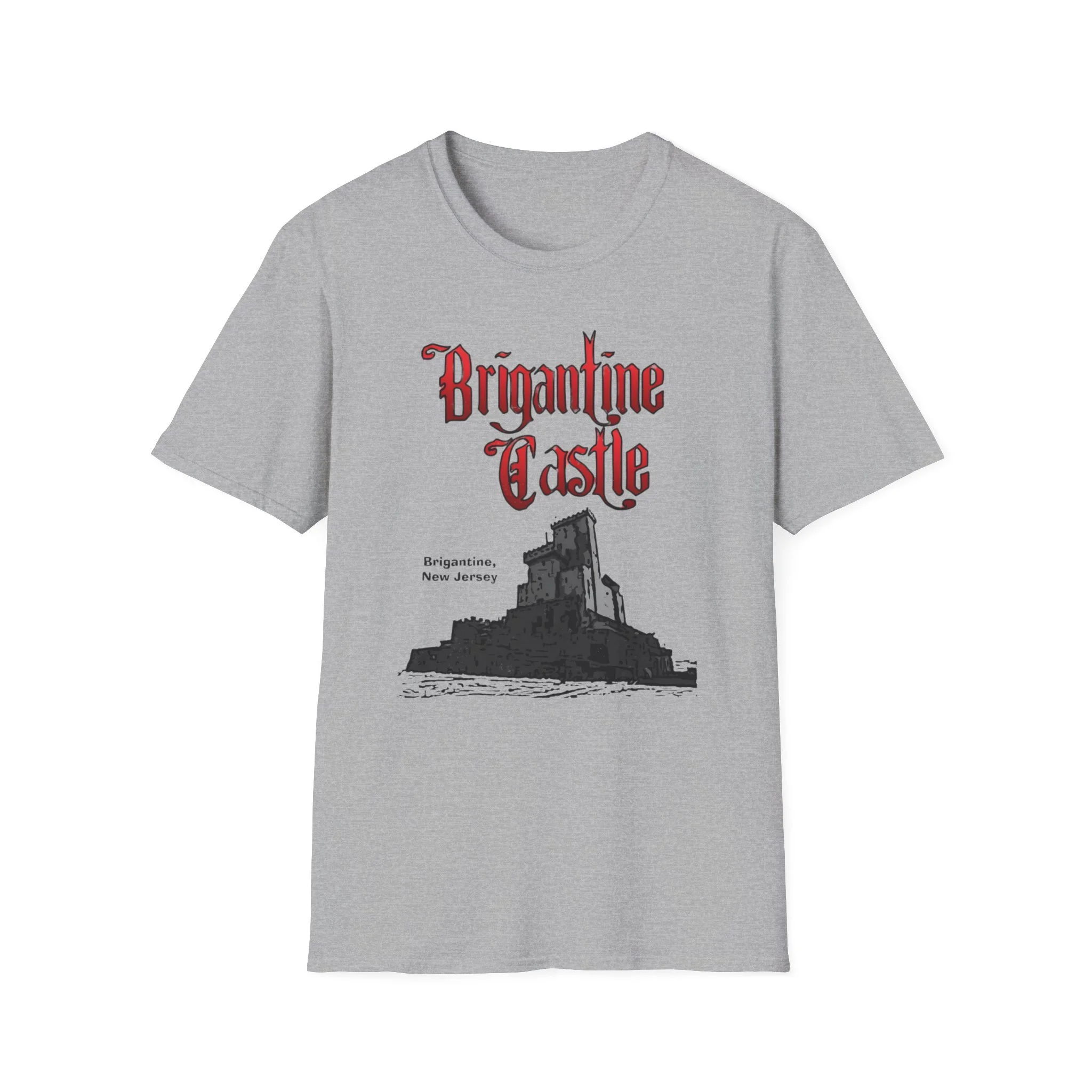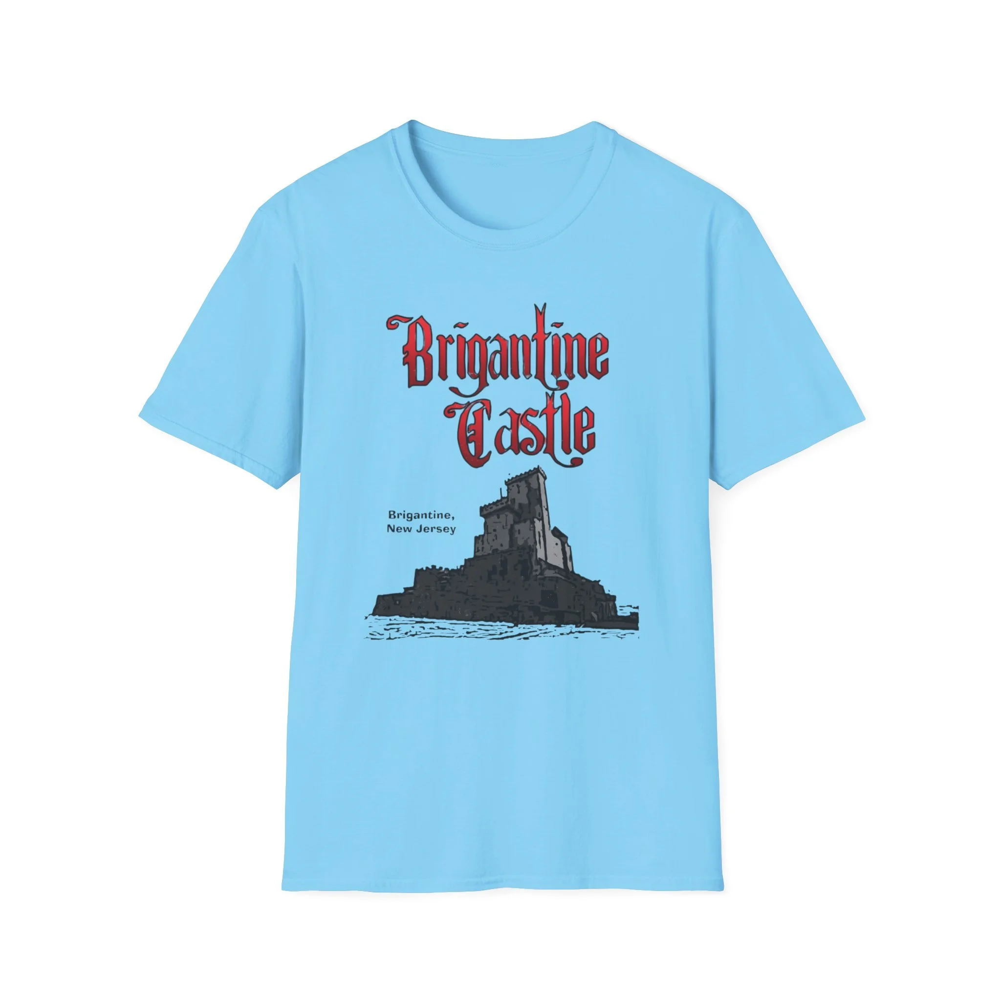 Perched right on the beach in Brigantine, New Jersey, Brigantine Castle was one of the wildest and most memorable haunted attractions on the Jersey Shore. Opened in the mid-1970s, this towering gothic castle delivered chills and thrills with its dark corridors, live actors, animatronics, fog machines, and over-the-top horror effects. For nearly two decades, families and thrill-seekers braved the haunted halls, screaming their way through the dungeon, graveyard, and twisting passages before emerging back into the bright Atlantic City-area sunlight. It became a true seasonal landmark for anyone looking for something scarier than standard boardwalk rides. This t-shirt brings the classic Brigantine Castle back to life with the bold, gothic red “Brigantine Castle” lettering and the detailed illustration of the dark, foreboding castle rising from the water. Soft, breathable, and built for everyday wear — perfect for summer nights on the Shore, Halloween season, or just repping one of New Jersey’s most unforgettable lost attractions. Wear it and spark those “I remember getting scared out of my mind at Brigantine Castle!” stories from anyone who ever dared to enter the castle on Brigantine Beach.