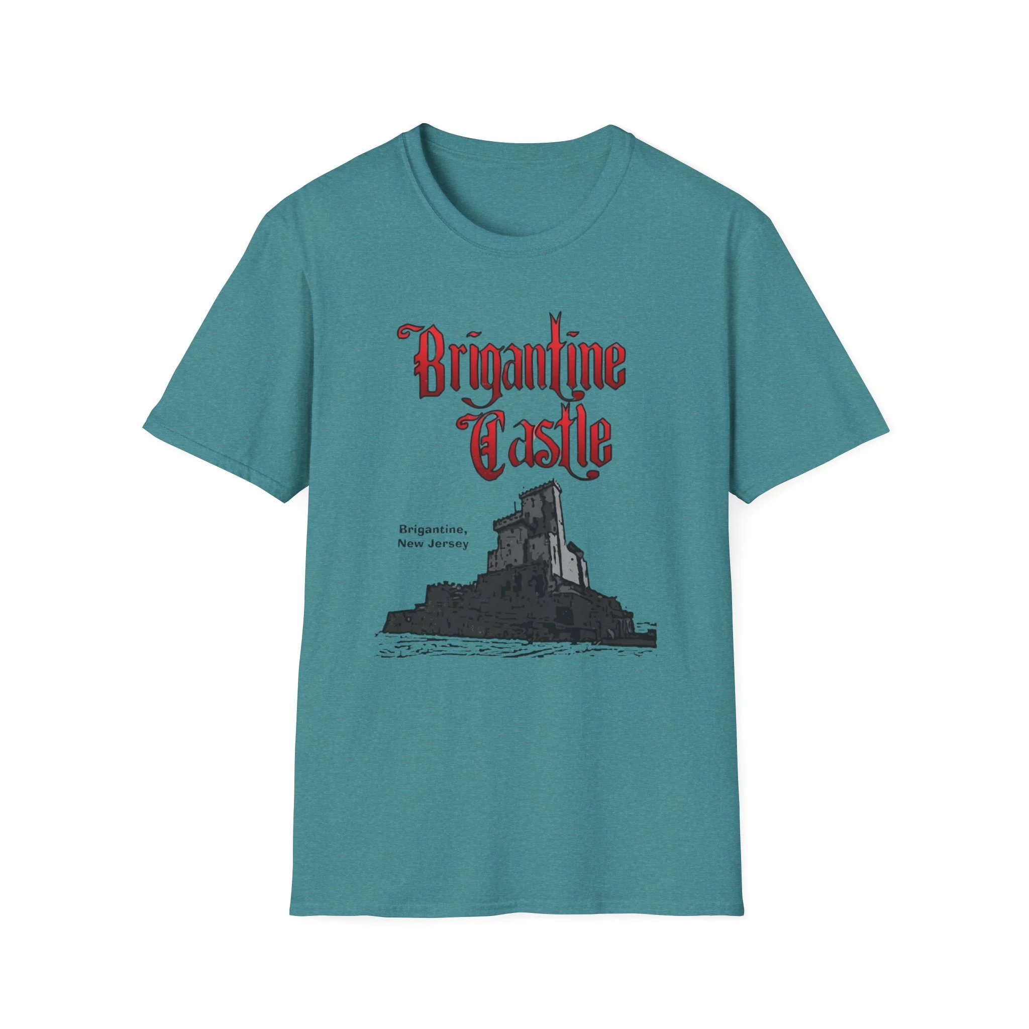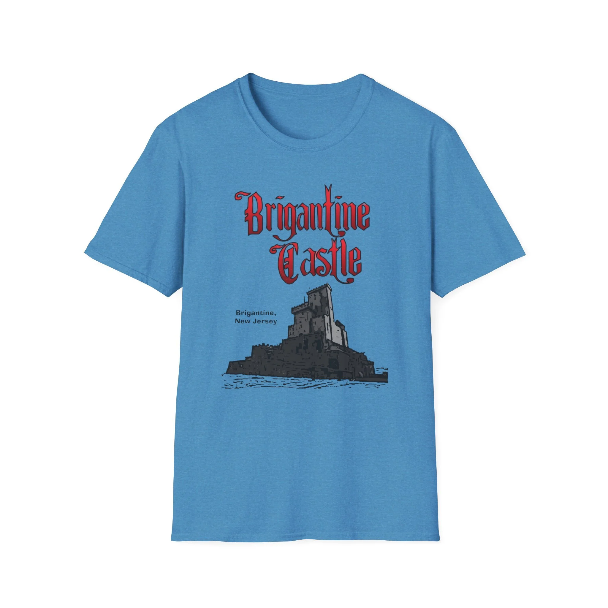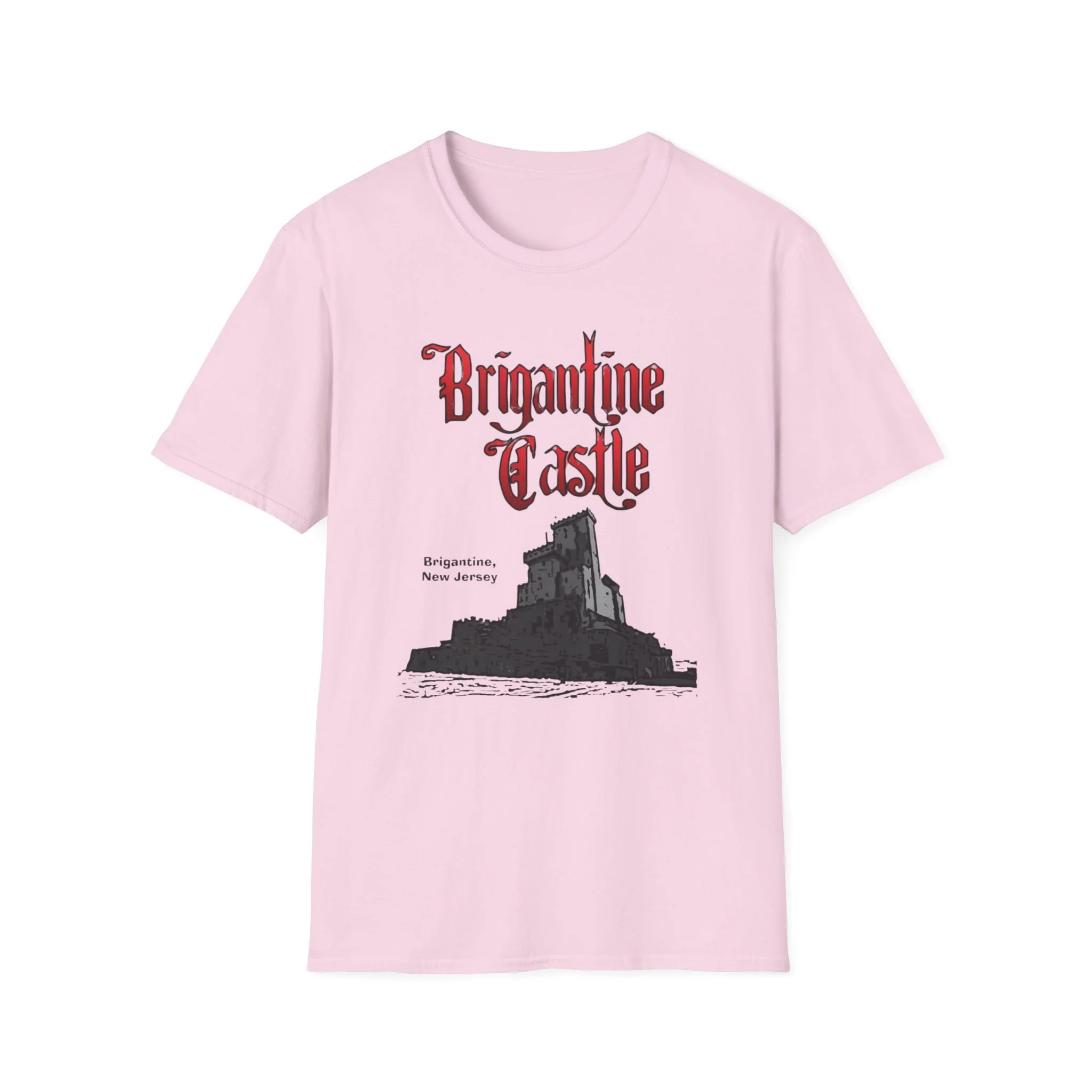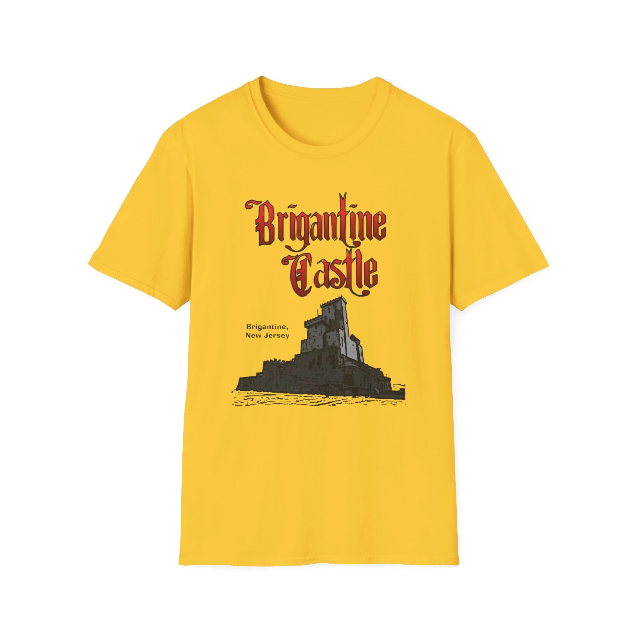 Perched right on the beach in Brigantine, New Jersey, Brigantine Castle was one of the wildest and most memorable haunted attractions on the Jersey Shore. Opened in the mid-1970s, this towering gothic castle delivered chills and thrills with its dark corridors, live actors, animatronics, fog machines, and over-the-top horror effects. For nearly two decades, families and thrill-seekers braved the haunted halls, screaming their way through the dungeon, graveyard, and twisting passages before emerging back into the bright Atlantic City-area sunlight. It became a true seasonal landmark for anyone looking for something scarier than standard boardwalk rides. This t-shirt brings the classic Brigantine Castle back to life with the bold, gothic red “Brigantine Castle” lettering and the detailed illustration of the dark, foreboding castle rising from the water. Soft, breathable, and built for everyday wear — perfect for summer nights on the Shore, Halloween season, or just repping one of New Jersey’s most unforgettable lost attractions. Wear it and spark those “I remember getting scared out of my mind at Brigantine Castle!” stories from anyone who ever dared to enter the castle on Brigantine Beach.