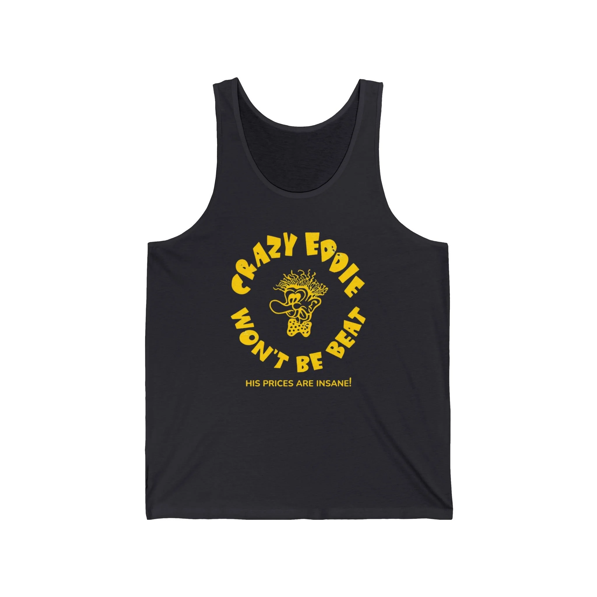 Attention, shoppers! From the 1970s through the 1980s, Crazy Eddie was the wildest, loudest electronics chain in the Northeast. With its manic TV commercials, over-the-top prices, and that unforgettable slogan screamed by the wild-haired character — “Crazy Eddie! His prices are INSAAAANE!” — the store became a cultural phenomenon across New York, New Jersey, Connecticut, and Pennsylvania. The grinning, bug-eyed mascot and the classic circular logo with “CRAZY EDDIE WON’T BE BEAT!” captured the chaotic, fun energy of pre-big-box retail. This bold black tank brings the insanity back with the full retro logo: the crazy-haired mascot front and center, “CRAZY EDDIE” arched above, “WON’T BE BEAT” below, and the perfect kicker “HIS PRICES ARE INSANE!” at the bottom. Lightweight and breathable for summer days, perfect for repping one of the Northeast’s most legendary (and infamous) retail stories. Wear it loud and watch the “His prices are insane!” stories come pouring in from anyone who grew up hearing those commercials on repeat.