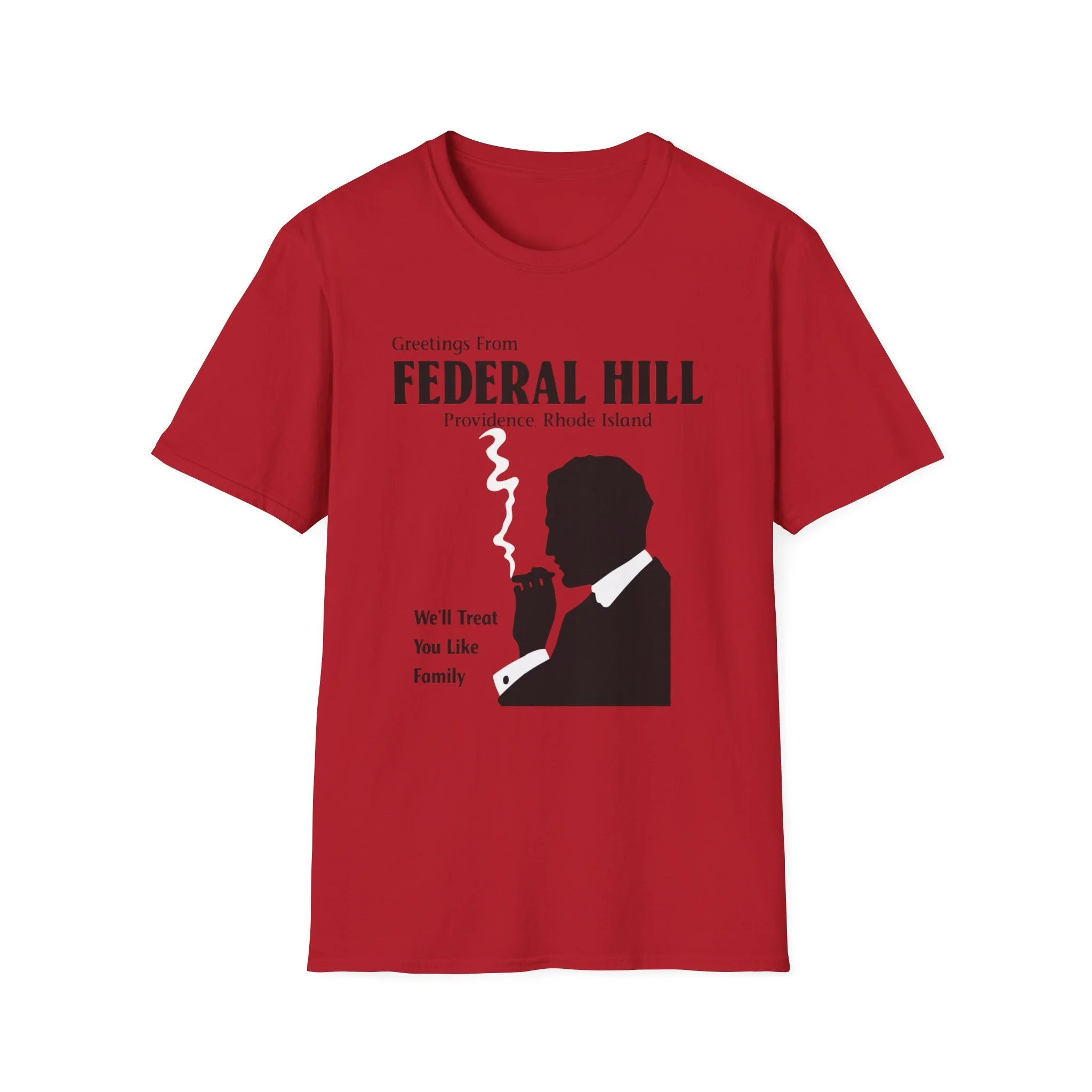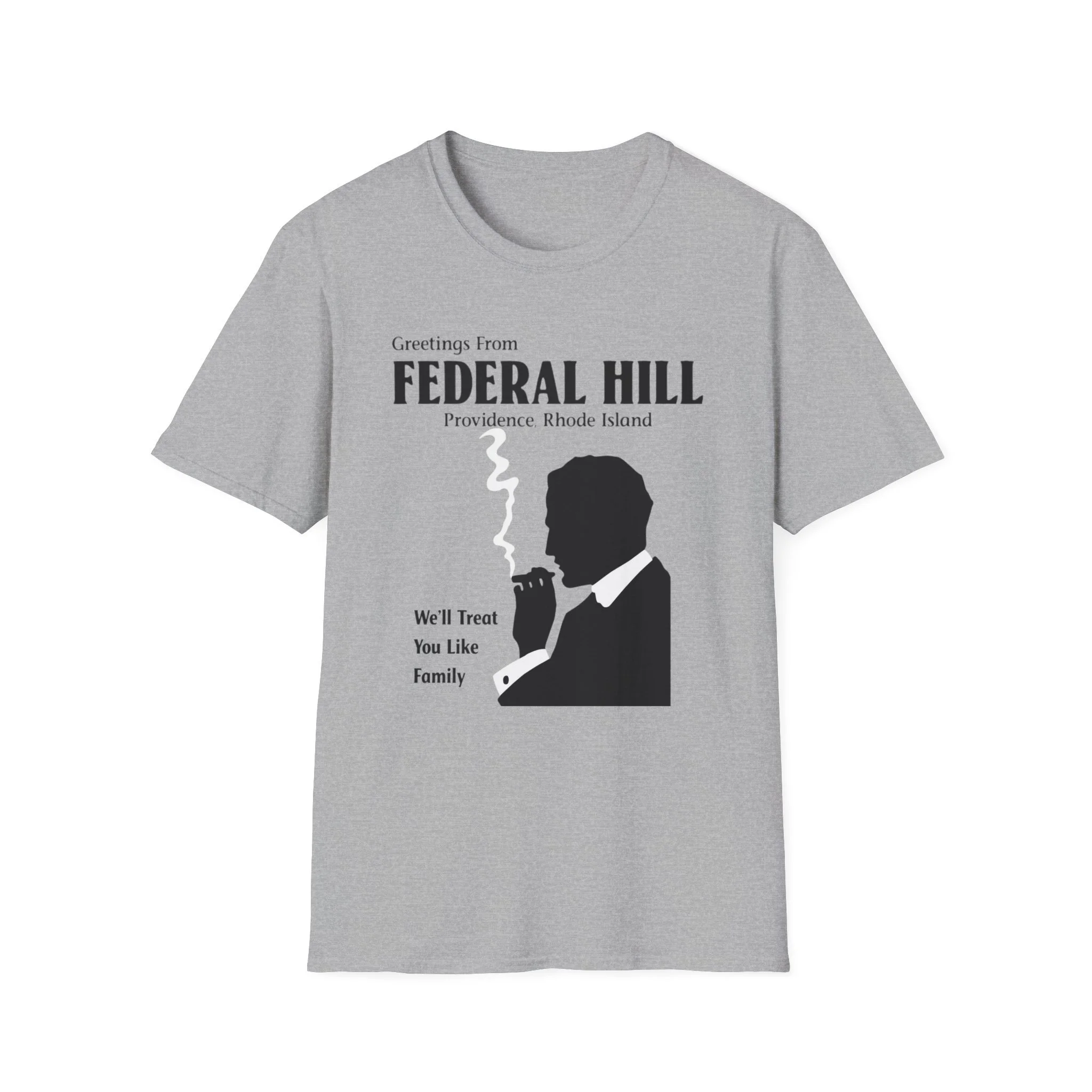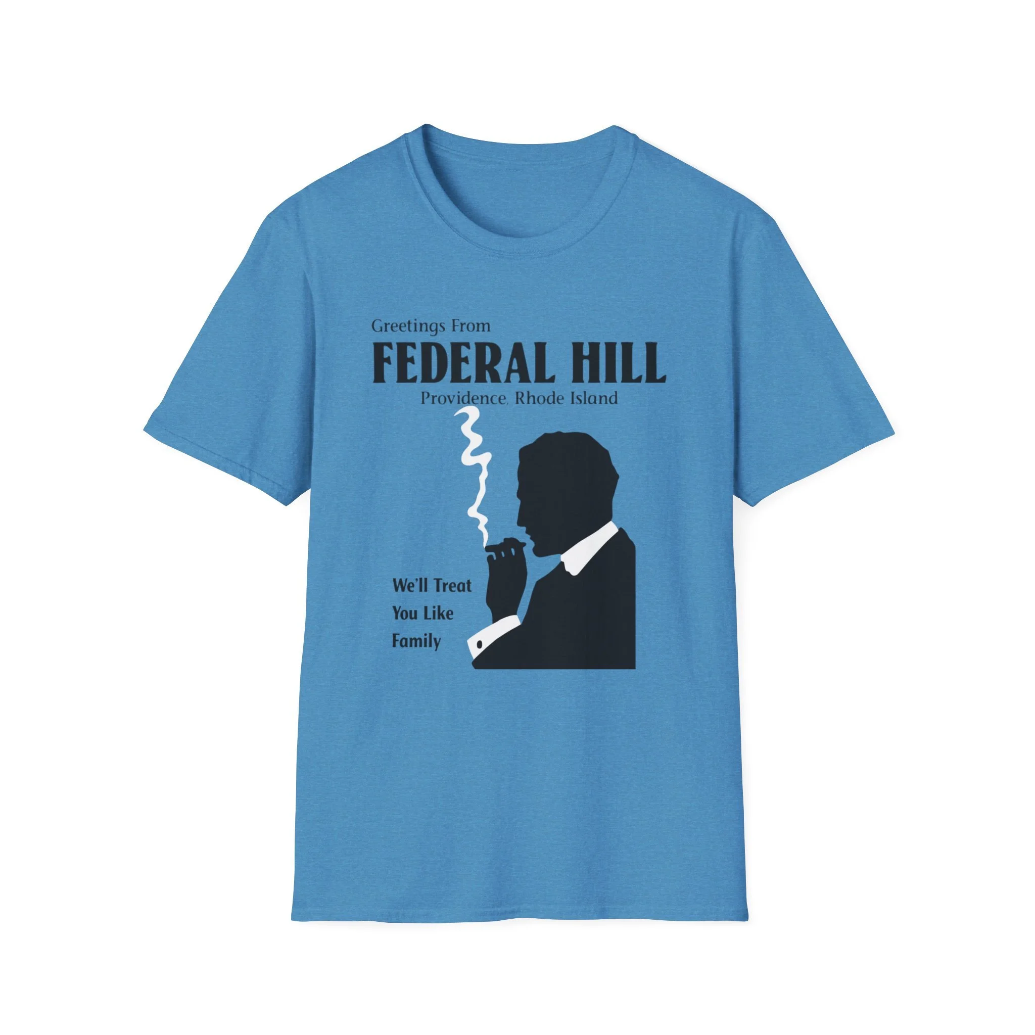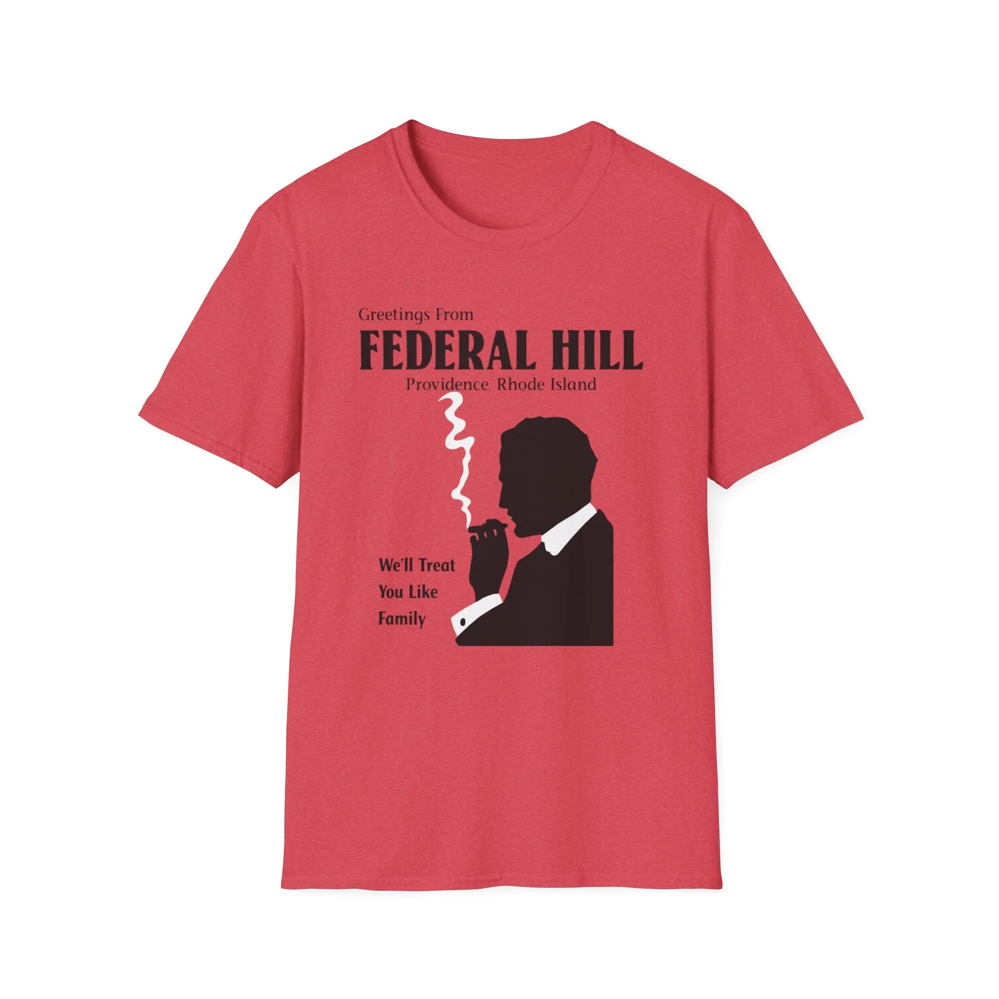 “Greetings From FEDERAL HILL – Providence, Rhode Island” and the promise “We’ll Treat You Like Family” perfectly captured the warm, no-nonsense spirit of Federal Hill. For generations, this historic Italian neighborhood has been the heart of Providence’s Italian-American community — known for its authentic restaurants, old-world bakeries, family-run markets, and that unmistakable sense of belonging. The bold silhouette of the cigar-smoking man in a suit became an iconic symbol of the neighborhood’s strong, welcoming (and sometimes protective) character. This t-shirt brings the classic Federal Hill vibe back to life with the retro postcard-style lettering, the striking black silhouette with rising cigar smoke, and the heartfelt tagline that still rings true today. Soft, breathable, and built for everyday wear — perfect for Providence locals, former residents, Italian-American pride, or anyone who loves the rich history and food culture of Federal Hill. Wear it and spark those “We’ll treat you like family!” stories from anyone who’s ever eaten on Atwells Avenue or felt the unique energy of Providence’s most famous neighborhood.