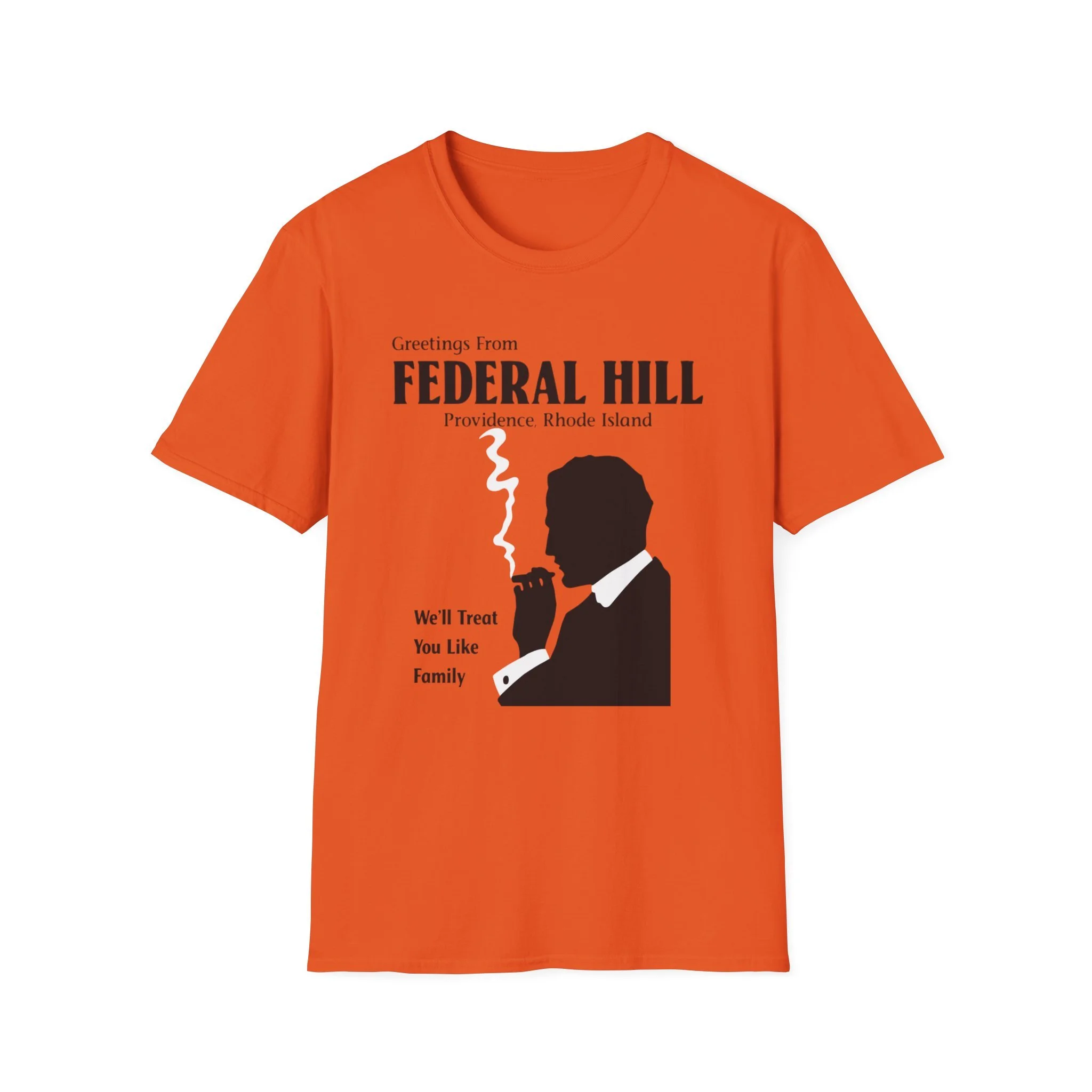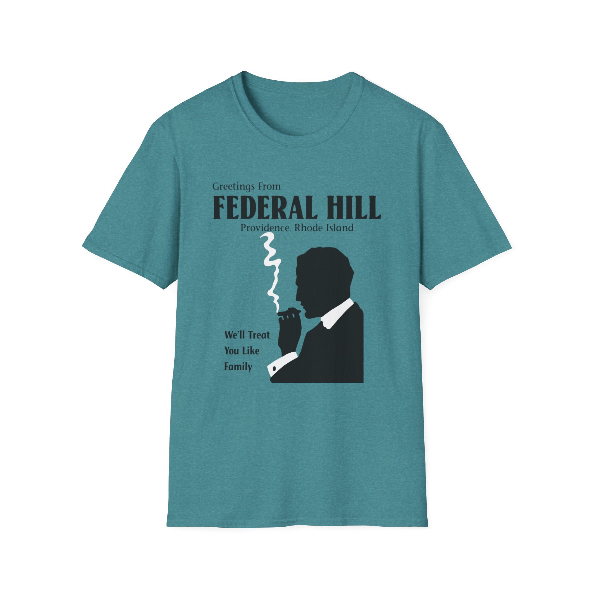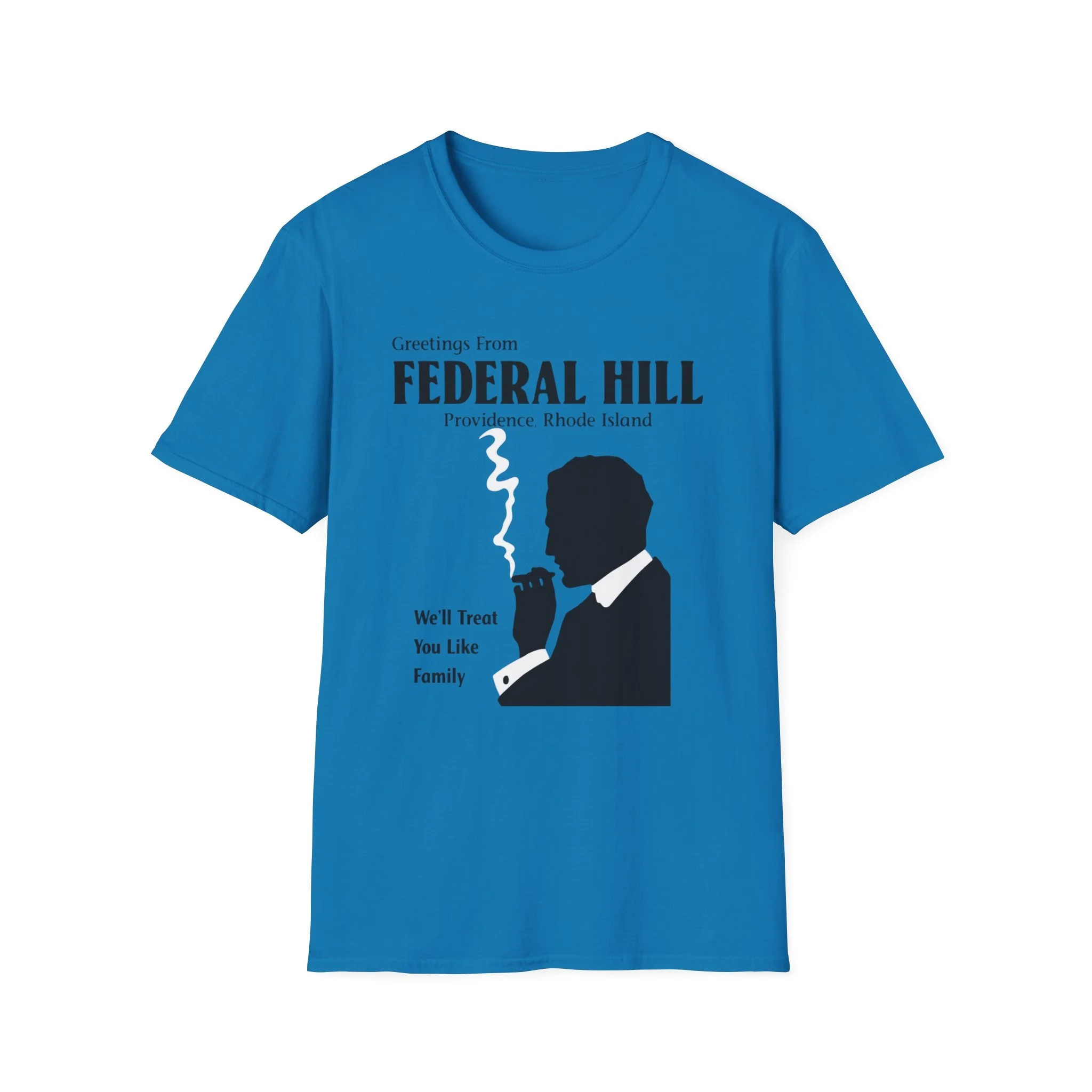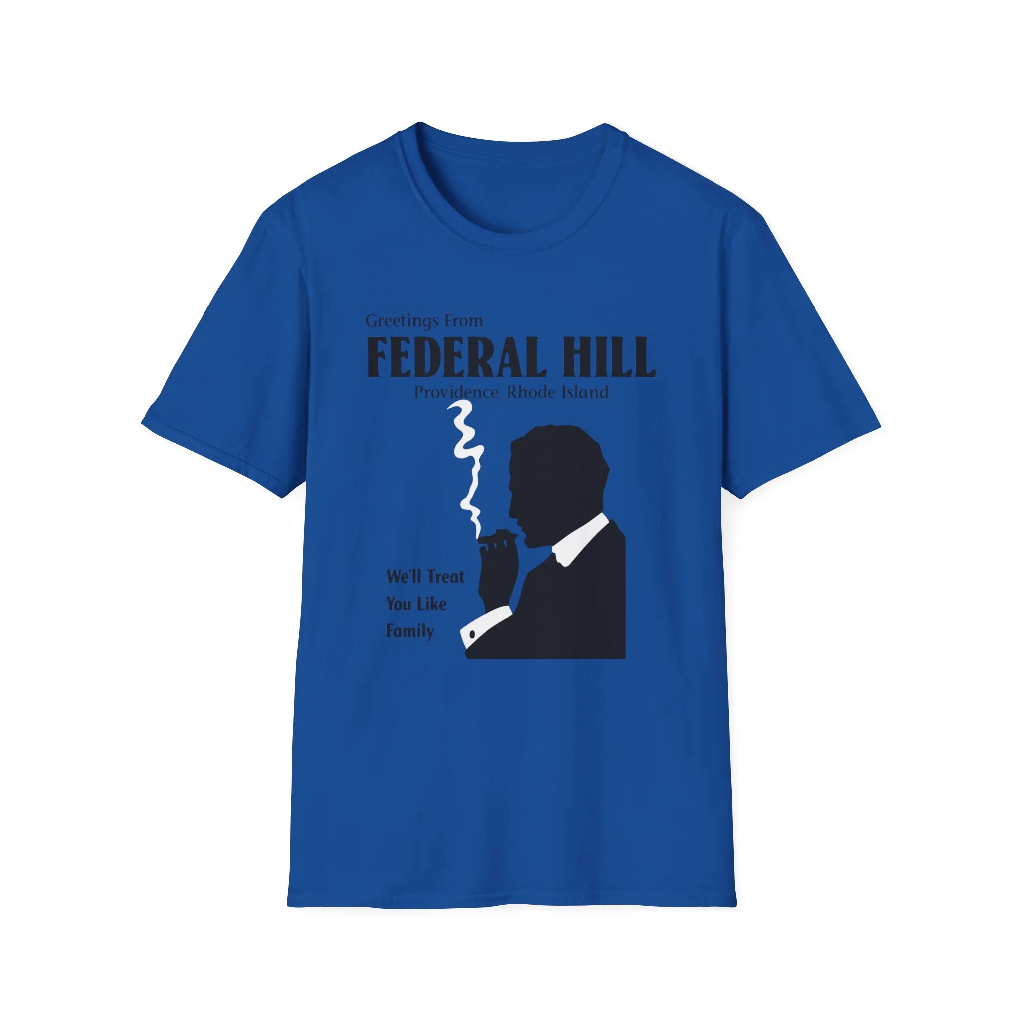“Greetings From FEDERAL HILL – Providence, Rhode Island” and the promise “We’ll Treat You Like Family” perfectly captured the warm, no-nonsense spirit of Federal Hill. For generations, this historic Italian neighborhood has been the heart of Providence’s Italian-American community — known for its authentic restaurants, old-world bakeries, family-run markets, and that unmistakable sense of belonging. The bold silhouette of the cigar-smoking man in a suit became an iconic symbol of the neighborhood’s strong, welcoming (and sometimes protective) character. This t-shirt brings the classic Federal Hill vibe back to life with the retro postcard-style lettering, the striking black silhouette with rising cigar smoke, and the heartfelt tagline that still rings true today. Soft, breathable, and built for everyday wear — perfect for Providence locals, former residents, Italian-American pride, or anyone who loves the rich history and food culture of Federal Hill. Wear it and spark those “We’ll treat you like family!” stories from anyone who’s ever eaten on Atwells Avenue or felt the unique energy of Providence’s most famous neighborhood.