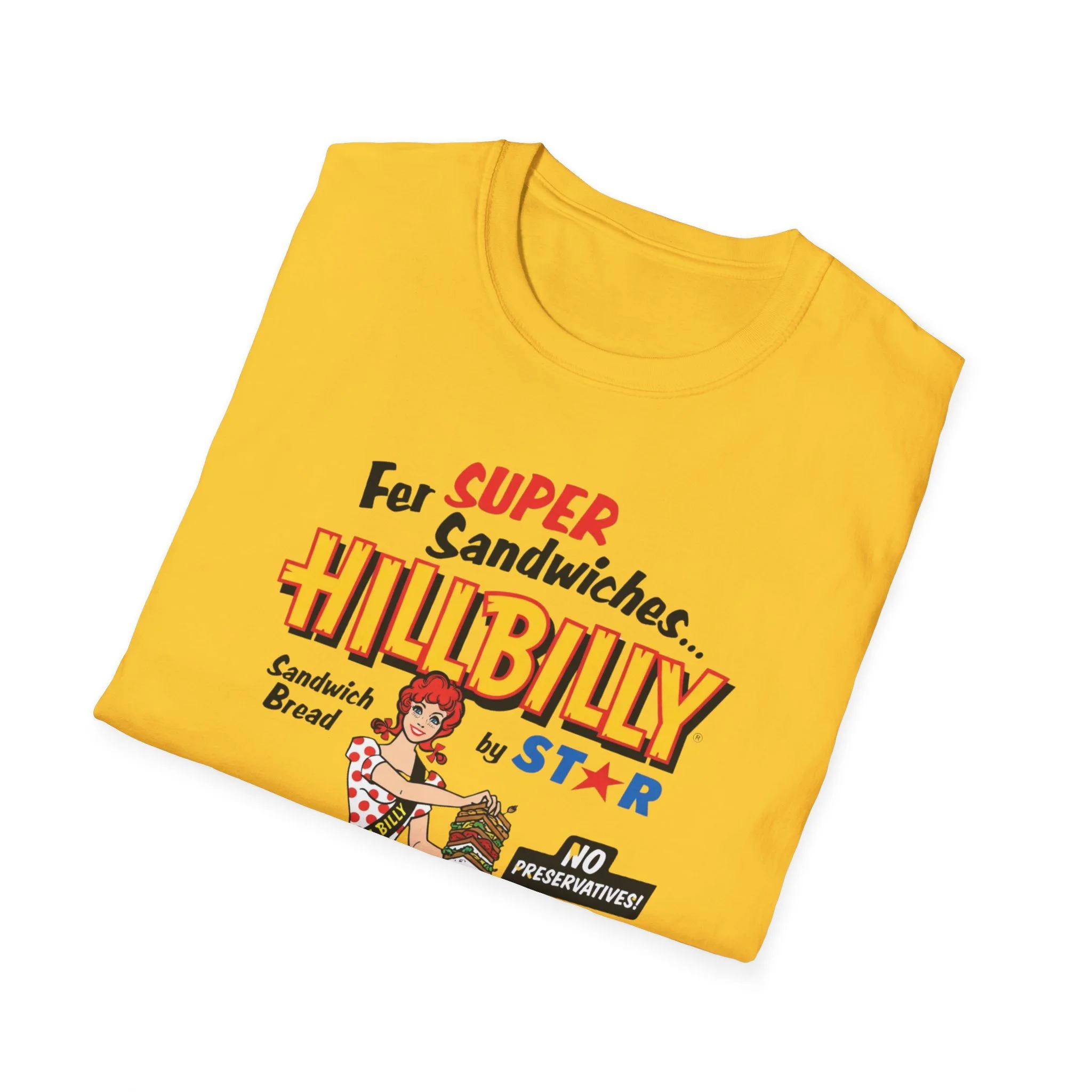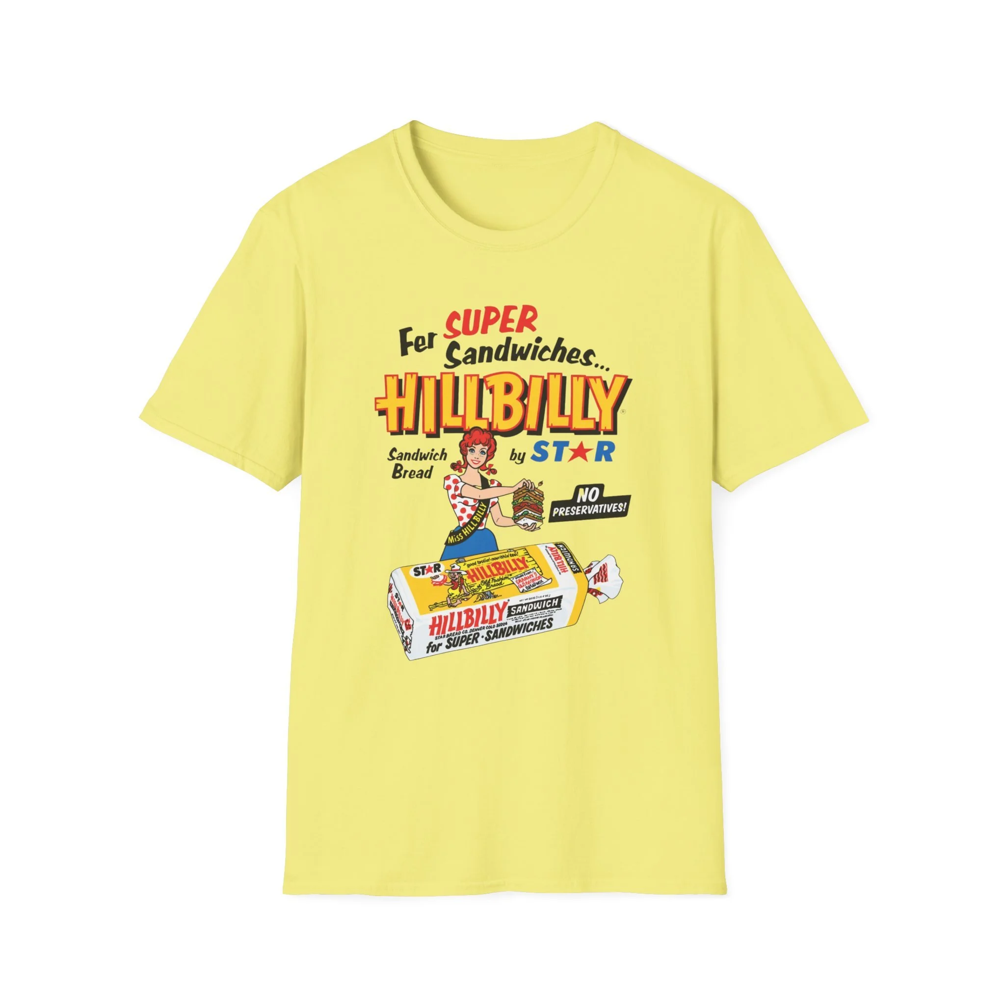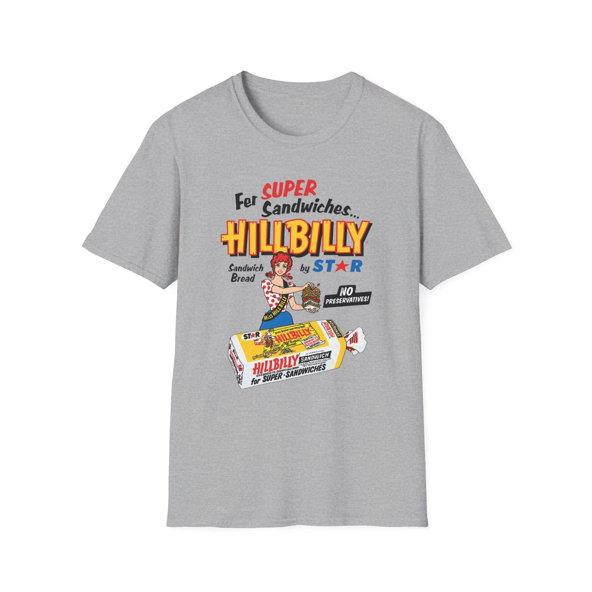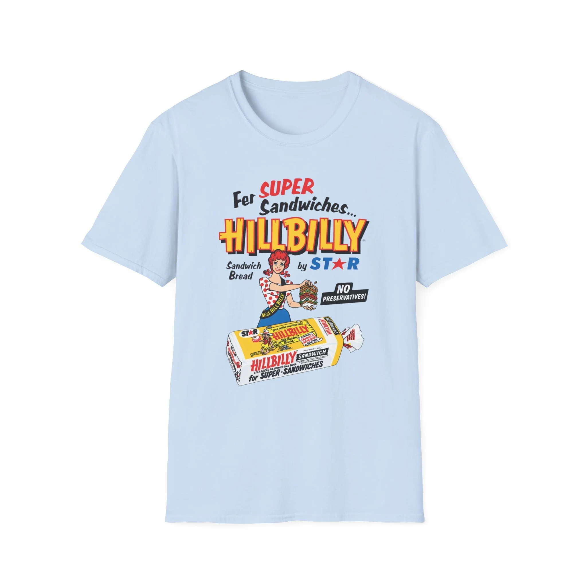 For decades, Hillbilly Sandwich Bread by Star was a beloved staple on supermarket shelves across New England and the Northeast. With its bright, eye-catching packaging featuring the cheerful “Miss Hillbilly” character proudly holding a towering sandwich stack and the bold slogan “For Super Sandwiches… HILLBILLY Sandwich Bread” plus the memorable “NO PRESERVATIVES!” promise, this bread became a go-to favorite for school lunches, picnics, and family sandwiches. The fun, retro branding and catchy name made it stand out in the bread aisle and created countless nostalgic memories for anyone who grew up grabbing a loaf at the local store. This t-shirt brings the classic Hillbilly Sandwich Bread packaging back to life with the full colorful logo, “Miss Hillbilly” illustration, the giant sandwich, the loaf graphic, and all the original slogans including “For Super Sandwiches…” and “NO PRESERVATIVES!” Soft, breathable, and built for everyday wear — perfect for grocery nostalgia lovers, former regulars, or anyone who still smiles when they think of that iconic bread. Wear it and spark those “We always had Hillbilly bread in the house!” stories from anyone who remembers the fun packaging and fresh sandwich taste from the old days.