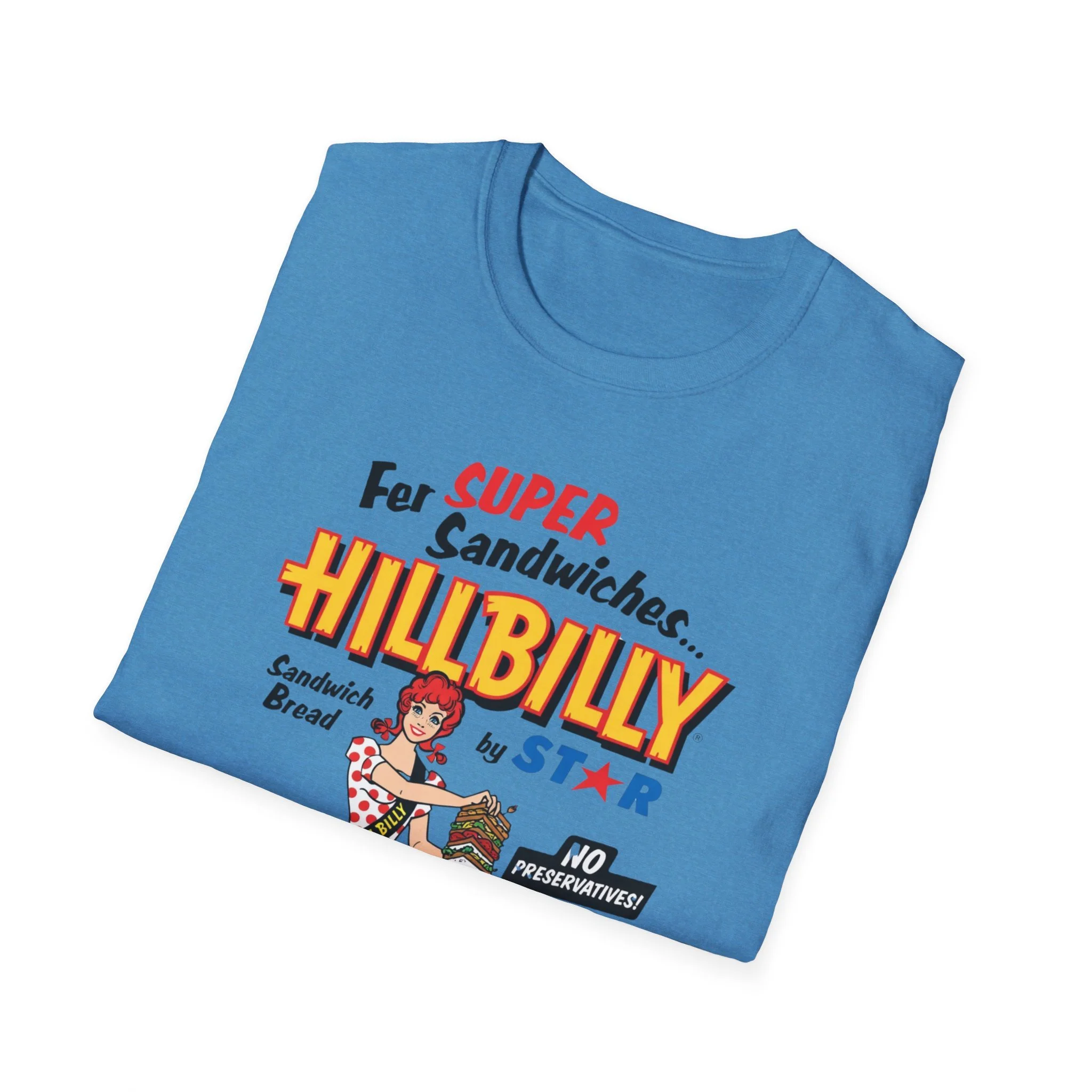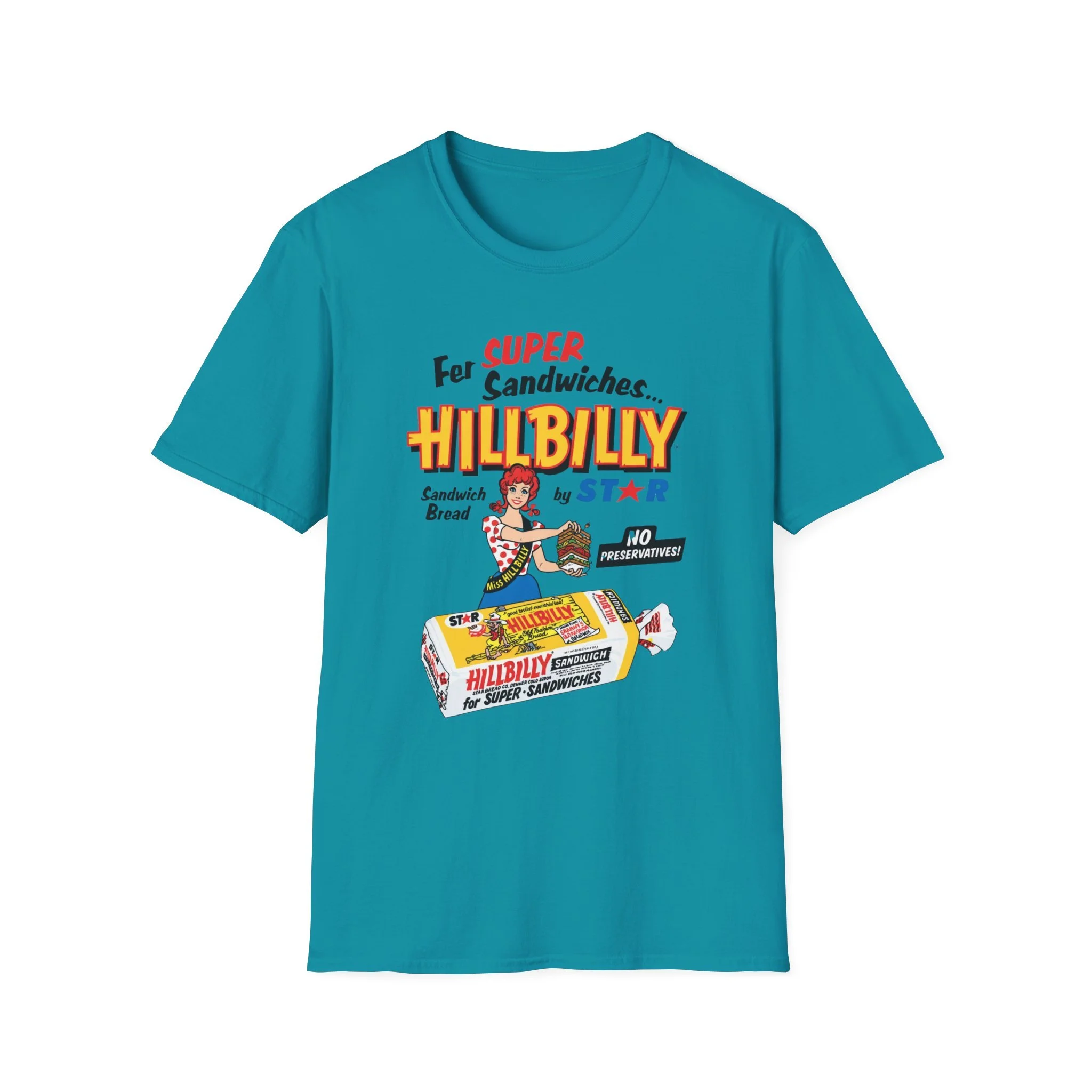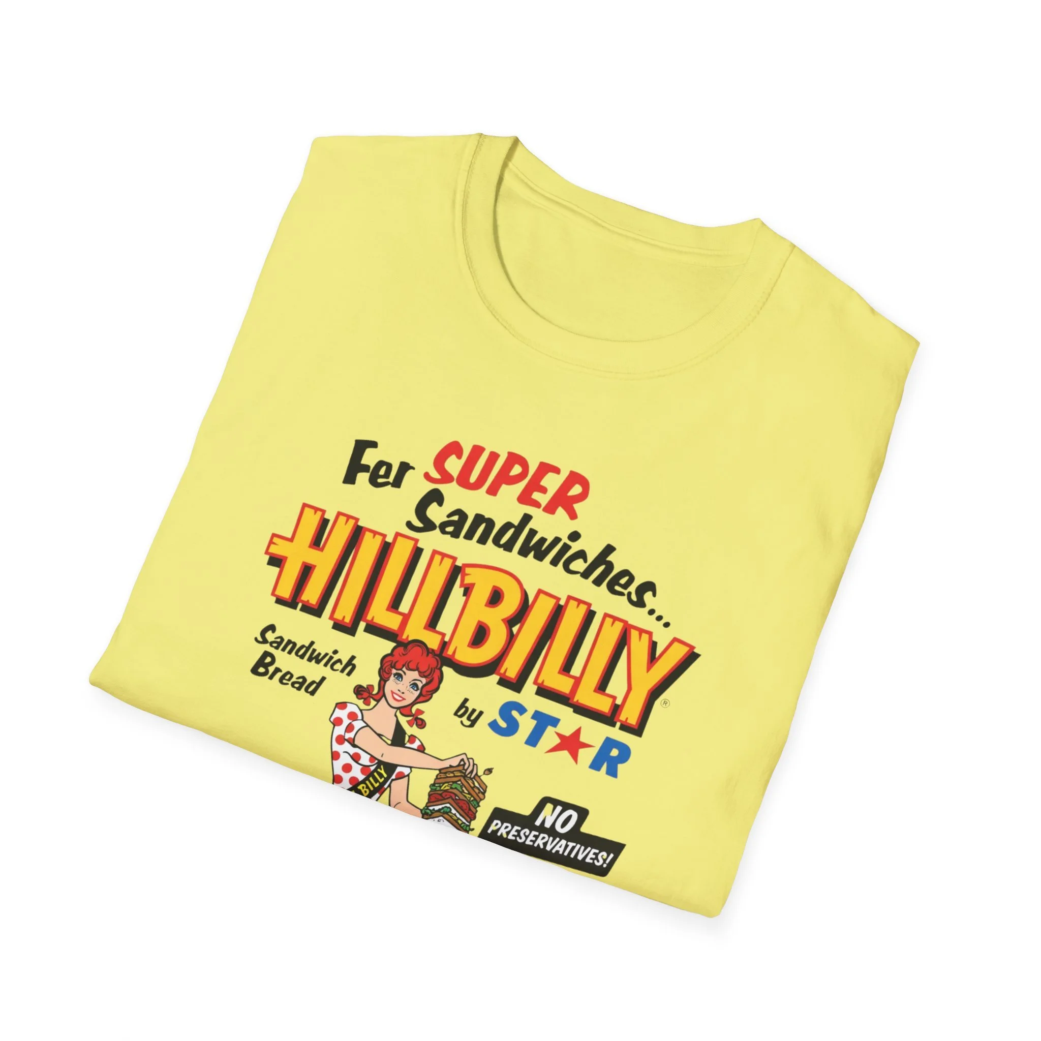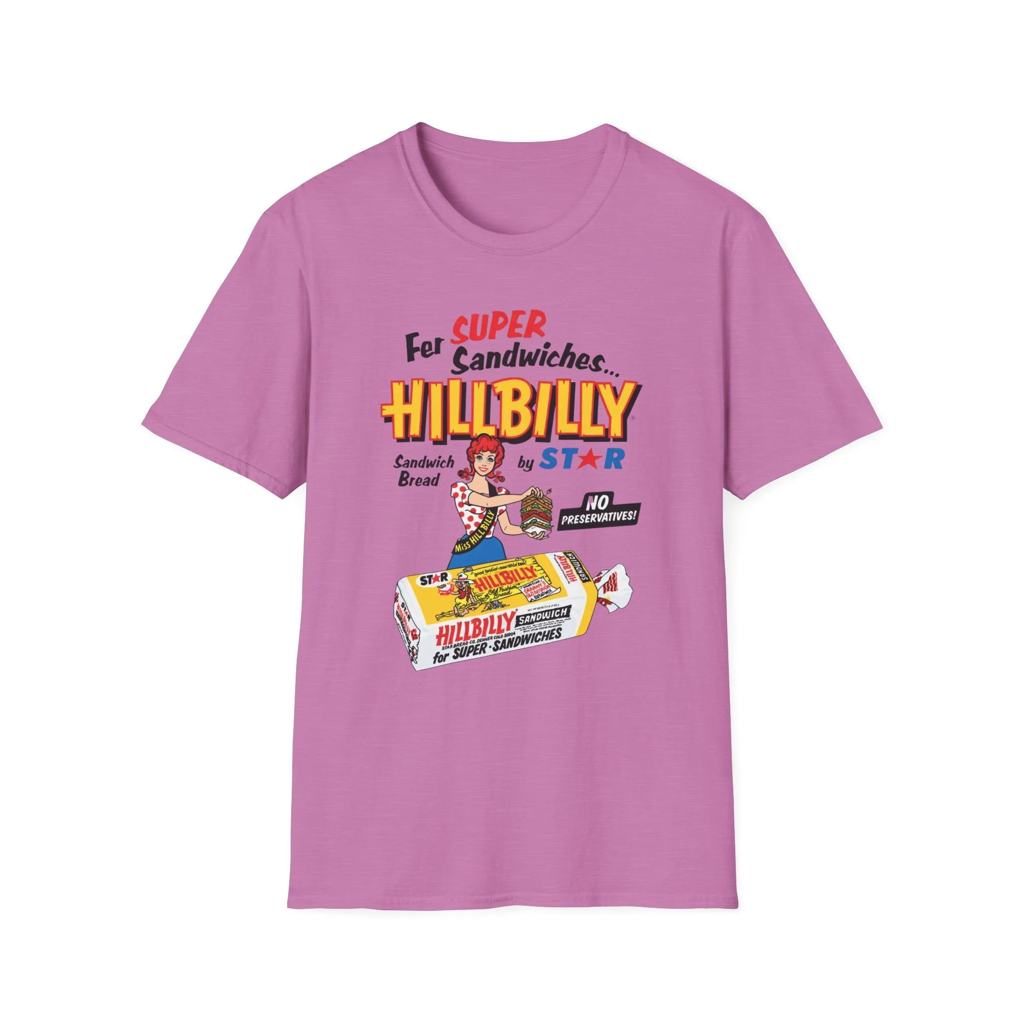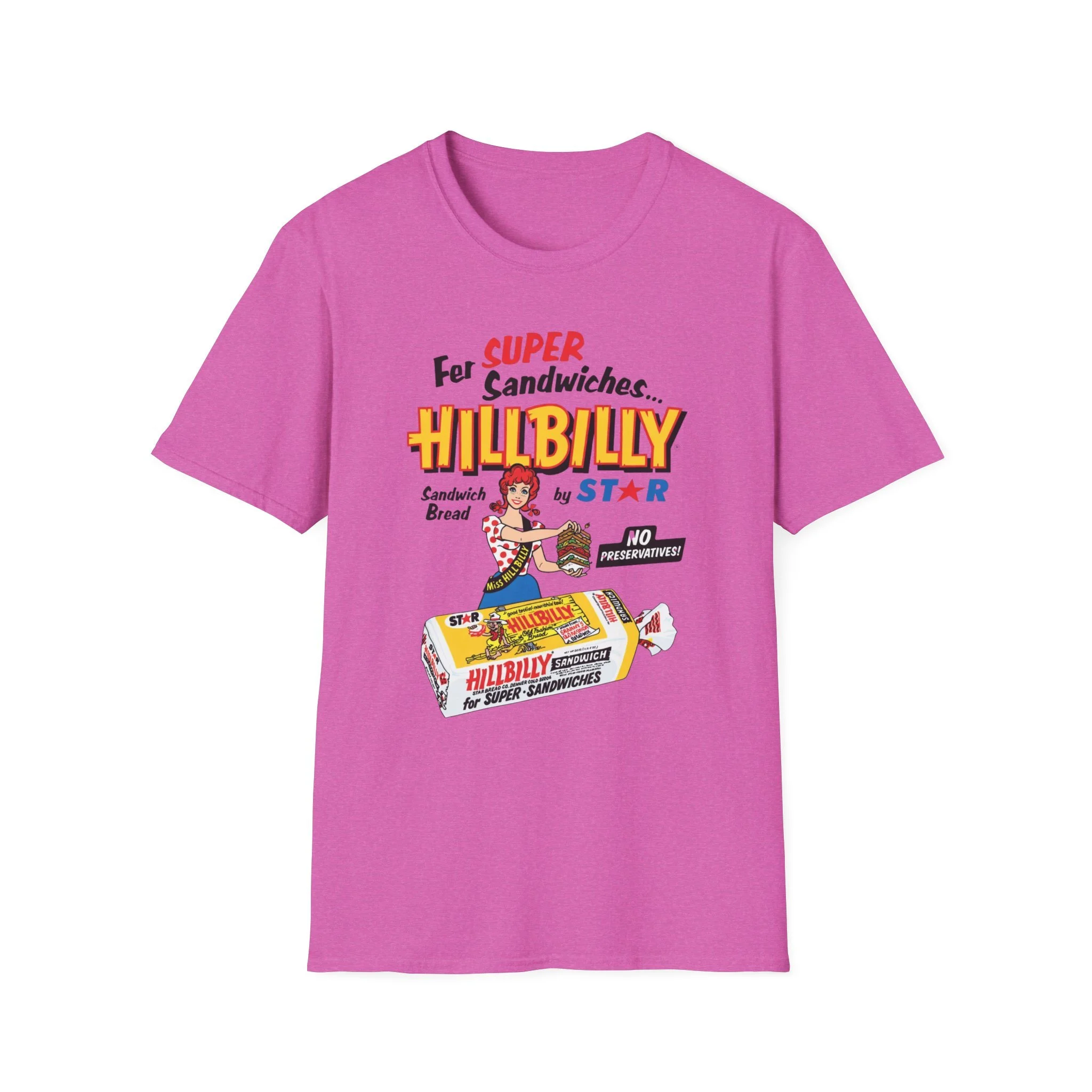 For decades, Hillbilly Sandwich Bread by Star was a beloved staple on supermarket shelves across New England and the Northeast. With its bright, eye-catching packaging featuring the cheerful “Miss Hillbilly” character proudly holding a towering sandwich stack and the bold slogan “For Super Sandwiches… HILLBILLY Sandwich Bread” plus the memorable “NO PRESERVATIVES!” promise, this bread became a go-to favorite for school lunches, picnics, and family sandwiches. The fun, retro branding and catchy name made it stand out in the bread aisle and created countless nostalgic memories for anyone who grew up grabbing a loaf at the local store. This t-shirt brings the classic Hillbilly Sandwich Bread packaging back to life with the full colorful logo, “Miss Hillbilly” illustration, the giant sandwich, the loaf graphic, and all the original slogans including “For Super Sandwiches…” and “NO PRESERVATIVES!” Soft, breathable, and built for everyday wear — perfect for grocery nostalgia lovers, former regulars, or anyone who still smiles when they think of that iconic bread. Wear it and spark those “We always had Hillbilly bread in the house!” stories from anyone who remembers the fun packaging and fresh sandwich taste from the old days.