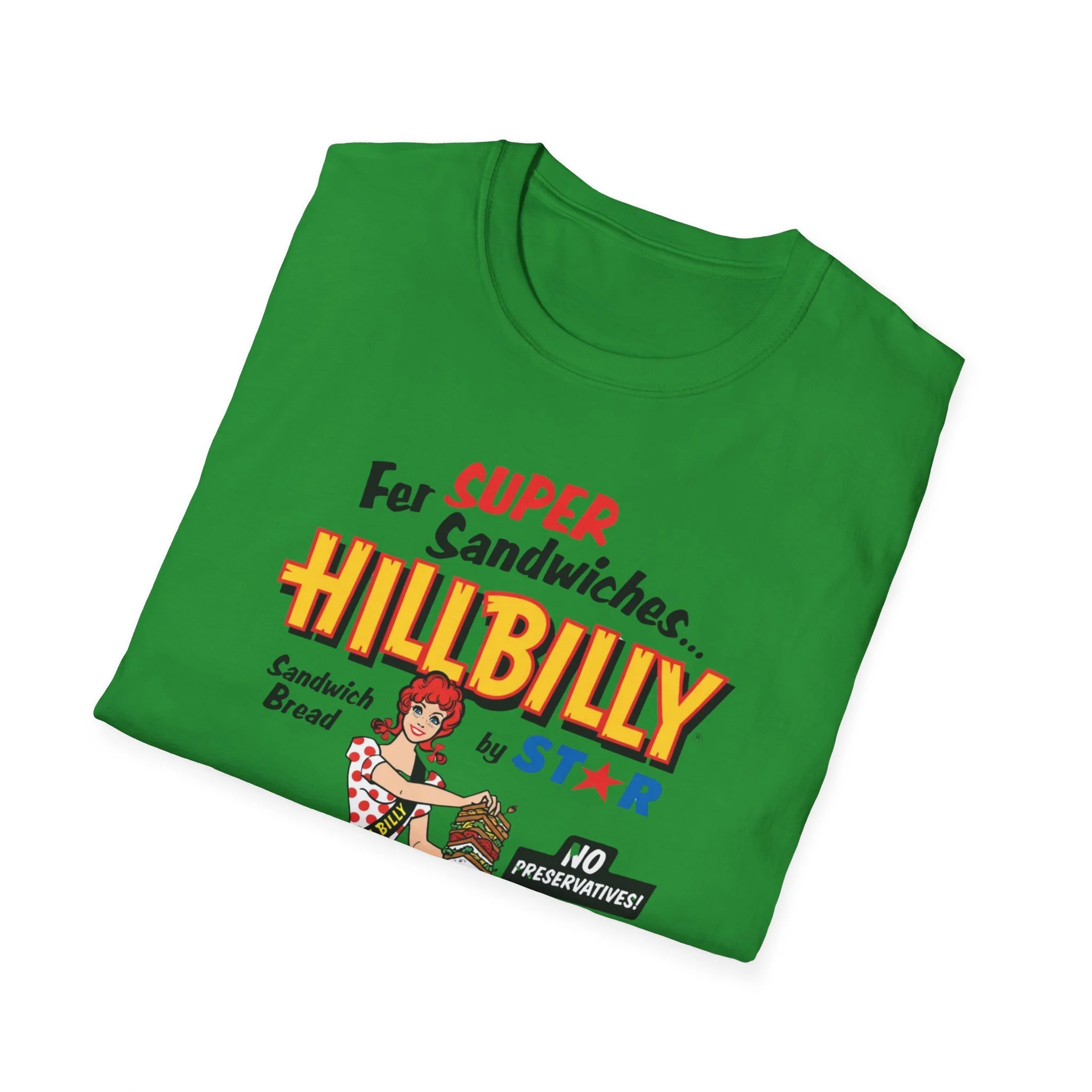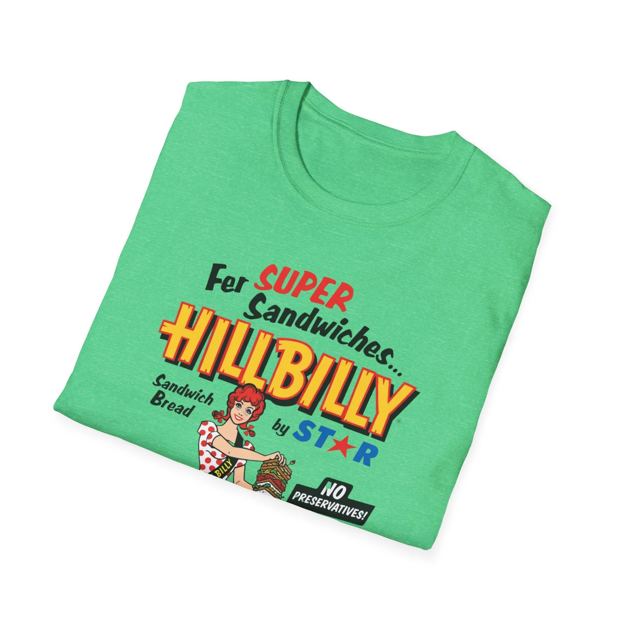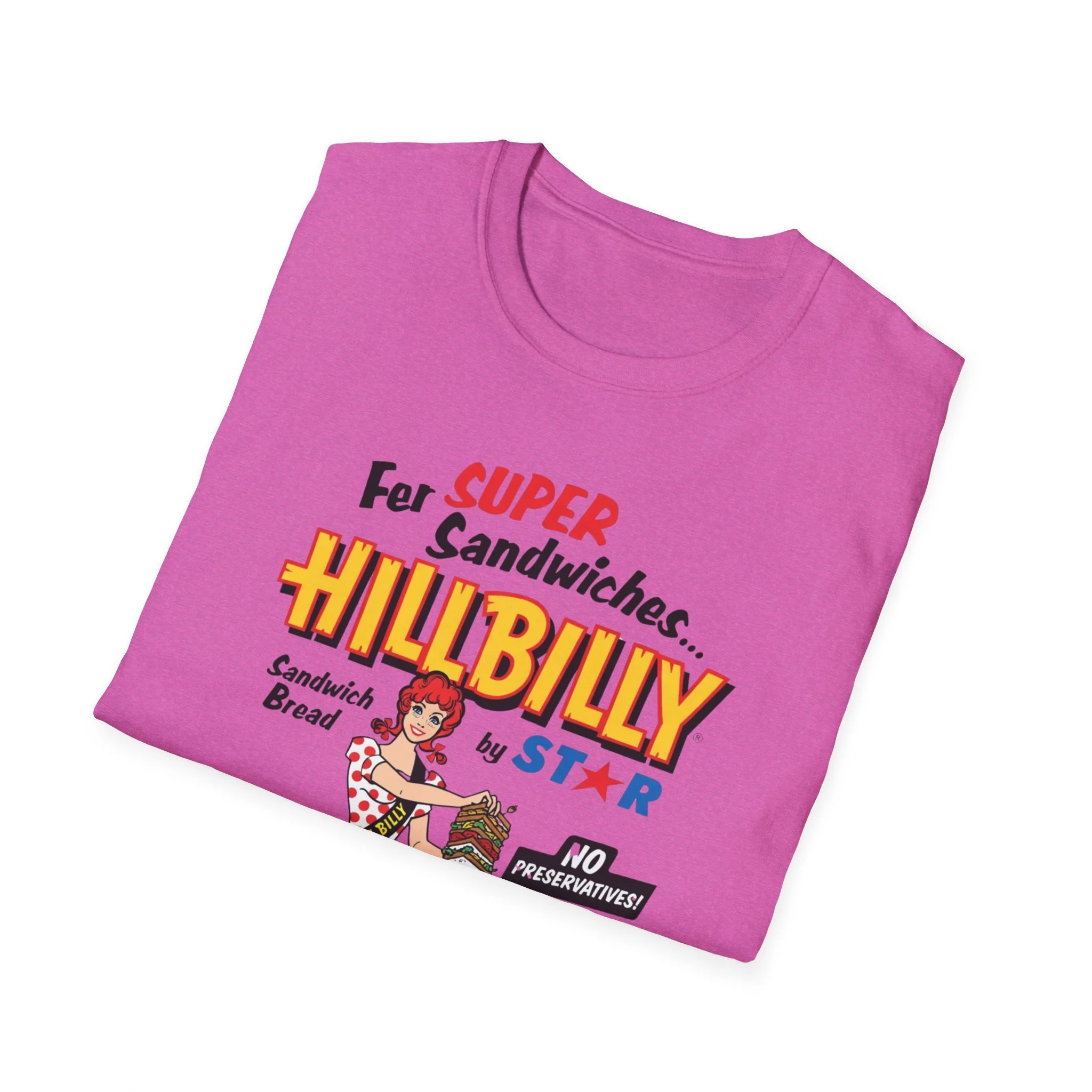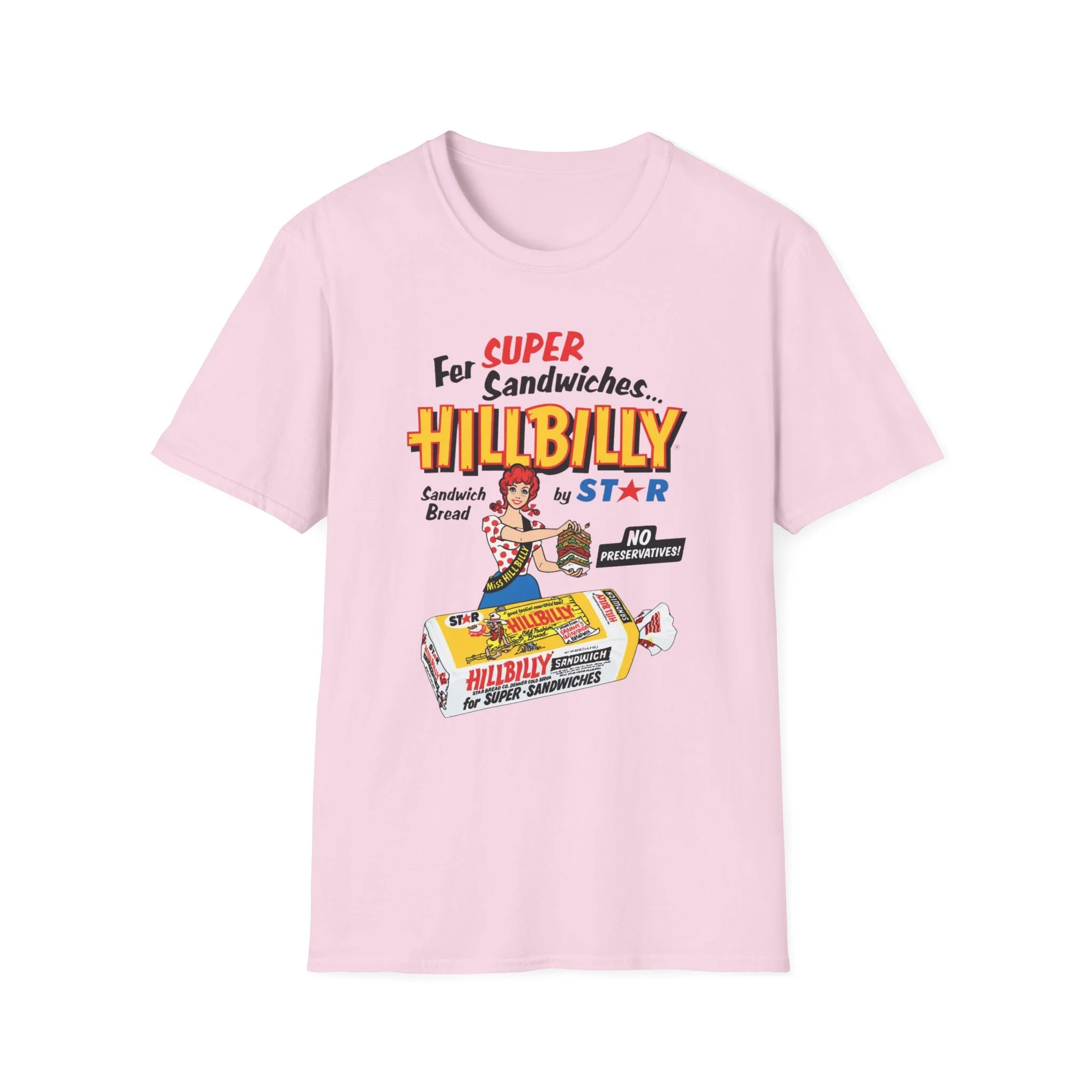 For decades, Hillbilly Sandwich Bread by Star was a beloved staple on supermarket shelves across New England and the Northeast. With its bright, eye-catching packaging featuring the cheerful “Miss Hillbilly” character proudly holding a towering sandwich stack and the bold slogan “For Super Sandwiches… HILLBILLY Sandwich Bread” plus the memorable “NO PRESERVATIVES!” promise, this bread became a go-to favorite for school lunches, picnics, and family sandwiches. The fun, retro branding and catchy name made it stand out in the bread aisle and created countless nostalgic memories for anyone who grew up grabbing a loaf at the local store. This t-shirt brings the classic Hillbilly Sandwich Bread packaging back to life with the full colorful logo, “Miss Hillbilly” illustration, the giant sandwich, the loaf graphic, and all the original slogans including “For Super Sandwiches…” and “NO PRESERVATIVES!” Soft, breathable, and built for everyday wear — perfect for grocery nostalgia lovers, former regulars, or anyone who still smiles when they think of that iconic bread. Wear it and spark those “We always had Hillbilly bread in the house!” stories from anyone who remembers the fun packaging and fresh sandwich taste from the old days.
