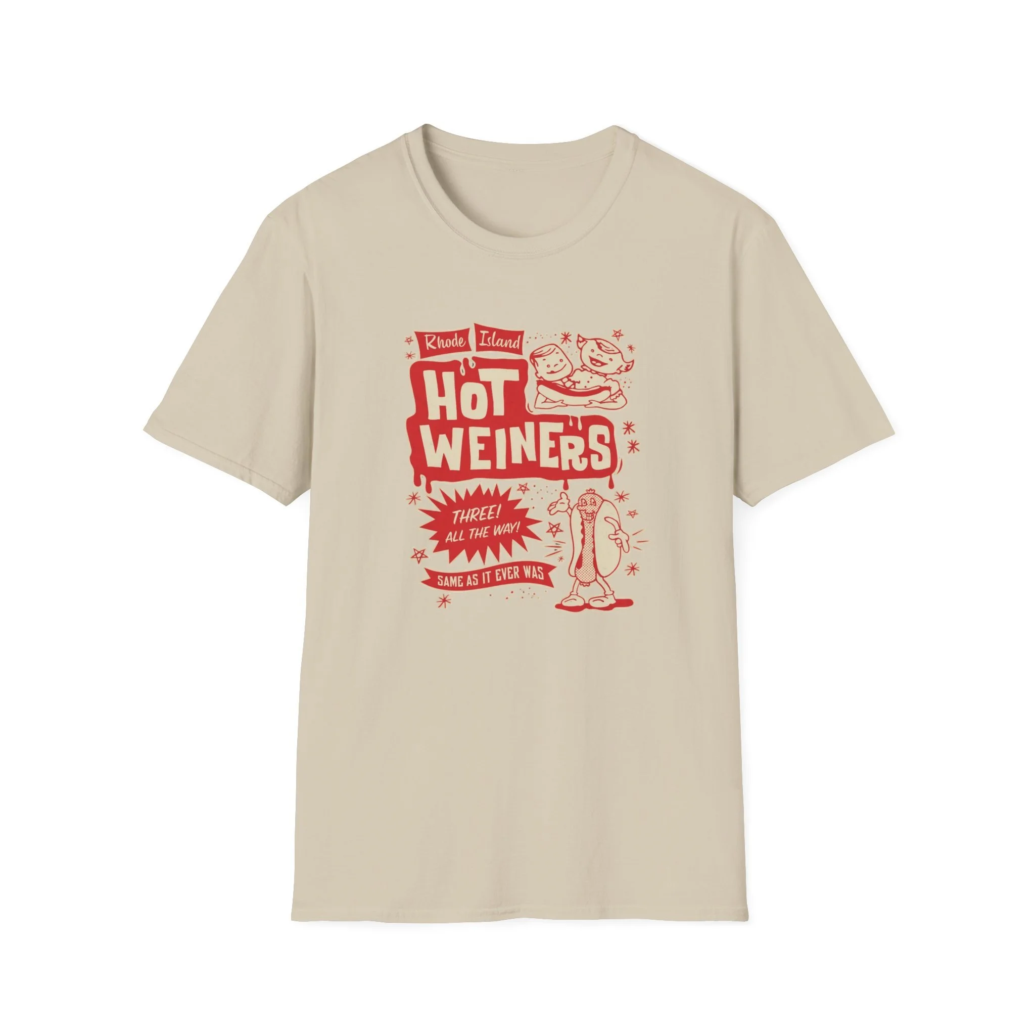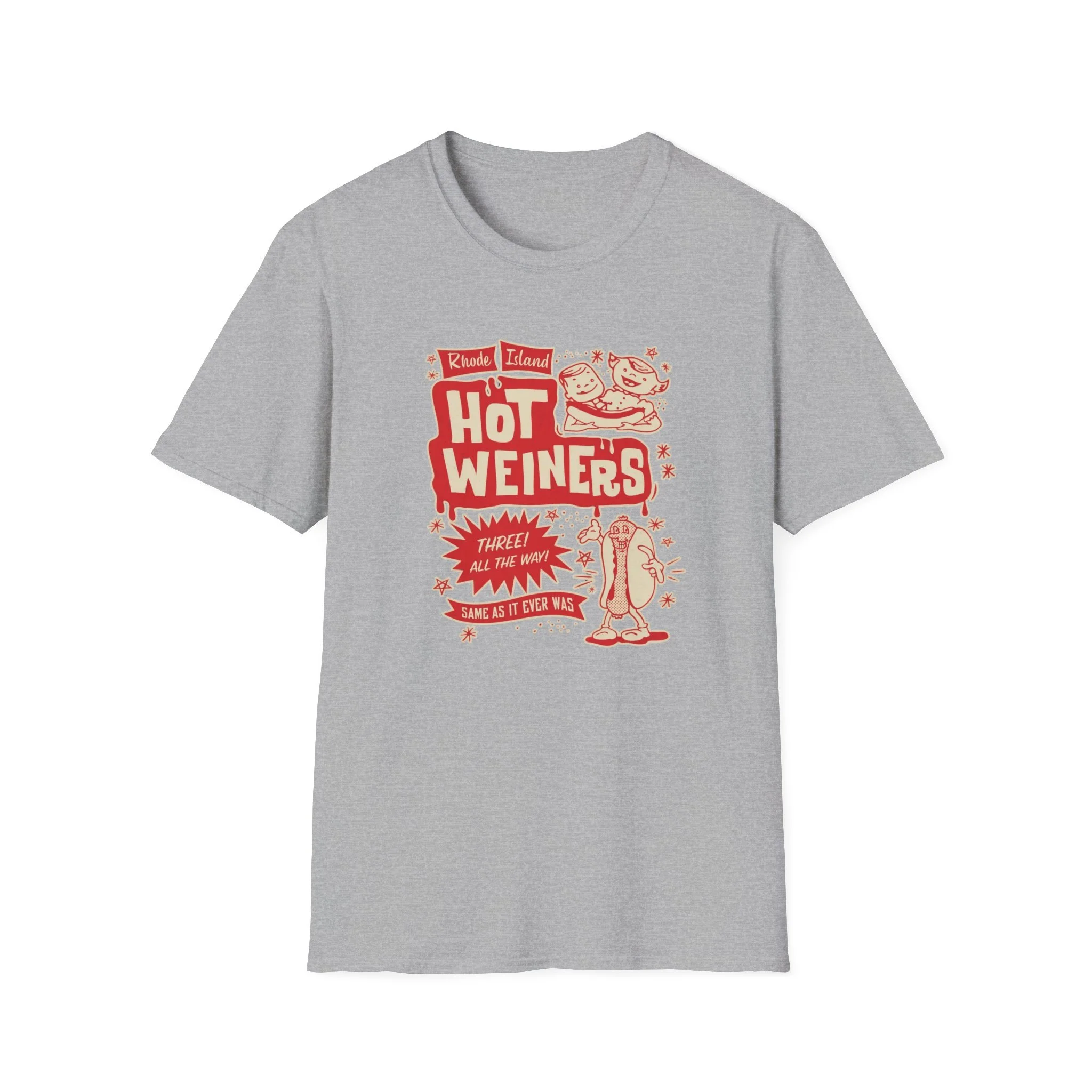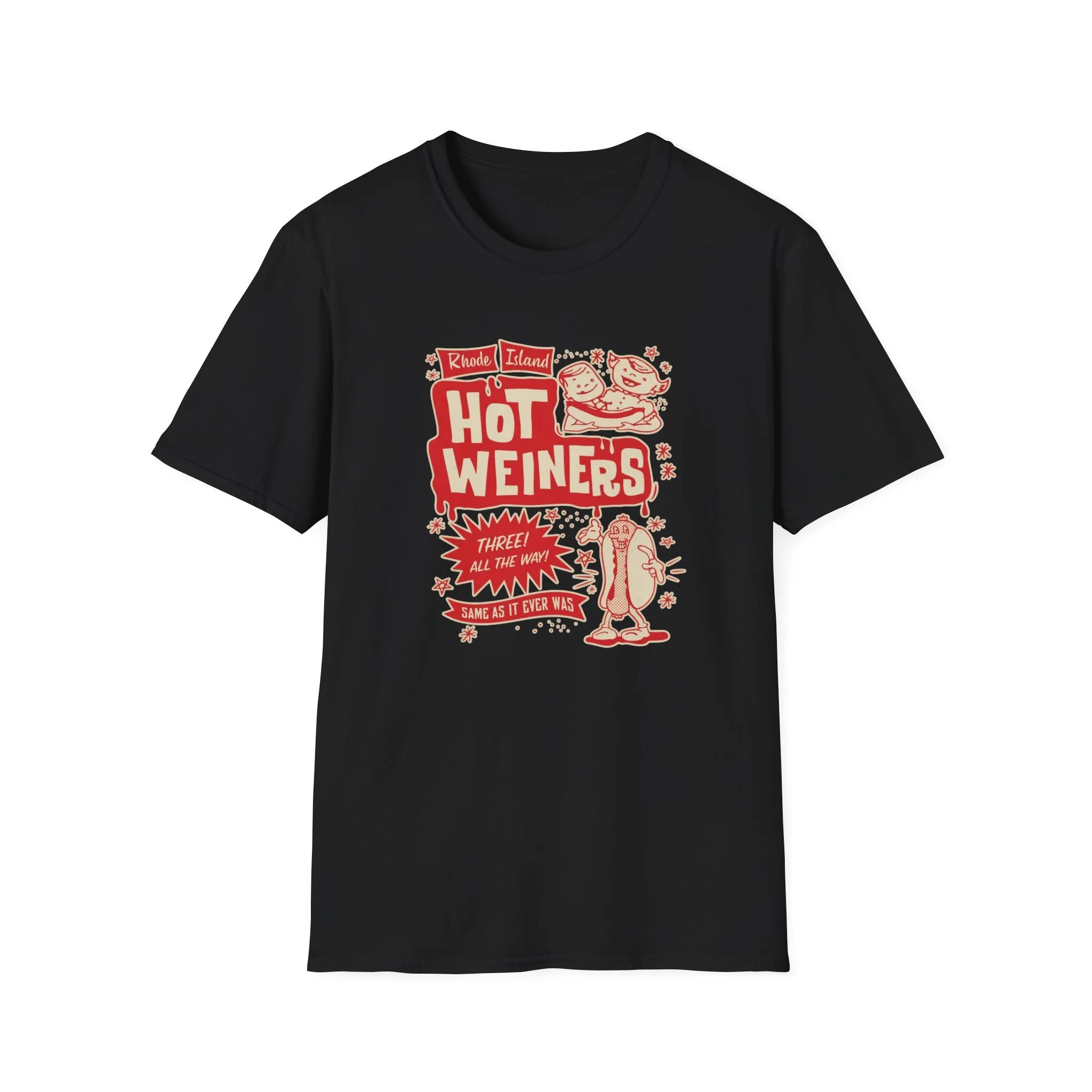 Not just any hot dog — we’re talking those snappy little links smothered in meat sauce, mustard, and chopped onions, served up with that famous “three all the way” call from the counter. This vibrant retro tee brings back the beloved Rhode Island hot weiner stand vibes with its bold red-and-cream design featuring the smiling weiner characters, the dripping “HOT WEINERS” lettering, and the proud banner declaring “SAME AS IT EVER WAS.” It’s pure Ocean State comfort food nostalgia — the kind that makes your mouth water and your memories flood back the second you see it. Soft, comfortable, and built for everyday wear (or your next trip to the weiner joint), this shirt is perfect for: