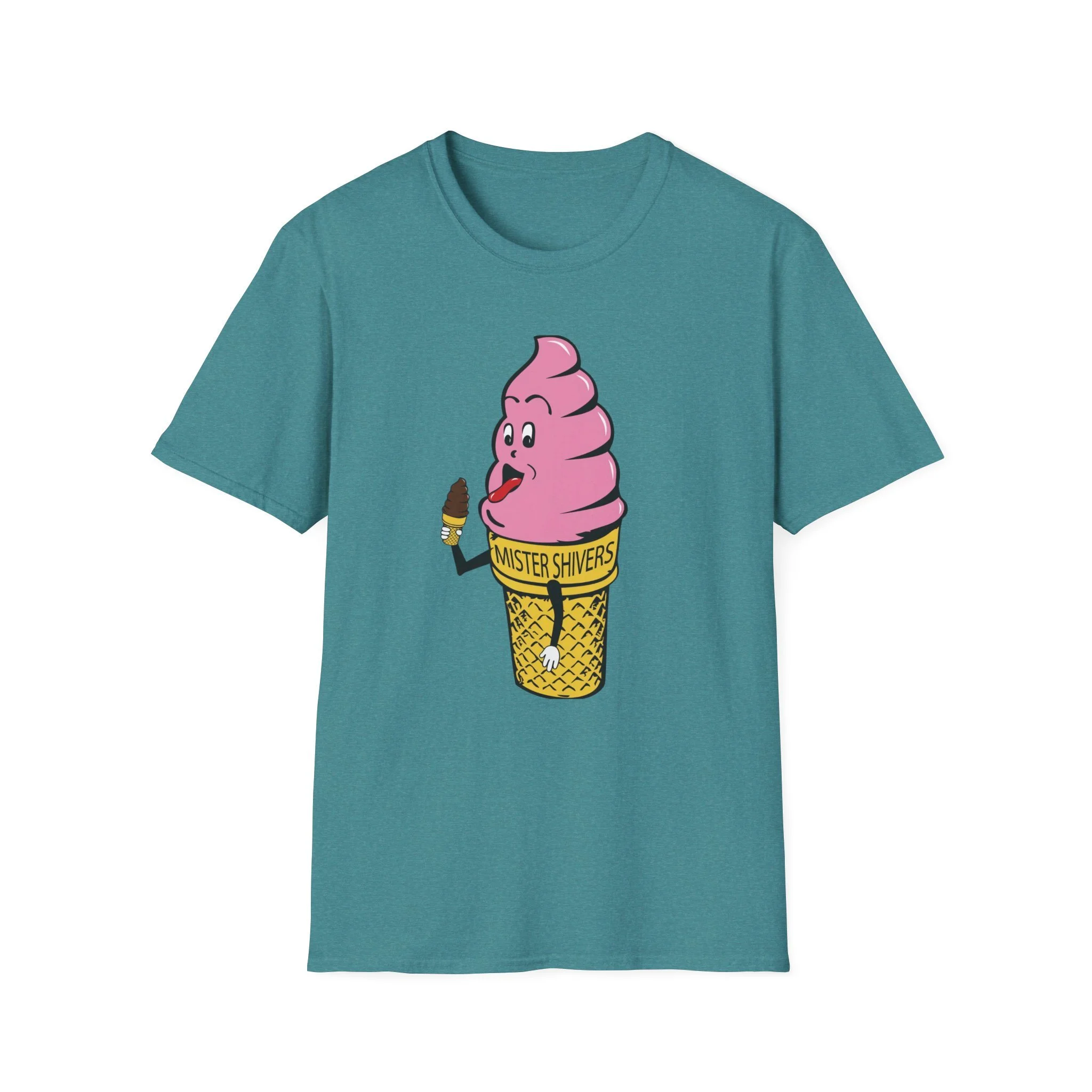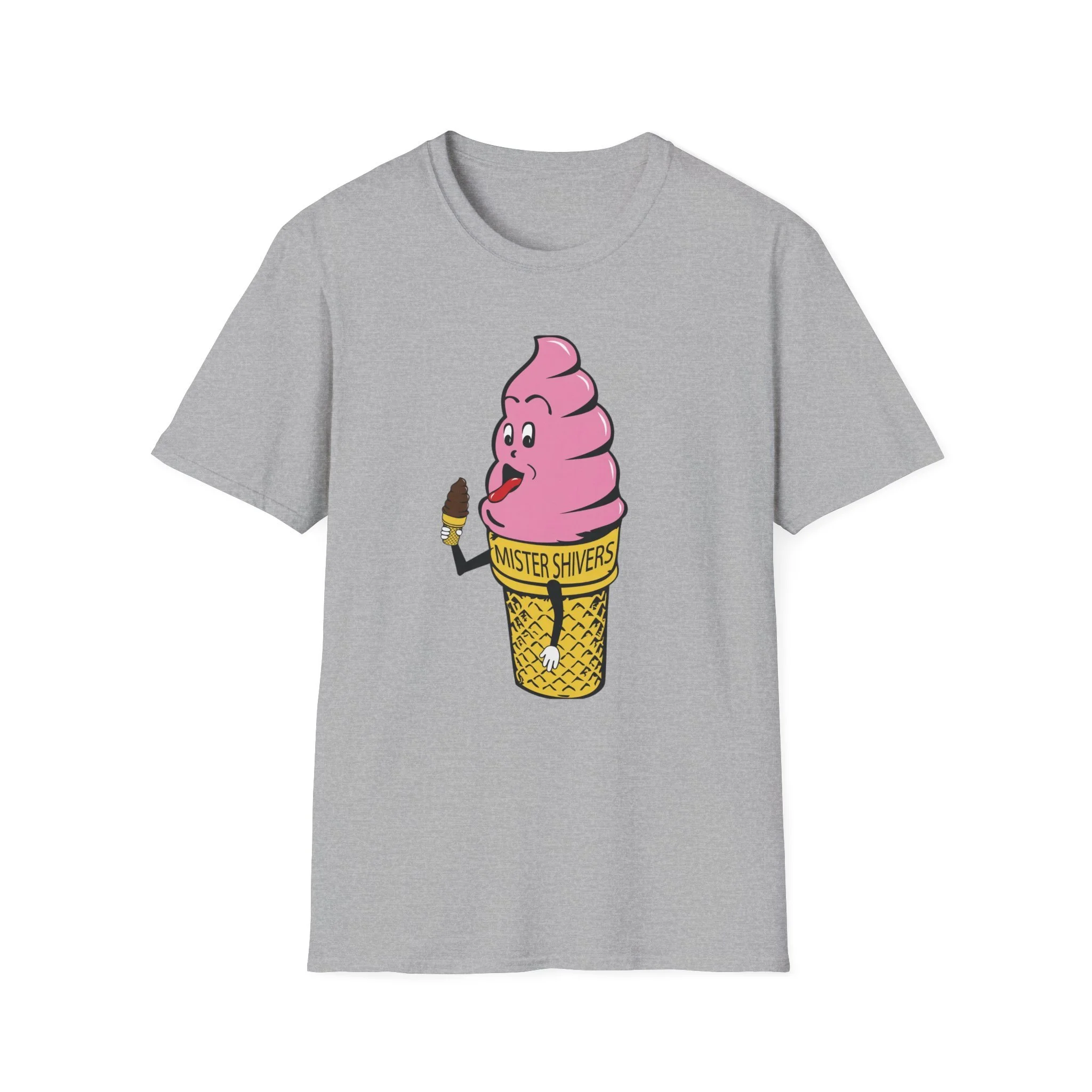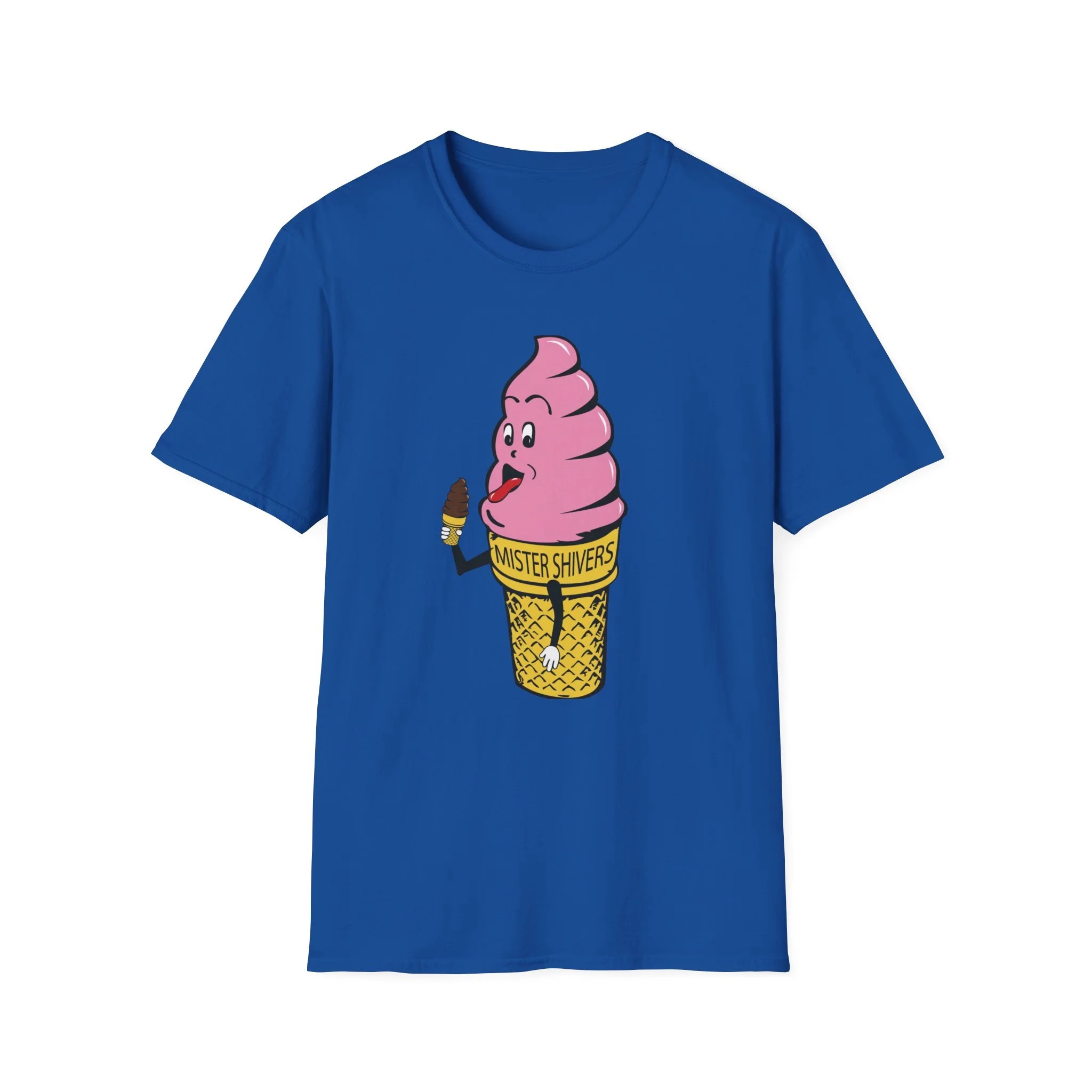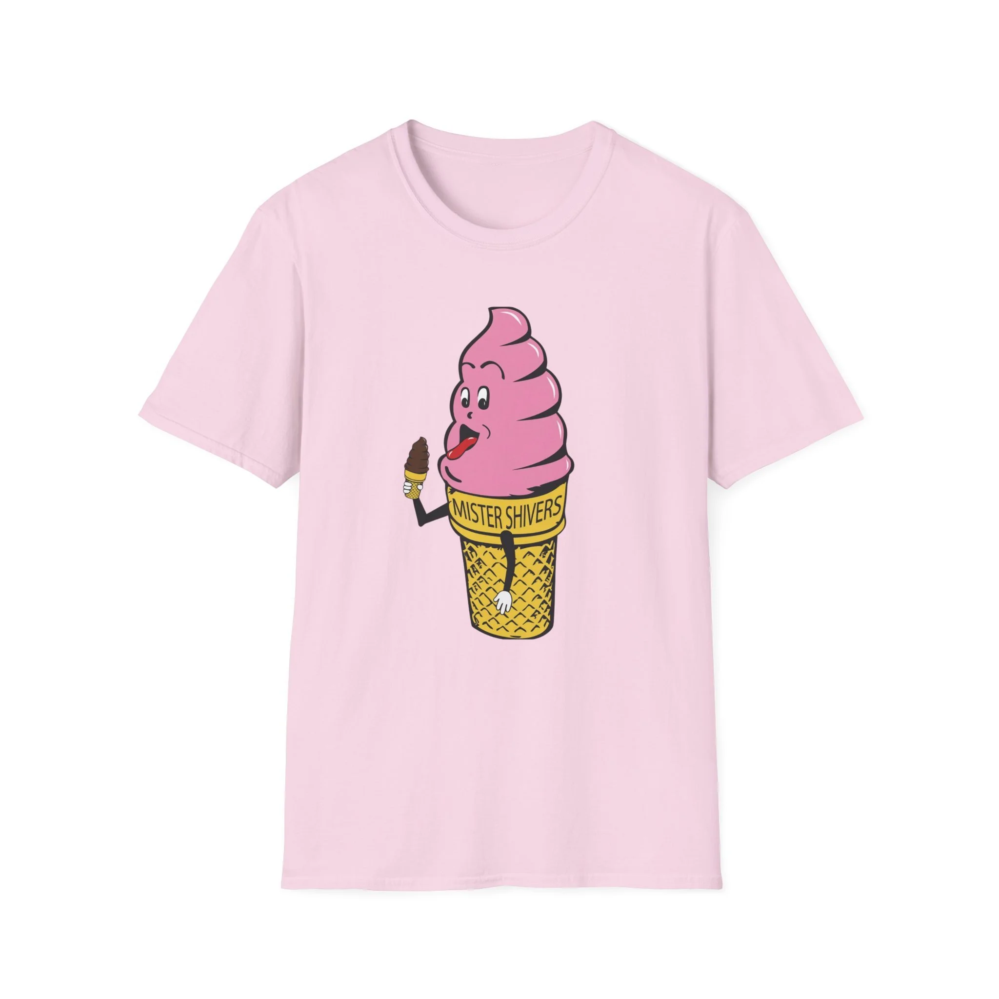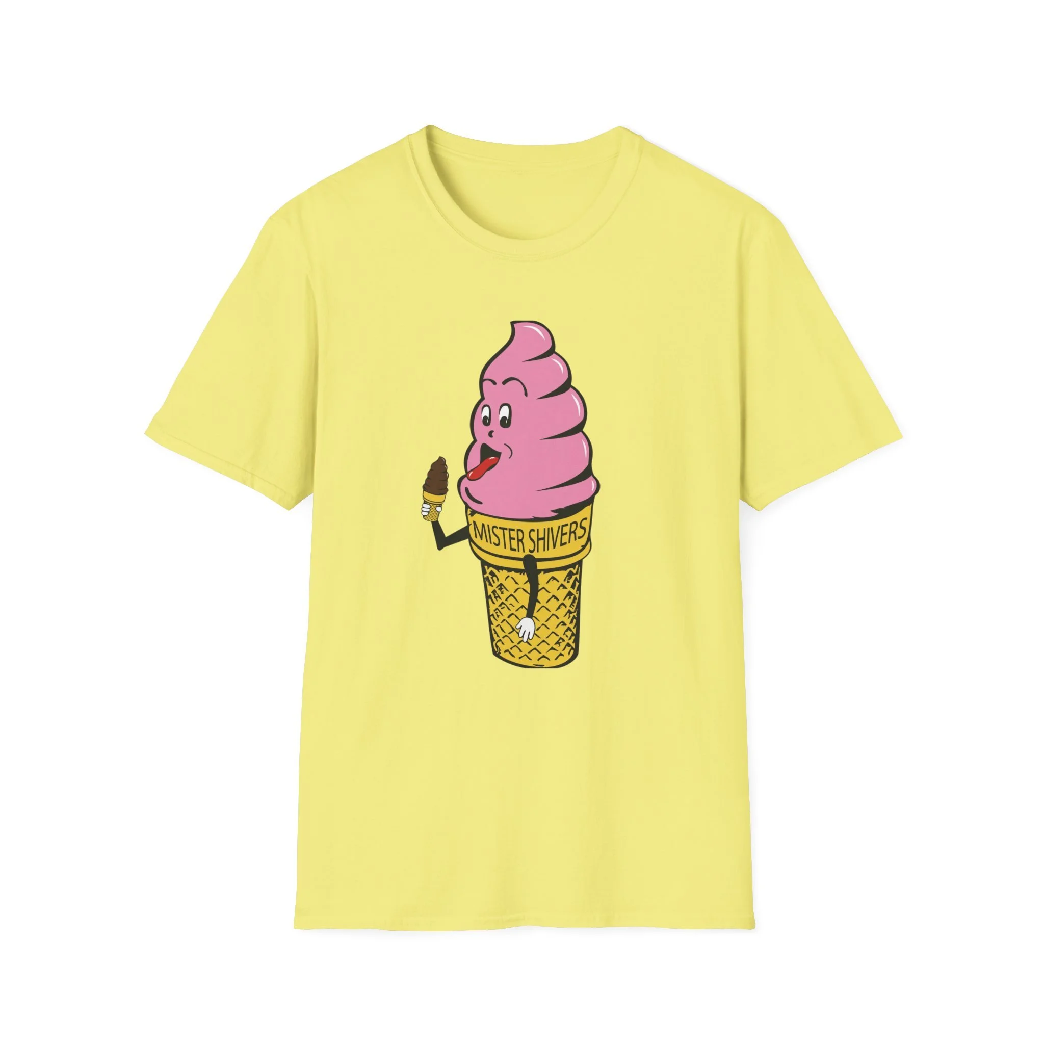 Hey there, cool cat! Meet Mister Shivers — the happiest soft-serve cone in town! With his big goofy grin, wagging tongue, and that cheeky little chocolate-dipped cone in hand, this pink-swirled character was the ultimate symbol of summer fun. Whether you spotted him on a truck, a stand, or a freezer case, Mister Shivers promised one thing: pure icy joy in every lick. This vibrant retro tee brings the beloved Mister Shivers mascot back to life in all his silly, sweet glory — complete with the classic yellow wafer cone and bold “MISTER SHIVERS” lettering. It’s the kind of wholesome, over-the-top cartoon advertising that defined ice cream trucks and neighborhood stands for a whole generation. Soft, comfortable, and built for everyday wear (or your next brain-freeze adventure), this shirt is perfect for: