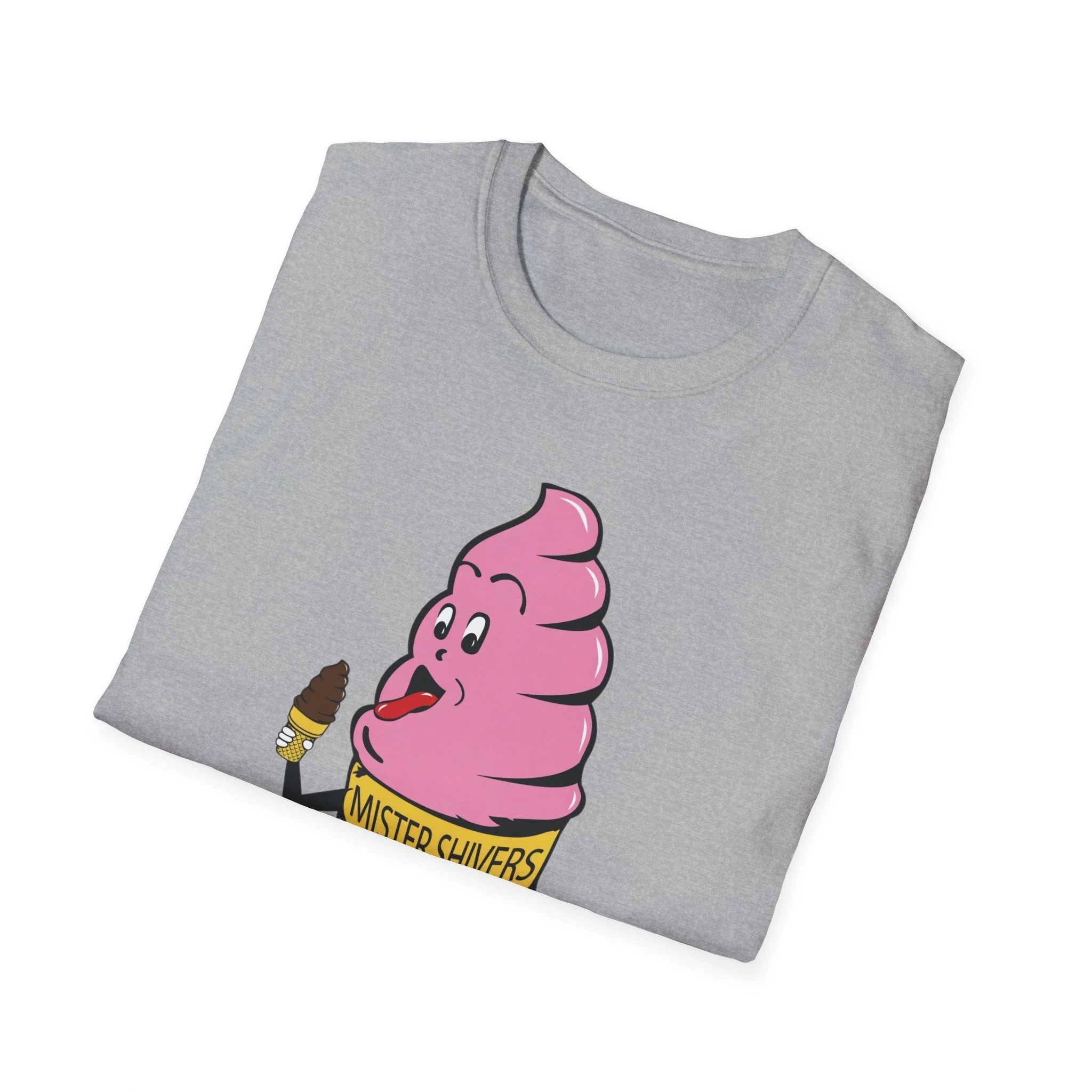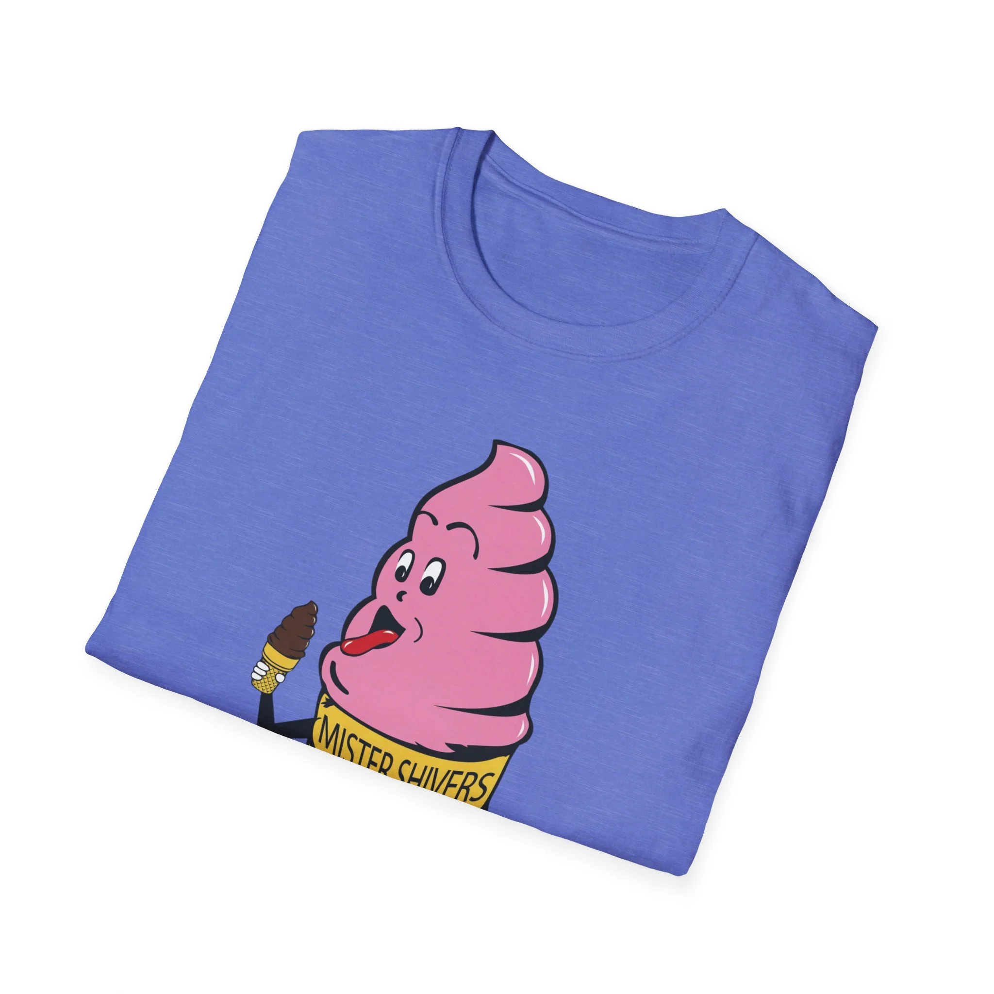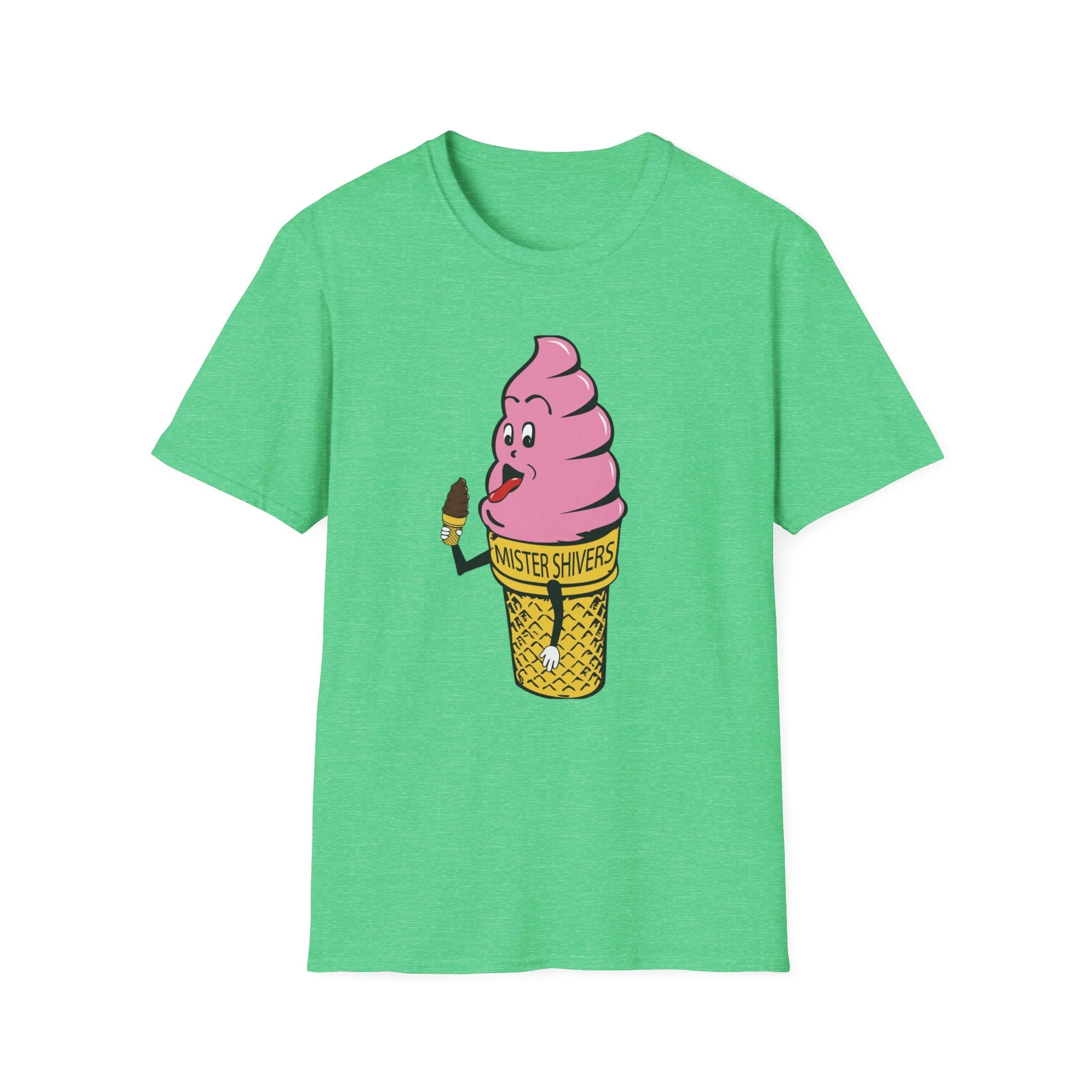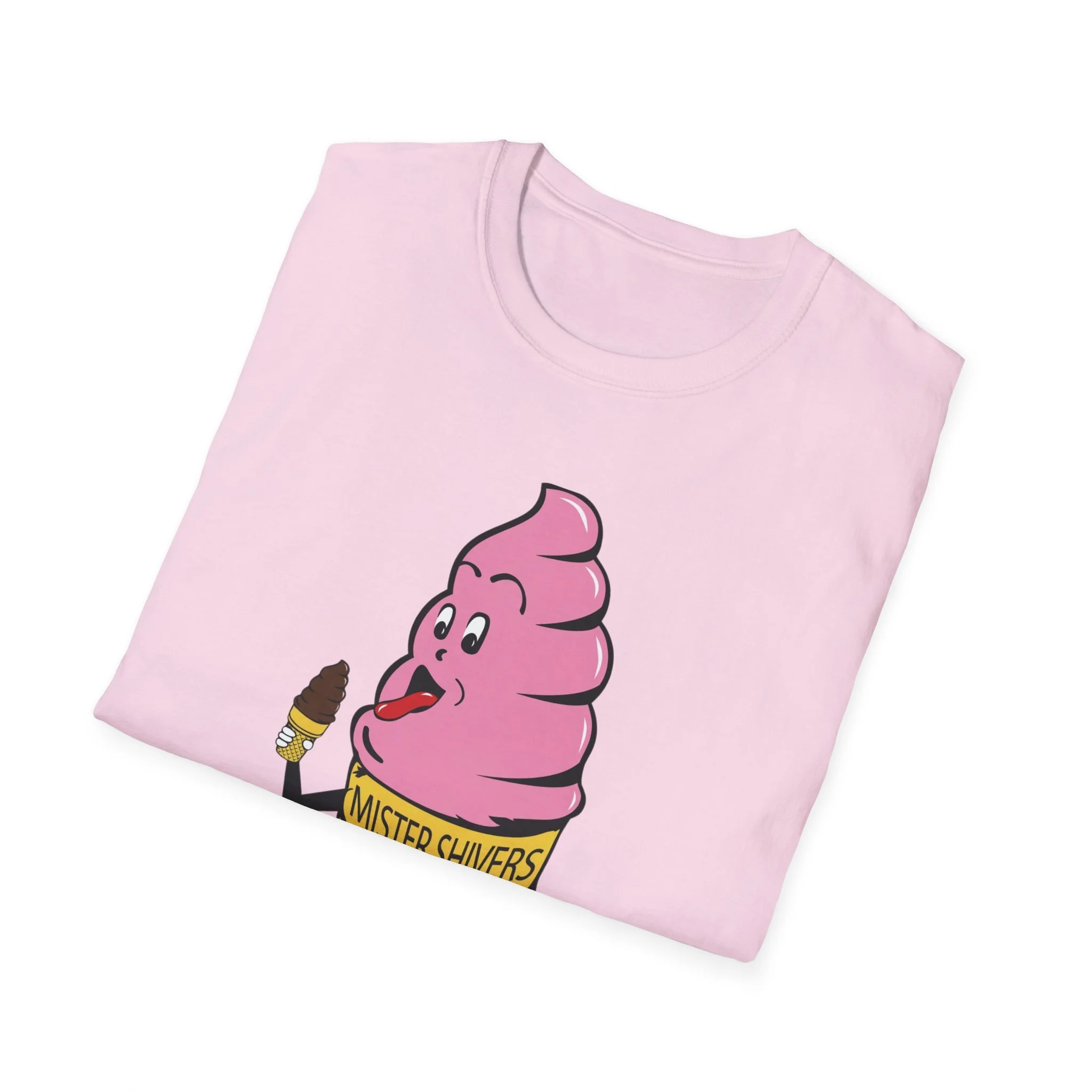 Hey there, cool cat! Meet Mister Shivers — the happiest soft-serve cone in town! With his big goofy grin, wagging tongue, and that cheeky little chocolate-dipped cone in hand, this pink-swirled character was the ultimate symbol of summer fun. Whether you spotted him on a truck, a stand, or a freezer case, Mister Shivers promised one thing: pure icy joy in every lick. This vibrant retro tee brings the beloved Mister Shivers mascot back to life in all his silly, sweet glory — complete with the classic yellow wafer cone and bold “MISTER SHIVERS” lettering. It’s the kind of wholesome, over-the-top cartoon advertising that defined ice cream trucks and neighborhood stands for a whole generation. Soft, comfortable, and built for everyday wear (or your next brain-freeze adventure), this shirt is perfect for: