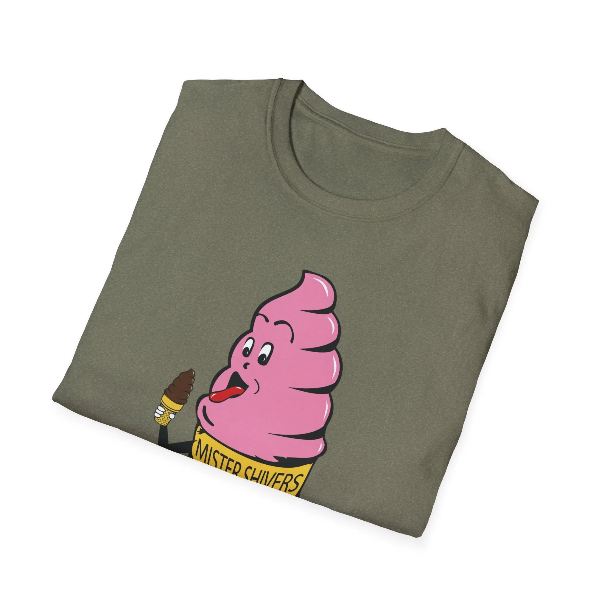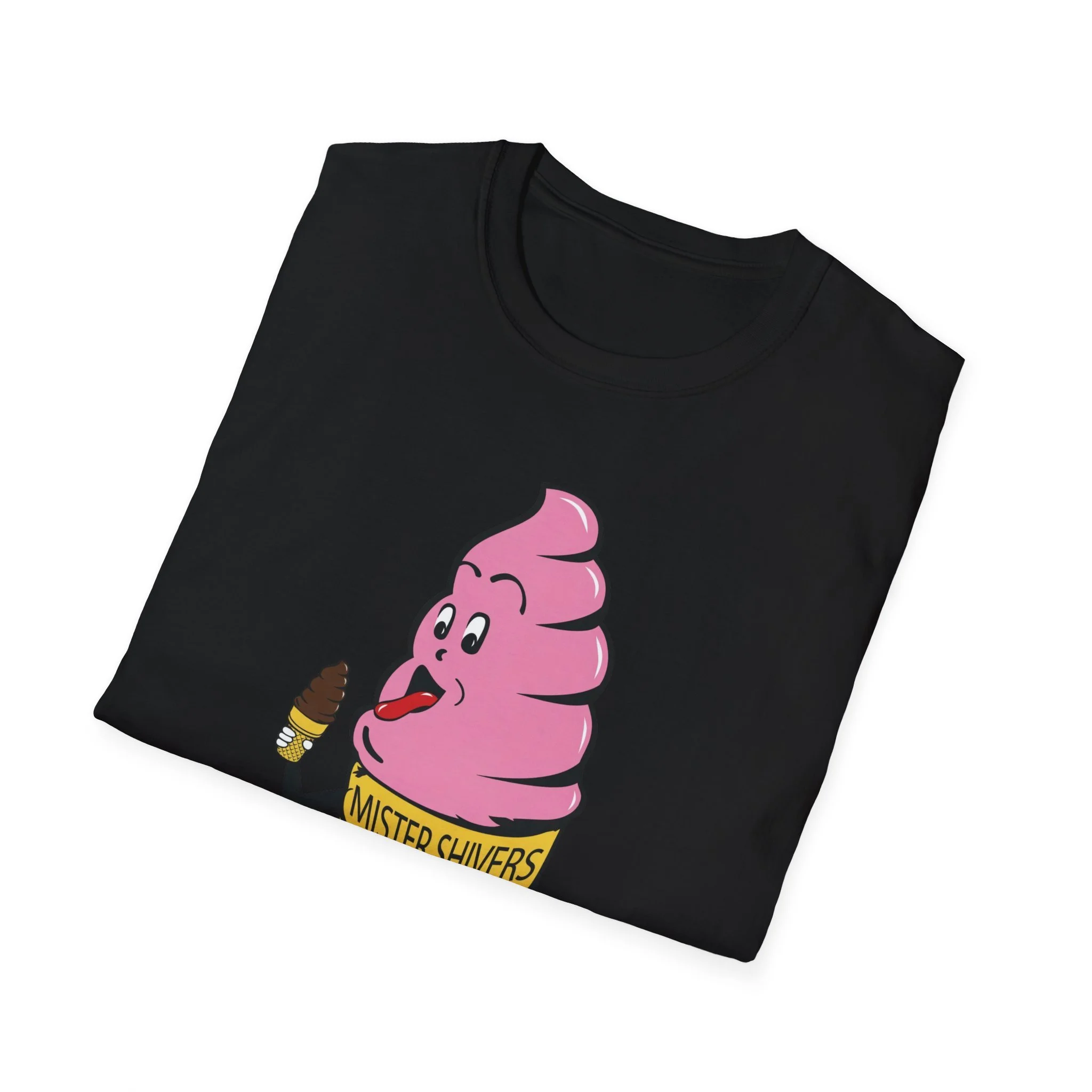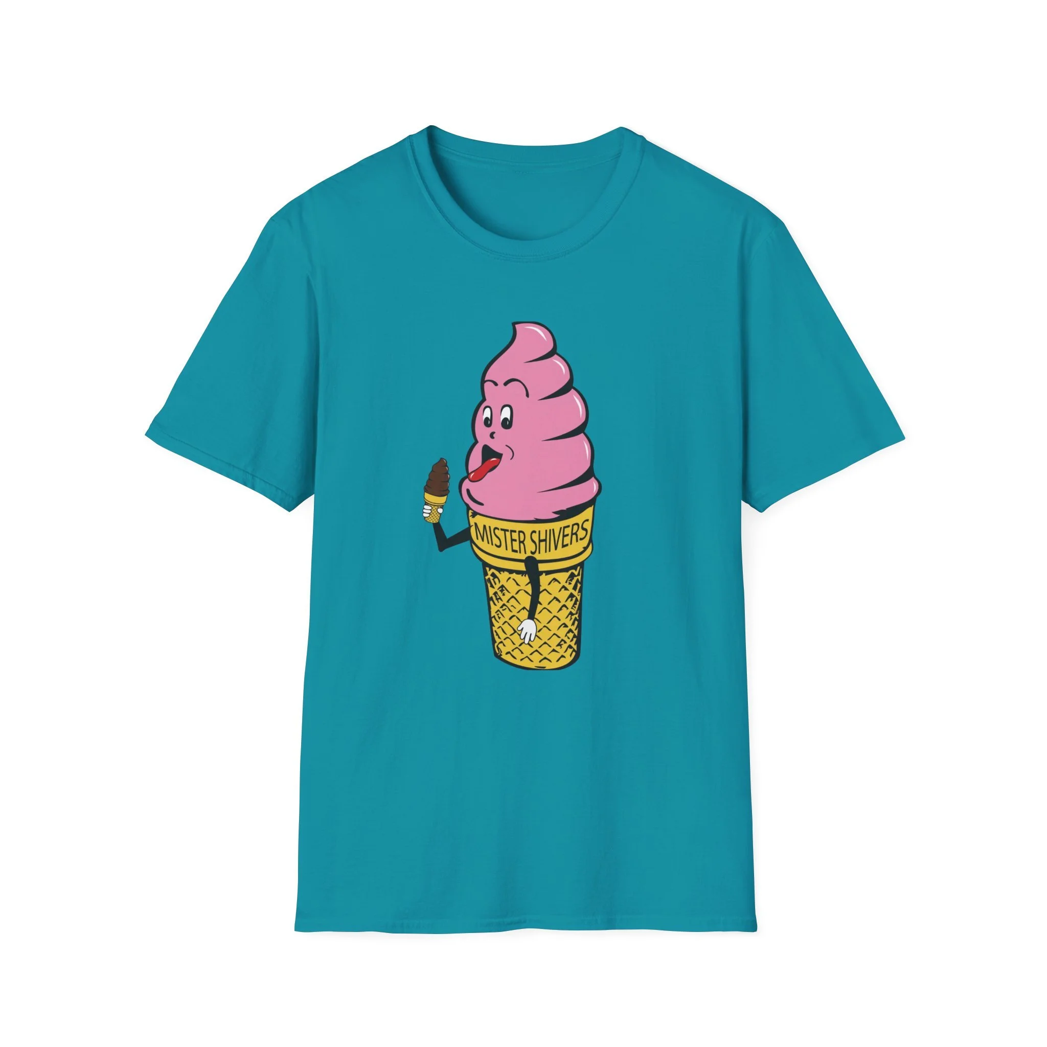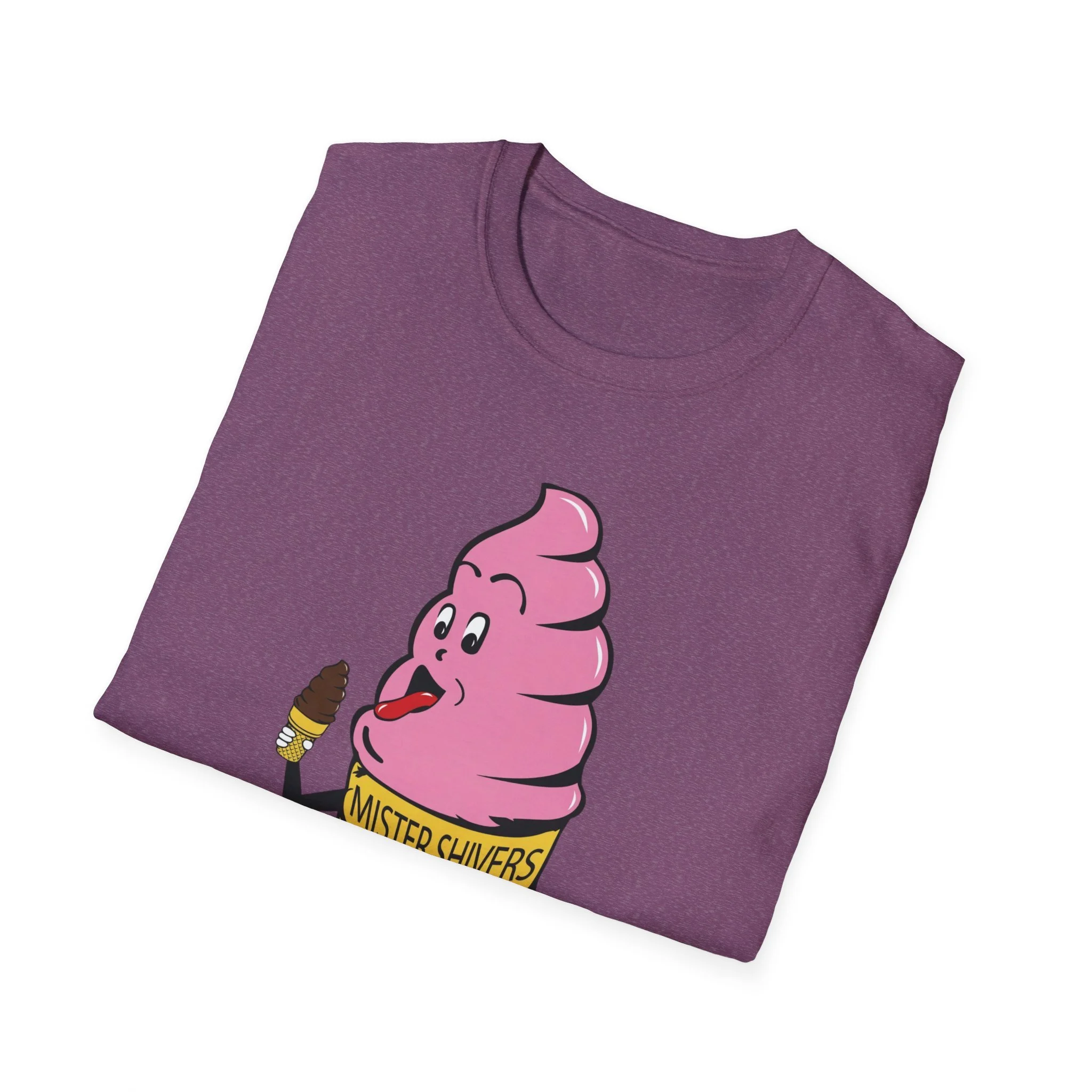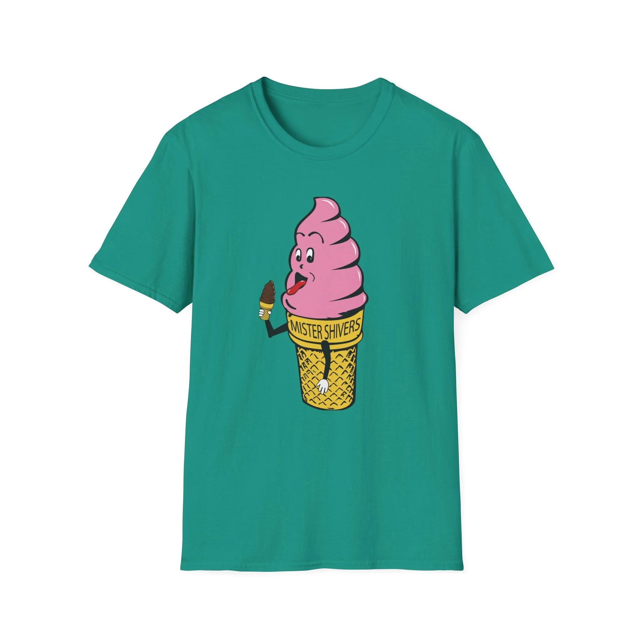 Hey there, cool cat! Meet Mister Shivers — the happiest soft-serve cone in town! With his big goofy grin, wagging tongue, and that cheeky little chocolate-dipped cone in hand, this pink-swirled character was the ultimate symbol of summer fun. Whether you spotted him on a truck, a stand, or a freezer case, Mister Shivers promised one thing: pure icy joy in every lick. This vibrant retro tee brings the beloved Mister Shivers mascot back to life in all his silly, sweet glory — complete with the classic yellow wafer cone and bold “MISTER SHIVERS” lettering. It’s the kind of wholesome, over-the-top cartoon advertising that defined ice cream trucks and neighborhood stands for a whole generation. Soft, comfortable, and built for everyday wear (or your next brain-freeze adventure), this shirt is perfect for: