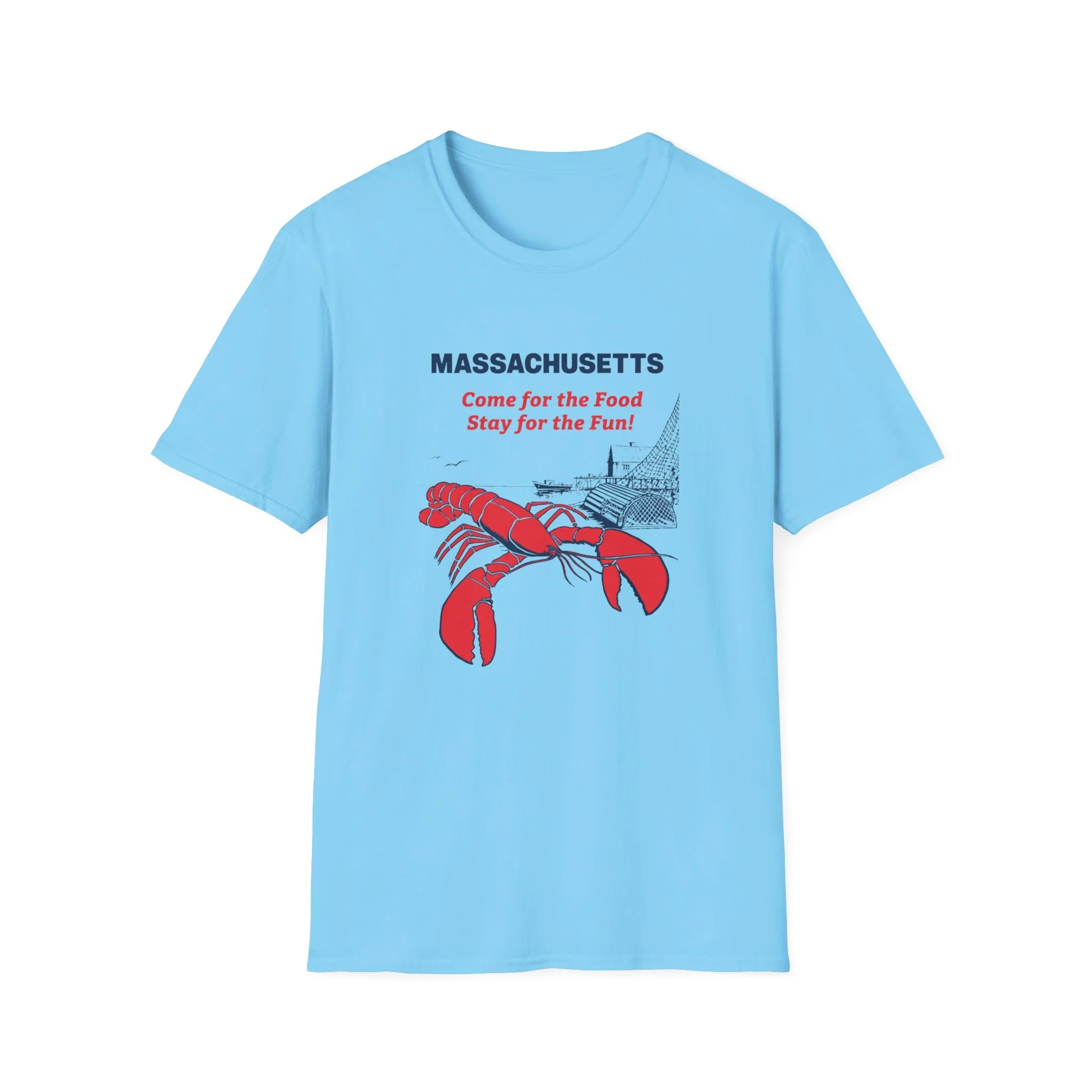 Massachusetts has always known how to lure visitors with its unbeatable combination of fresh seafood, classic New England fare, and nonstop summer fun. This playful retro design perfectly captures that irresistible invitation: “Come for the Food, Stay for the Fun!” Featuring a bold red lobster front and center, a scenic coastal illustration with lobster traps and a church steeple in the background, and the proud “MASSACHUSETTS” header, it celebrates everything the Bay State is famous for — lobster rolls, clambakes, beach days, and that unmistakable regional pride. This t-shirt brings the classic Massachusetts tourism spirit back to life with the bright lobster graphic, the coastal scene, and the memorable tagline that still rings true today. Soft, breathable, and built for everyday wear — perfect for summer road trips up the coast, seafood dinners, or showing off your Bay State love wherever you go. Wear it and spark those “You really do come for the food and stay for the fun!” stories from anyone who’s ever fallen in love with a Massachusetts lobster shack or beach town.
