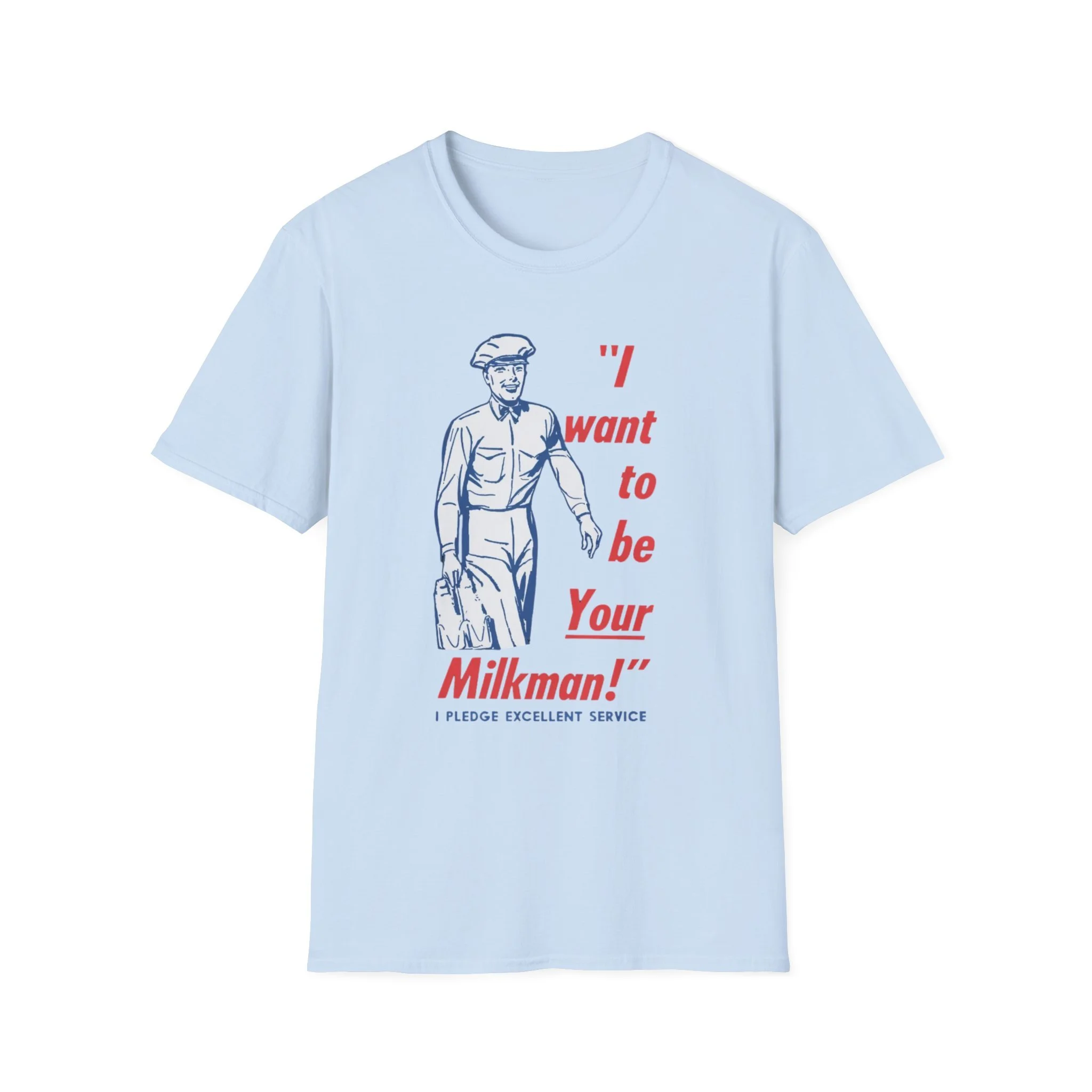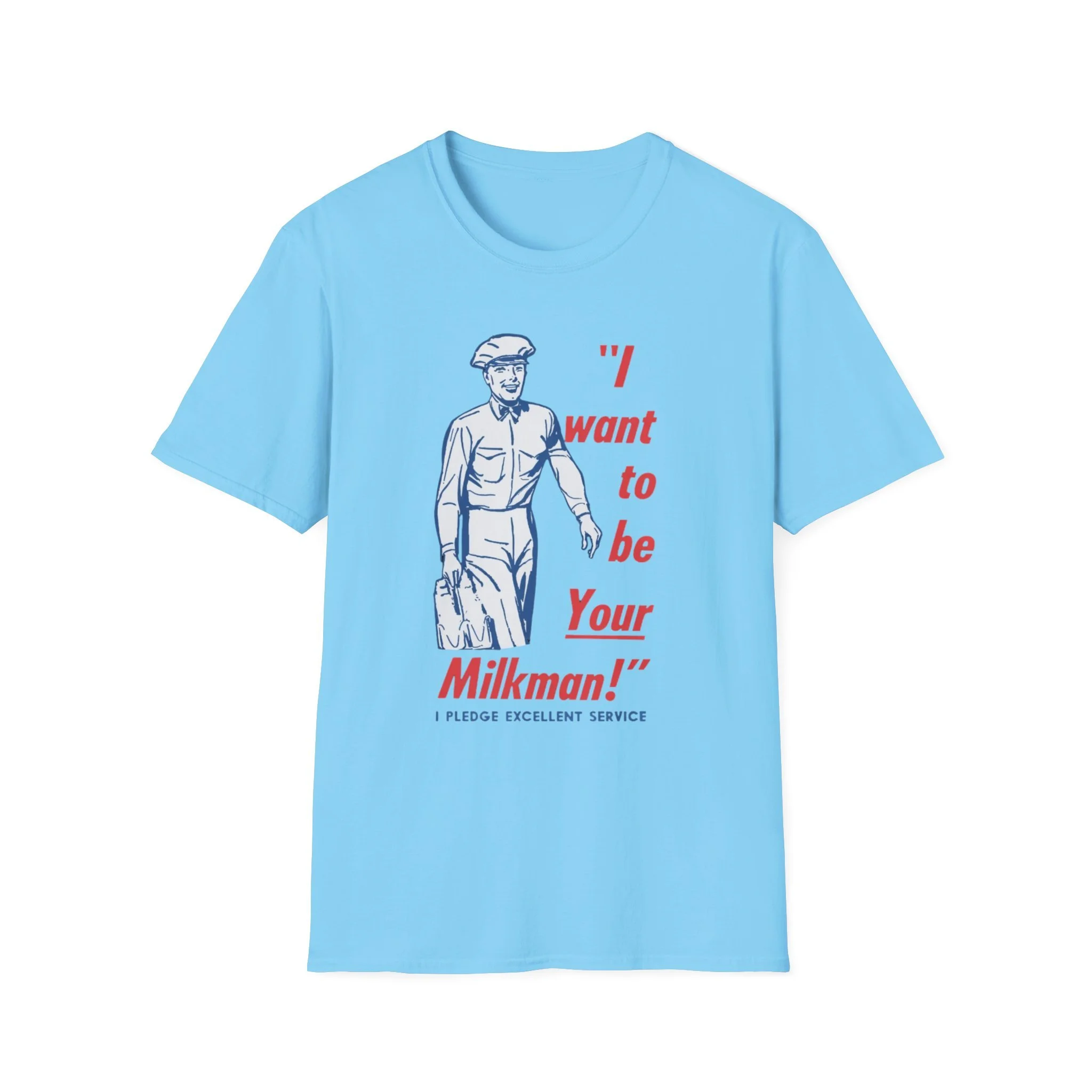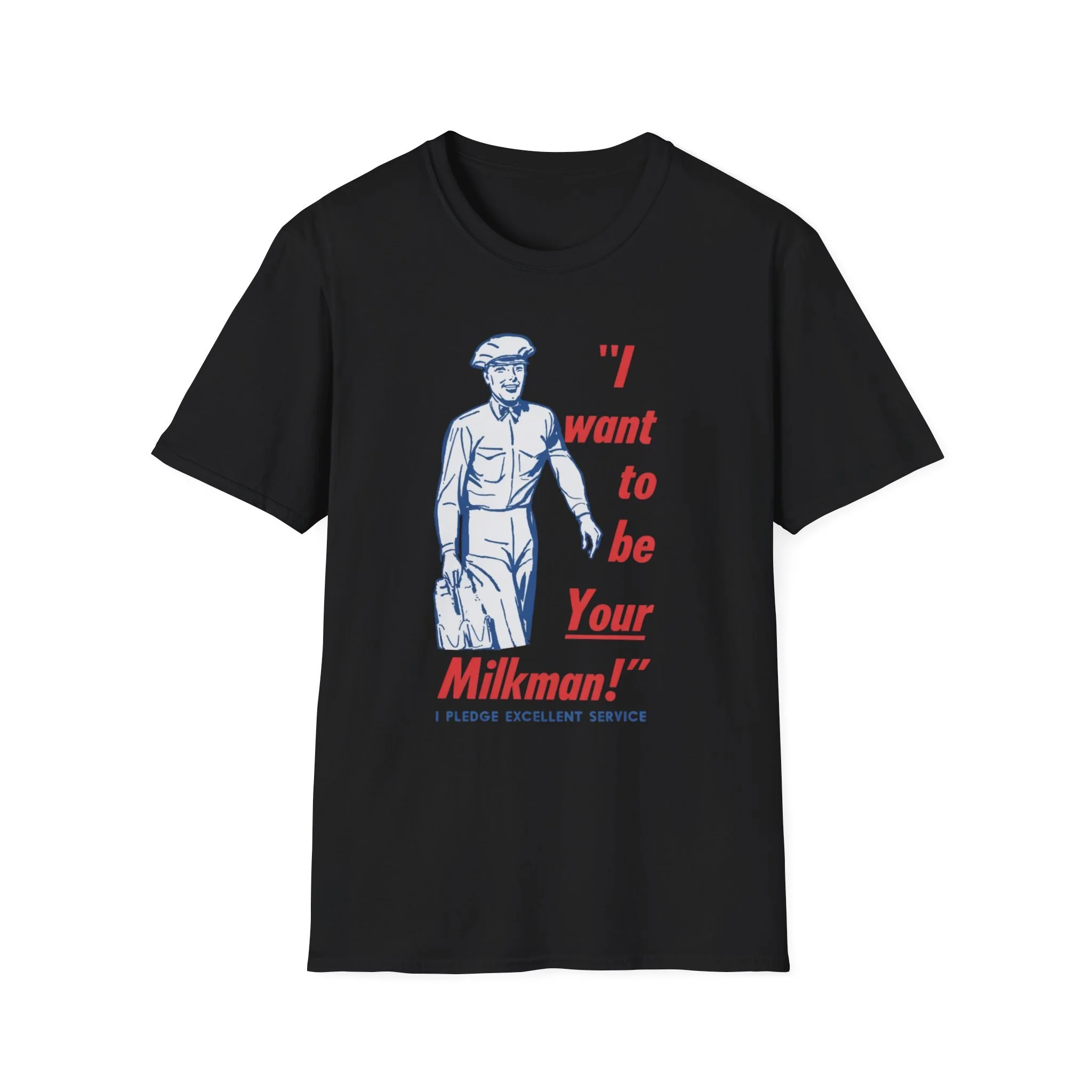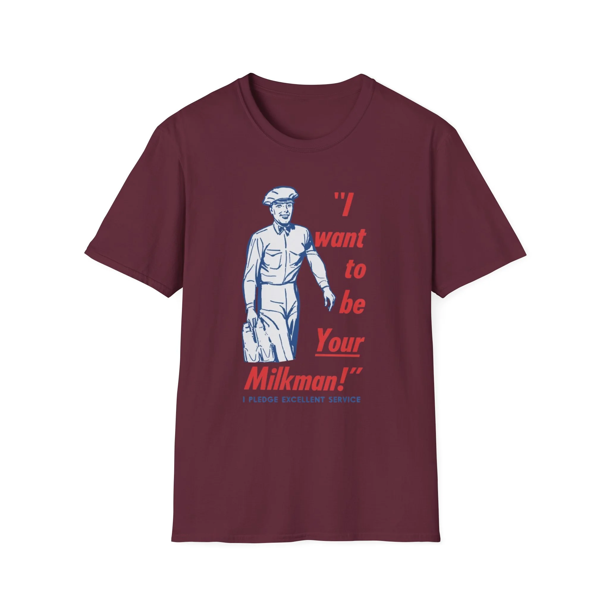Ding-dong! The milkman’s here! Remember when the milkman delivered fresh glass bottles of milk right to your doorstep every morning? That friendly uniformed guy with the cap, the big smile, and the heavy carrier full of dairy goodness was a daily hero in neighborhoods across New England and beyond. This cheerful retro tee brings back that golden-era charm with the classic vintage illustration and the unforgettable slogan: “I want to be Your Milkman!” — complete with the proud pledge of “Excellent Service” underneath. It’s pure 1950s–60s Americana, the kind of wholesome nostalgia that makes you smile every time you see it. Soft, comfortable, and built for everyday wear, this shirt is perfect for: