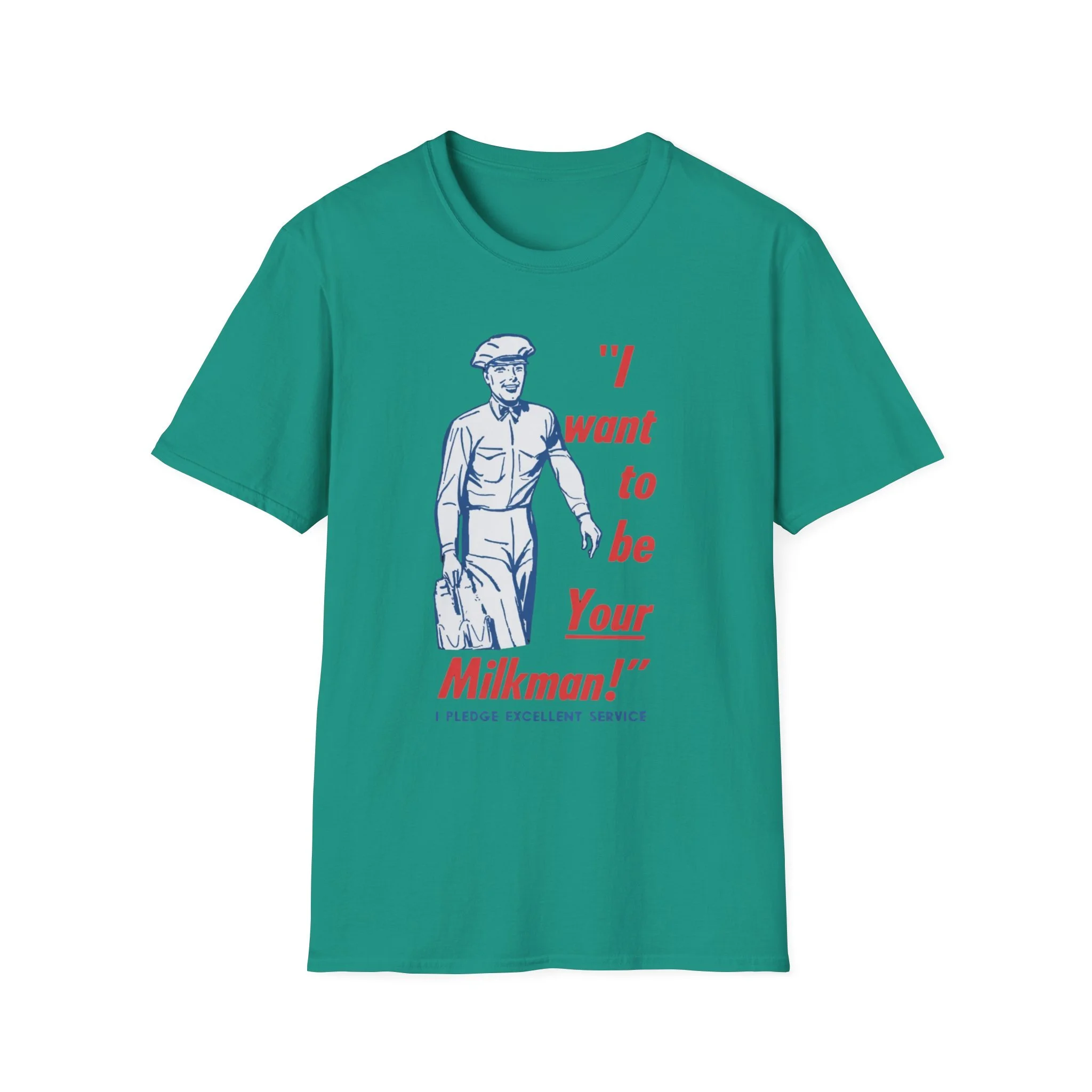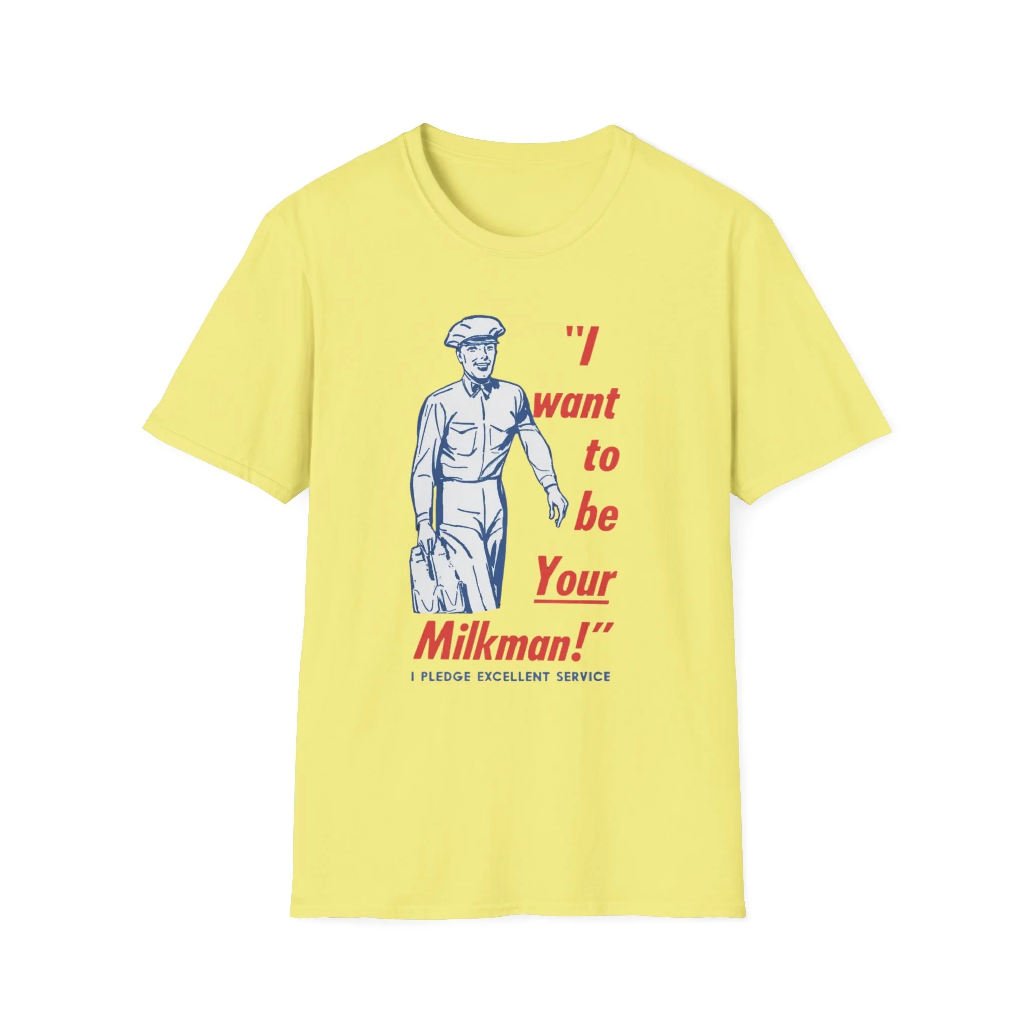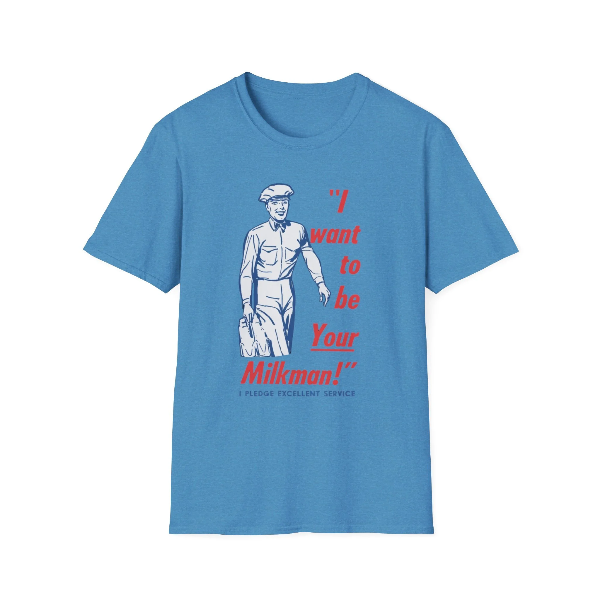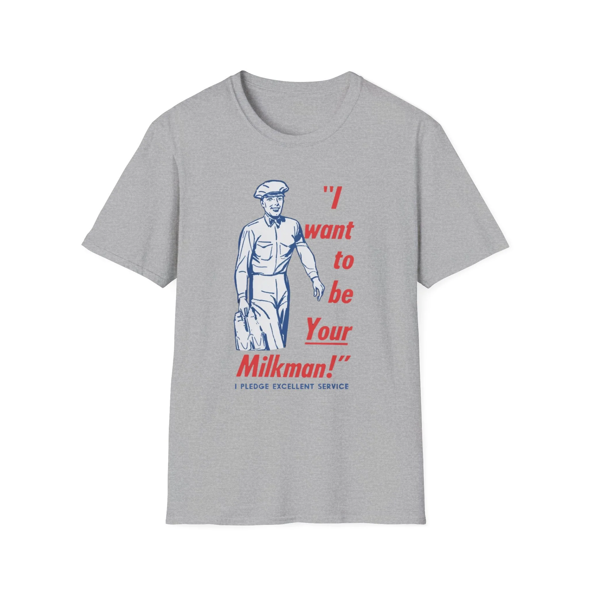 Ding-dong! The milkman’s here! Remember when the milkman delivered fresh glass bottles of milk right to your doorstep every morning? That friendly uniformed guy with the cap, the big smile, and the heavy carrier full of dairy goodness was a daily hero in neighborhoods across New England and beyond. This cheerful retro tee brings back that golden-era charm with the classic vintage illustration and the unforgettable slogan: “I want to be Your Milkman!” — complete with the proud pledge of “Excellent Service” underneath. It’s pure 1950s–60s Americana, the kind of wholesome nostalgia that makes you smile every time you see it. Soft, comfortable, and built for everyday wear, this shirt is perfect for: