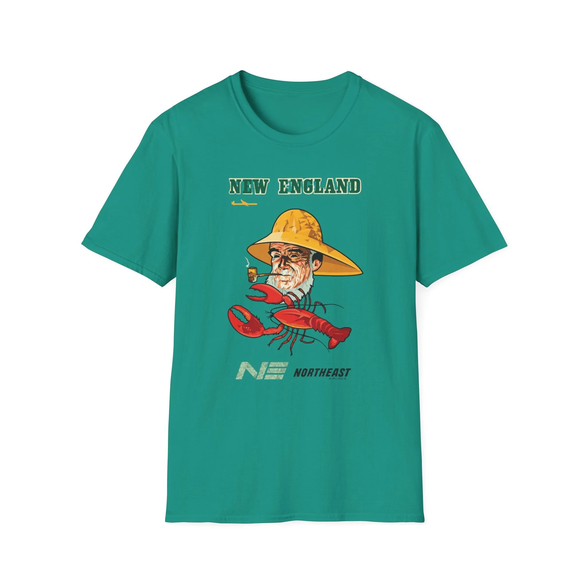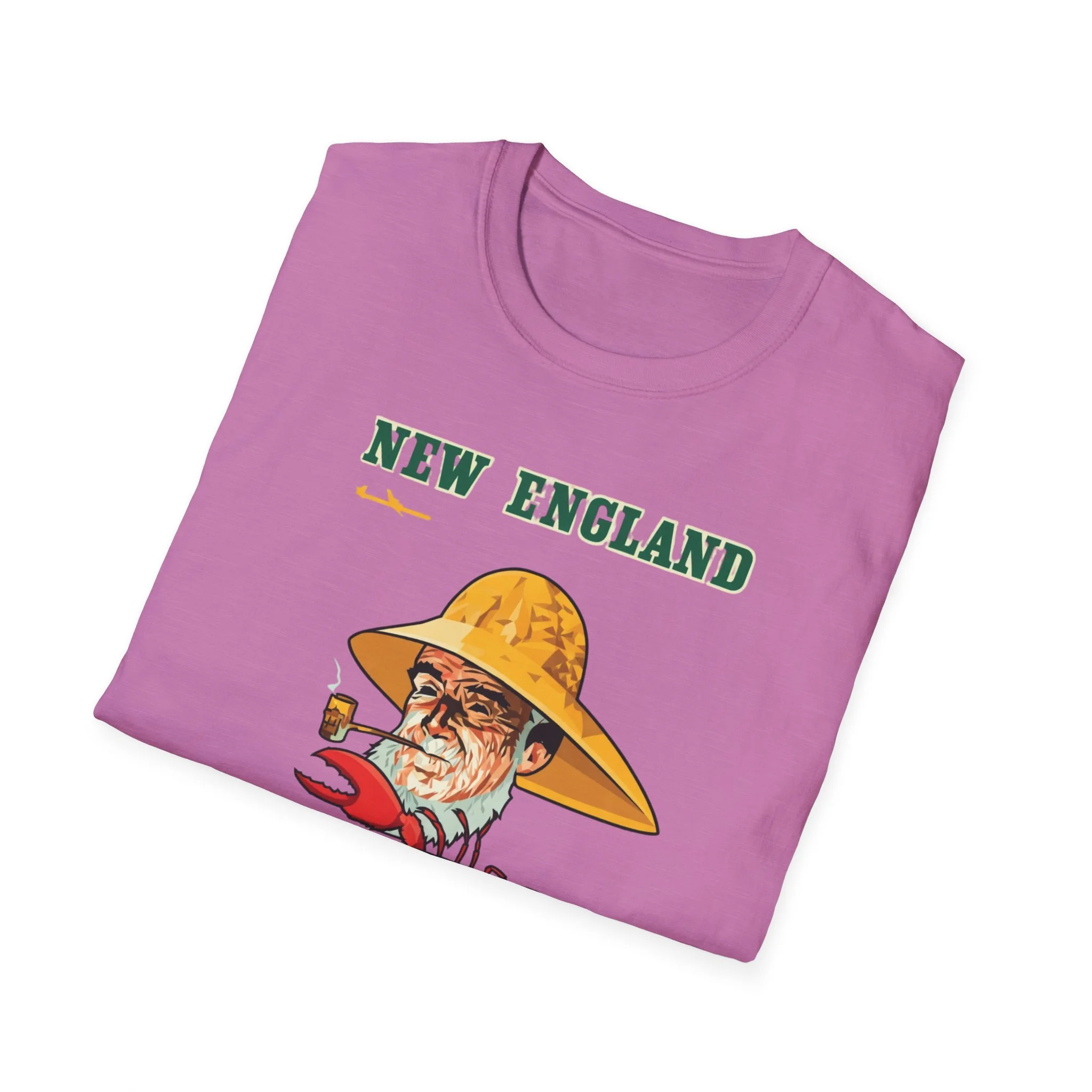 Nothing says classic New England quite like a weathered lobsterman in a yellow sou’wester hat, pipe in mouth, with a couple of bright red lobsters ready for the pot. This fun, larger-than-life illustration captures the spirit of the Northeast coast — the working waterfronts, the fresh seafood shacks, the salty air, and the proud maritime heritage that defines the region from Maine to Massachusetts and beyond. It’s a playful tribute to the hardworking fishermen and the iconic lobster rolls, clambakes, and shore dinners that bring families together every summer. This t-shirt brings that quintessential New England character back to life with the bold “NEW ENGLAND” lettering, the detailed lobster man illustration (complete with pipe and yellow hat), the two lively red lobsters, and the clean “NE NORTHEAST” logo below. Soft, breathable, and built for everyday wear — perfect for beach days, seafood dinners, summer cookouts, or proudly showing off your Northeast roots. Wear it and spark those “Nothing beats a fresh lobster in New England!” stories from anyone who’s ever cracked a claw at a roadside shack or dockside restaurant.