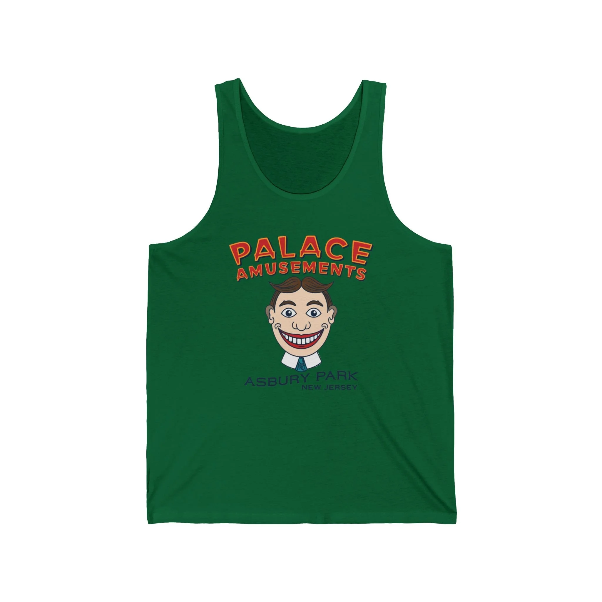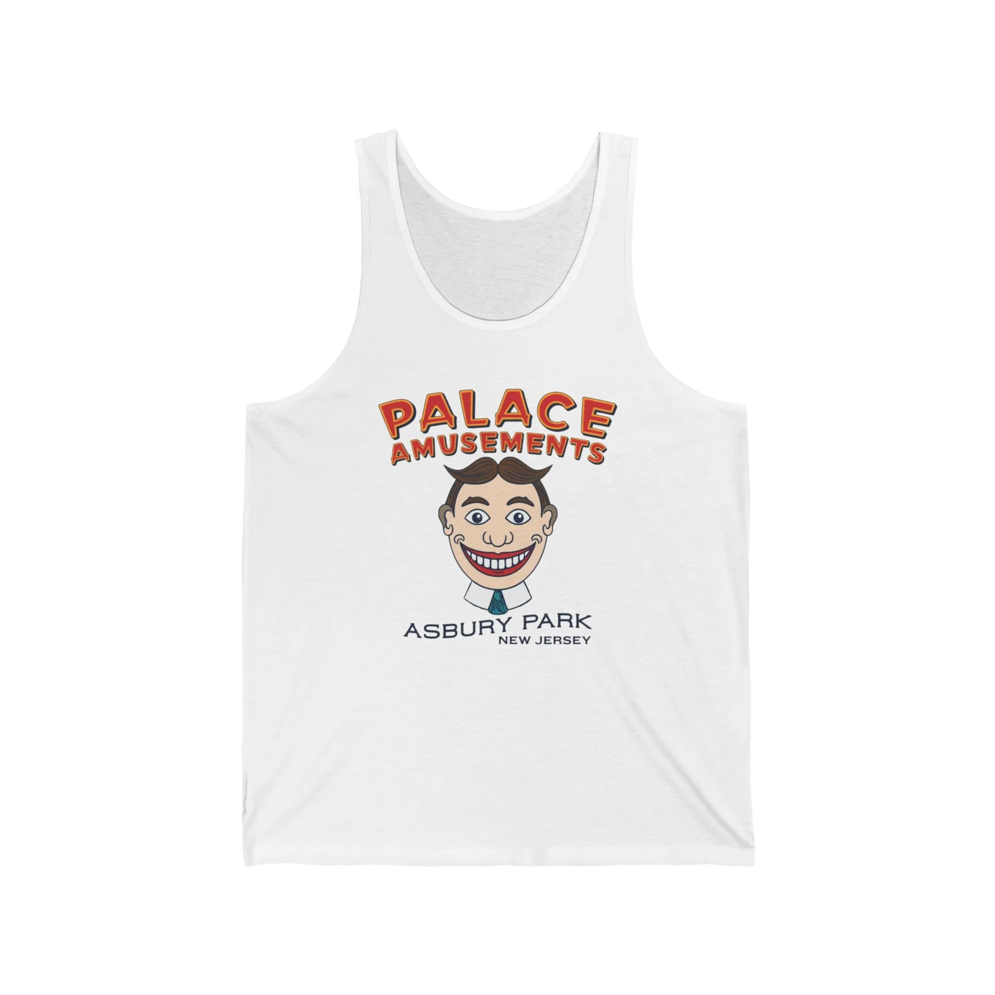 For generations of Jersey Shore kids and families, Palace Amusements in Asbury Park was the place for summer fun. This iconic arcade and amusement center on the boardwalk featured classic games, rides, skee-ball, pinball, and that unforgettable giant smiling face mascot (often called “Tillie”) watching over everything with his big grin and wild eyes. Located right in the heart of Asbury Park’s legendary boardwalk scene, Palace Amusements became a true cultural landmark — a spot where countless memories were made playing games, eating boardwalk treats, and soaking in the vibrant Shore atmosphere until its eventual closure. This lightweight tank brings the classic Palace Amusements charm back with the bold retro “PALACE AMUSEMENTS” lettering and the iconic grinning mascot face, paired with “ASBURY PARK NEW JERSEY” below. Breathable and comfortable for hot summer days at the beach, boardwalk walks, or just repping one of the Jersey Shore’s most beloved lost landmarks. Wear it and spark those “I spent every summer at Palace Amusements!” stories from anyone who grew up on the Asbury Park boardwalk.
