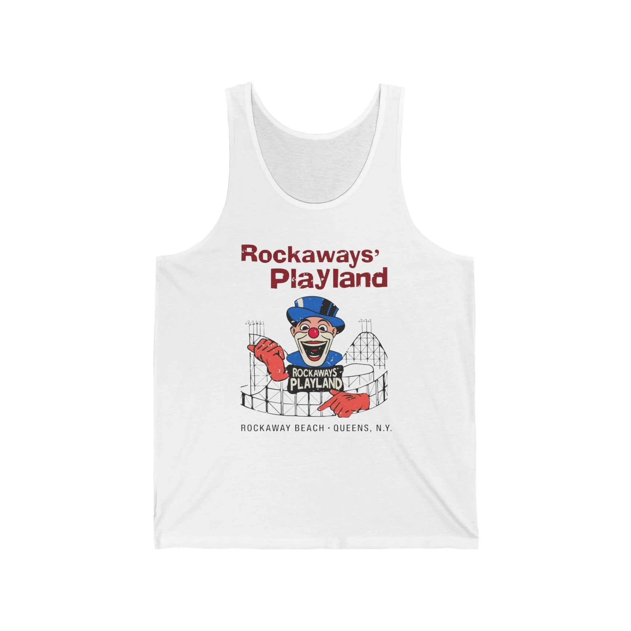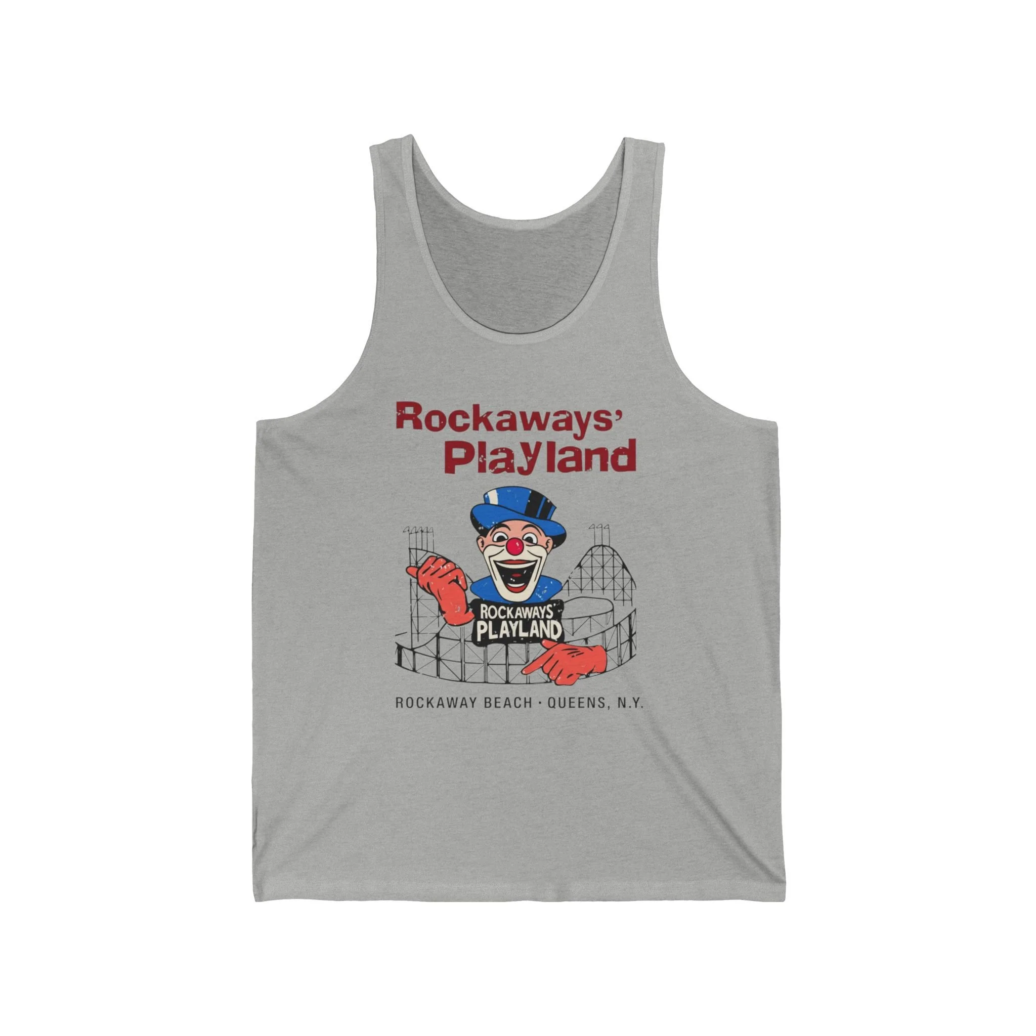 For over 80 years (1928–1987), Rockaways' Playland was the crown jewel of the Rockaway Beach boardwalk in Queens, New York. This classic seaside amusement park delivered pure summer thrills with its iconic roller coaster, carousel, Ferris wheel, funhouse, arcade games, and that unforgettable smiling clown mascot waving from the entrance. Located right on the beach, it was a beloved destination for generations of New York City families looking for affordable fun, saltwater taffy, and boardwalk memories under the sun. This tank brings the classic Rockaways' Playland charm back with the bold retro “Rockaways' Playland” lettering, the cheerful clown mascot, the roller coaster silhouette, and the proud “ROCKAWAY BEACH • QUEENS, N.Y.” detail below. Lightweight and breathable for hot summer days at the beach, boardwalk walks, or just repping one of New York’s most cherished lost amusement parks. Wear it and spark those “I spent every summer at Rockaways' Playland!” stories from anyone who grew up riding the rides on the Rockaway peninsula.