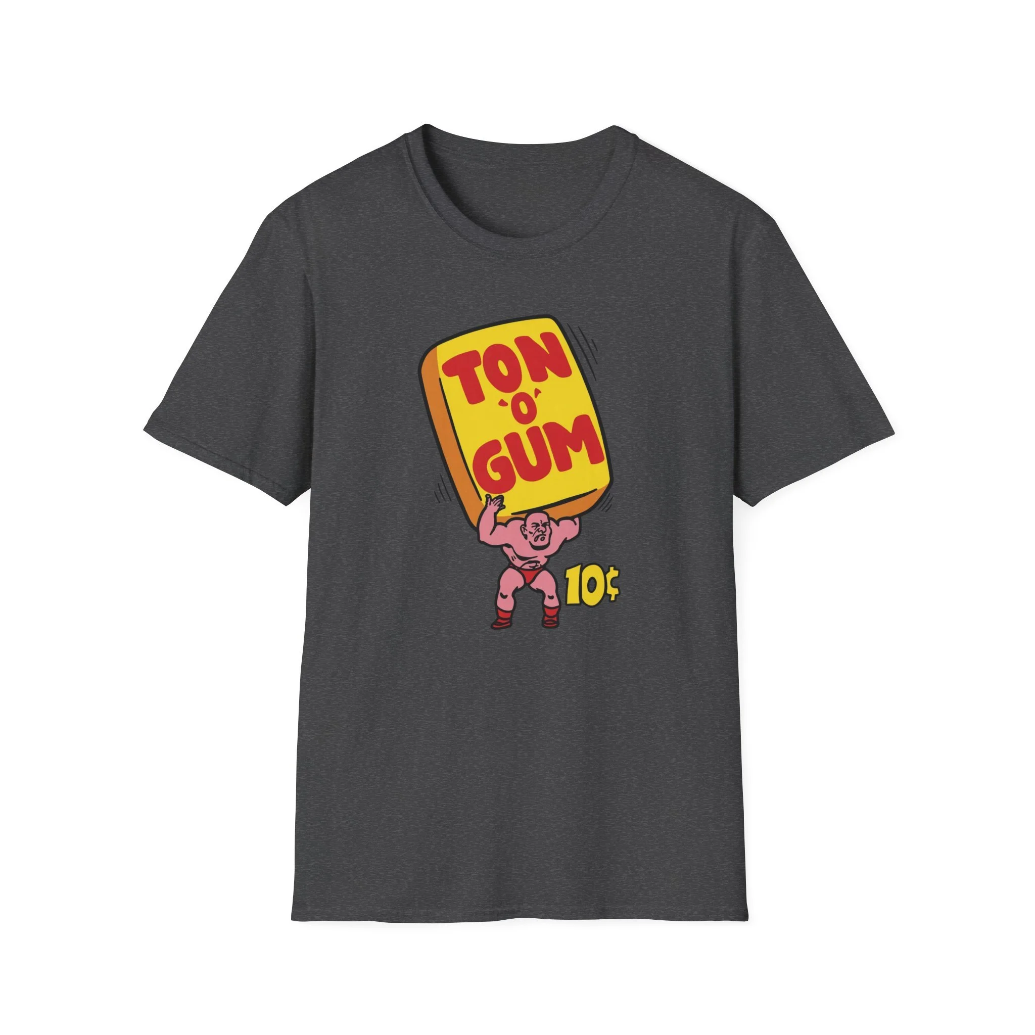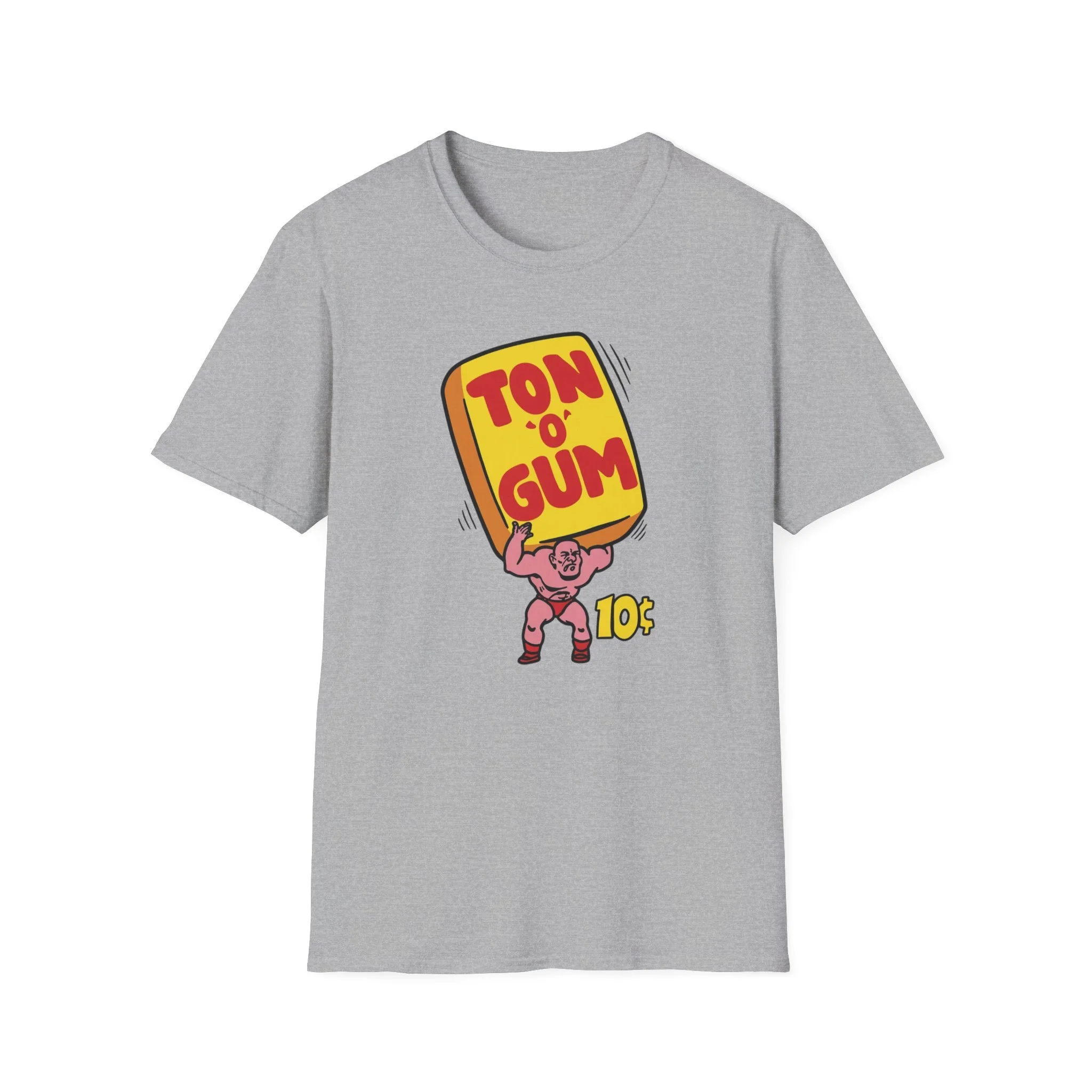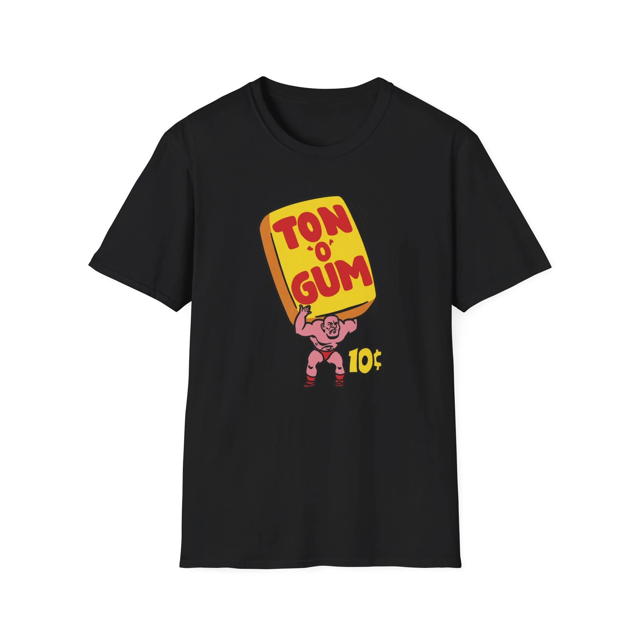 He’s strong. He’s pink. He’s carrying a literal Ton O’ Gum on his back like it’s nothing. This classic retro design brings back one of the most unforgettable penny-candy heroes of all time: the muscle-bound strongman hoisting that giant yellow pack of gum high overhead. With bold red “TON O’ GUM” lettering and that cheeky 10¢ price tag, it perfectly captures the over-the-top excitement of old-school bubble gum that promised more chew for your money than you knew what to do with. Whether you were trading pieces in the schoolyard or stuffing your cheeks until you looked like a chipmunk, Ton O’ Gum was the heavyweight champion of the candy aisle. This shirt brings that larger-than-life cartoon energy right back to your chest. Soft, comfortable, and built for everyday wear (or your next arm-wrestling match at the corner store), this shirt is perfect for: