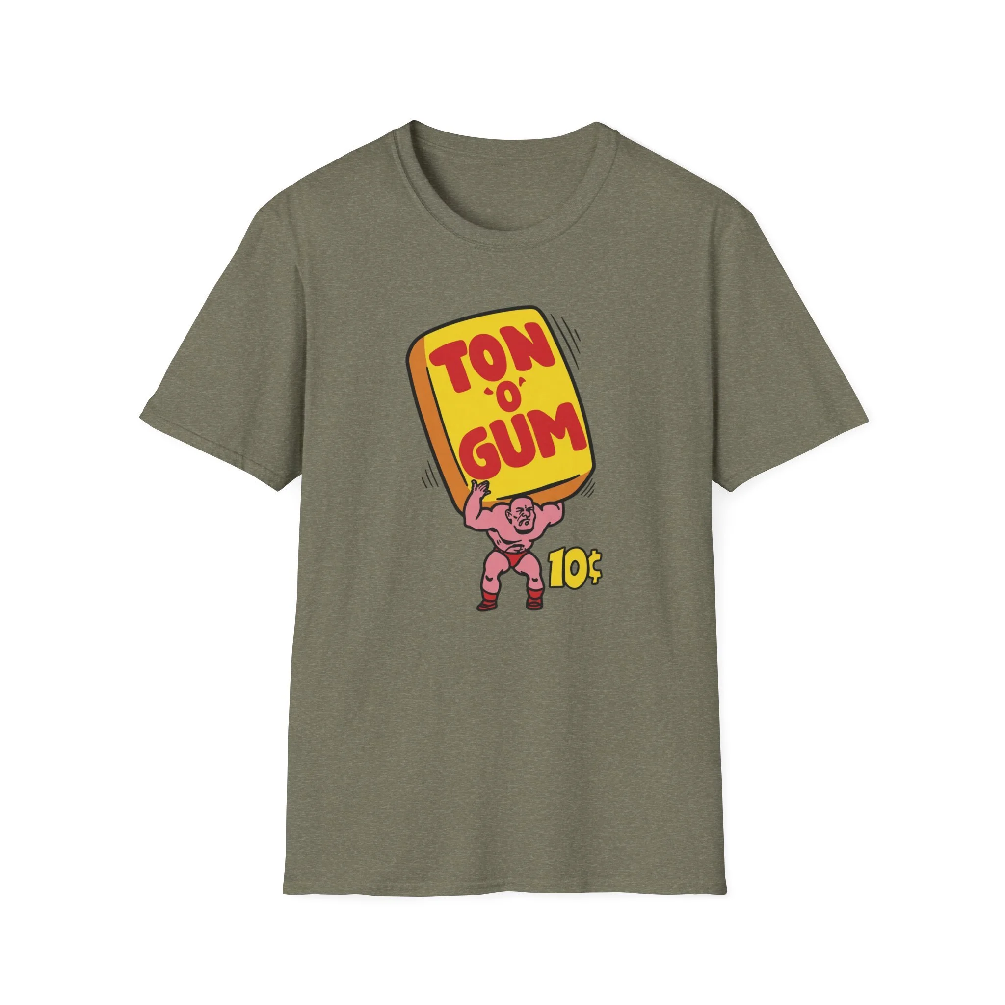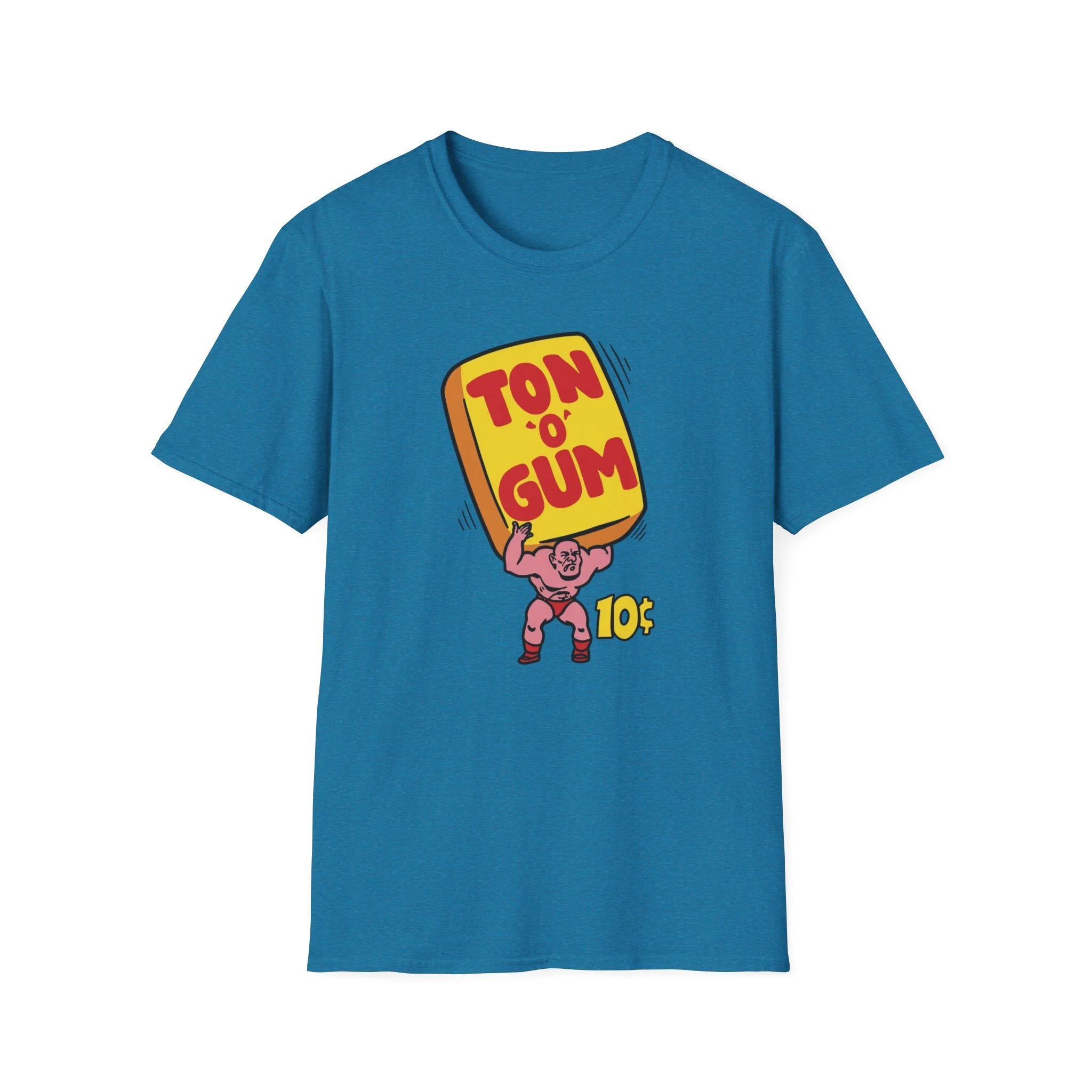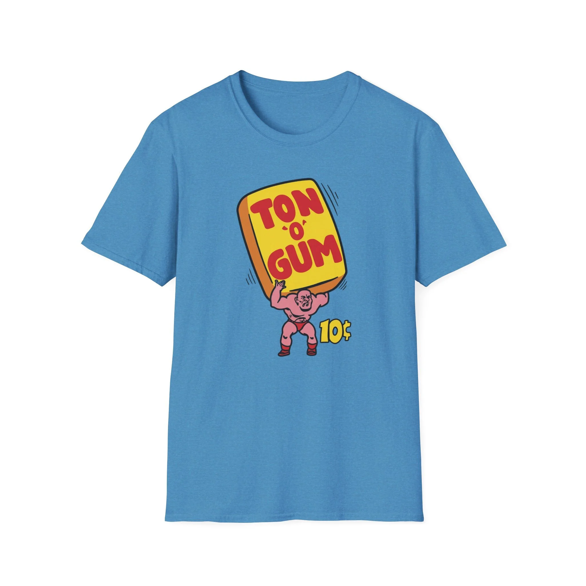 He’s strong. He’s pink. He’s carrying a literal Ton O’ Gum on his back like it’s nothing. This classic retro design brings back one of the most unforgettable penny-candy heroes of all time: the muscle-bound strongman hoisting that giant yellow pack of gum high overhead. With bold red “TON O’ GUM” lettering and that cheeky 10¢ price tag, it perfectly captures the over-the-top excitement of old-school bubble gum that promised more chew for your money than you knew what to do with. Whether you were trading pieces in the schoolyard or stuffing your cheeks until you looked like a chipmunk, Ton O’ Gum was the heavyweight champion of the candy aisle. This shirt brings that larger-than-life cartoon energy right back to your chest. Soft, comfortable, and built for everyday wear (or your next arm-wrestling match at the corner store), this shirt is perfect for: