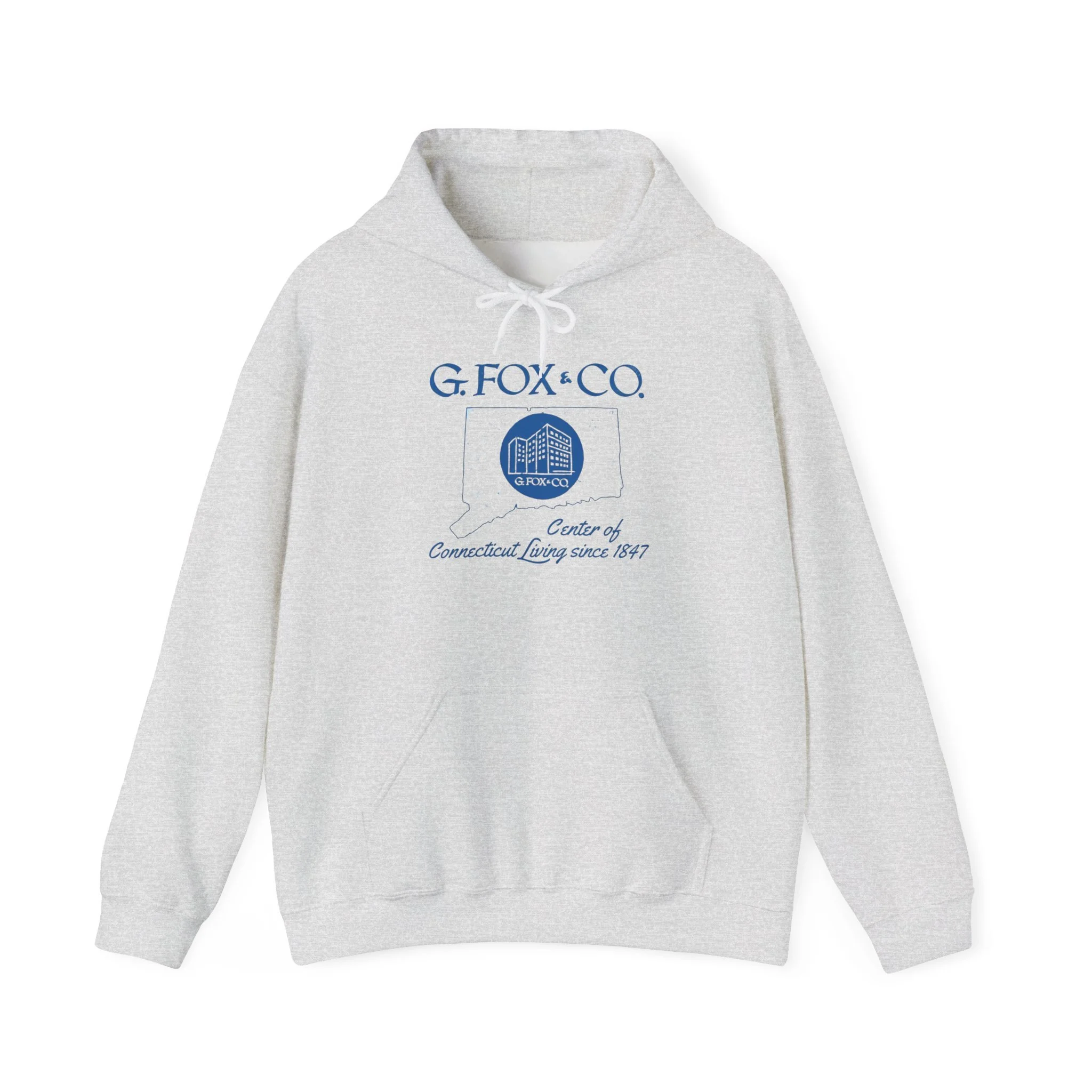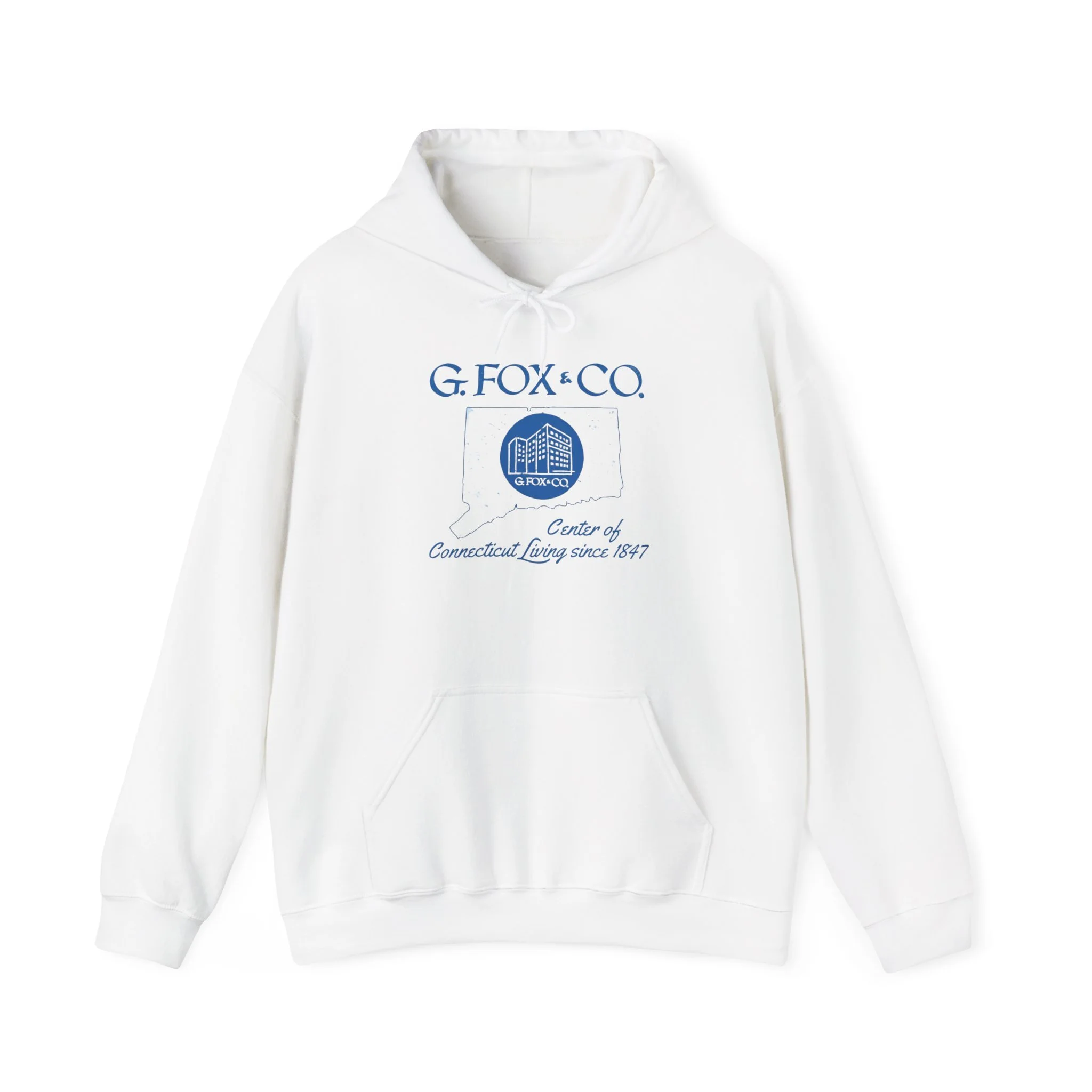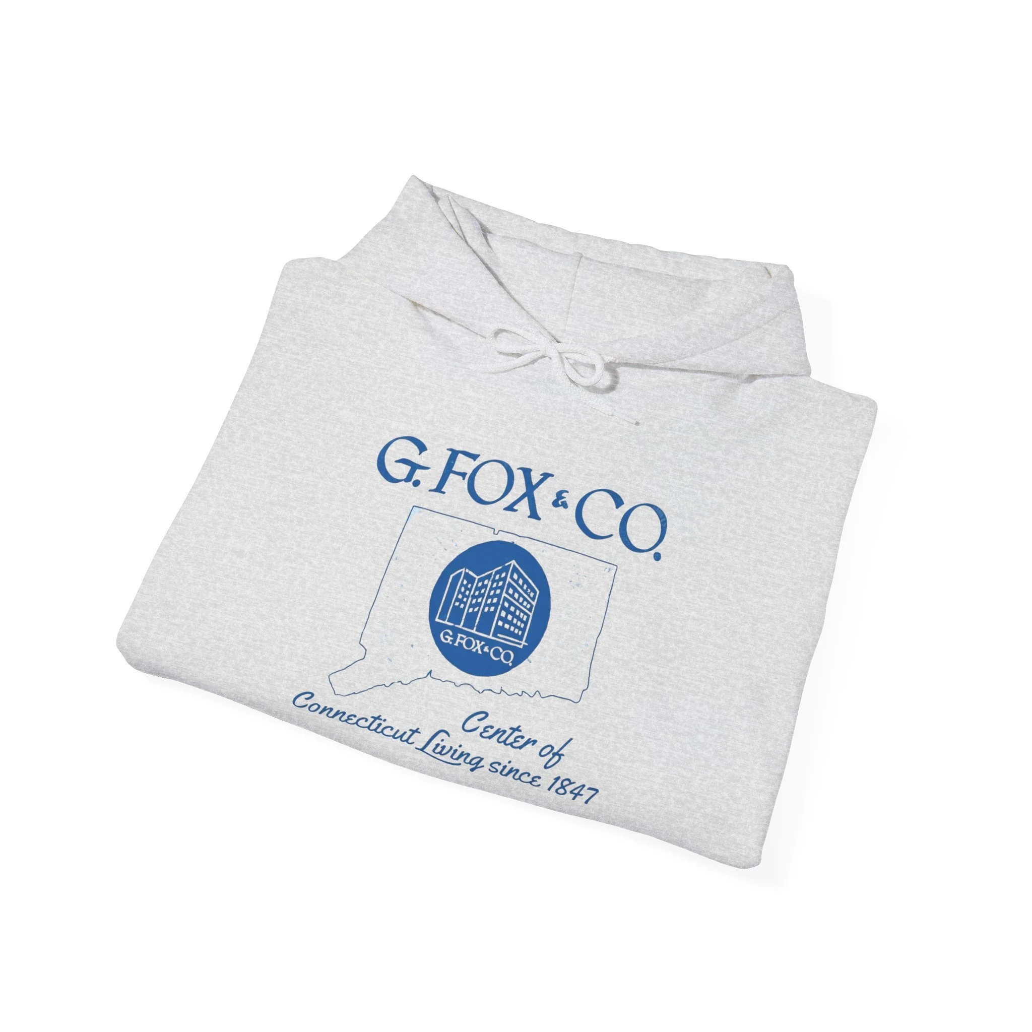For over 140 years, G. Fox & Co. was the undisputed king of Connecticut retail. Founded in 1847 in Hartford, this legendary department store became a true New England institution — known for its elegant flagship on Main Street, exceptional service, quality merchandise, and that unmistakable sense of pride that came with shopping “at the Fox.” Generations of Connecticut families made special trips downtown for back-to-school clothes, holiday shopping, fine china, furniture, and those memorable Christmas window displays. Even after the flagship closed in the mid-1990s, G. Fox remains a cherished symbol of Connecticut’s golden age of local department stores. This cozy cream hoodie brings the classic G. Fox branding back to life with the elegant blue script, the iconic building logo inside the state outline, and the proud tagline “Center of Connecticut Living since 1847.” Ultra-soft mid-weight fleece that’s perfect for crisp Connecticut mornings, weekend errands, or just repping one of the state’s most beloved retail legends in comfort. Wear it and spark those instant “I used to shop at G. Fox every Christmas!” stories from fellow Nutmeggers who still miss the original Main Street experience.