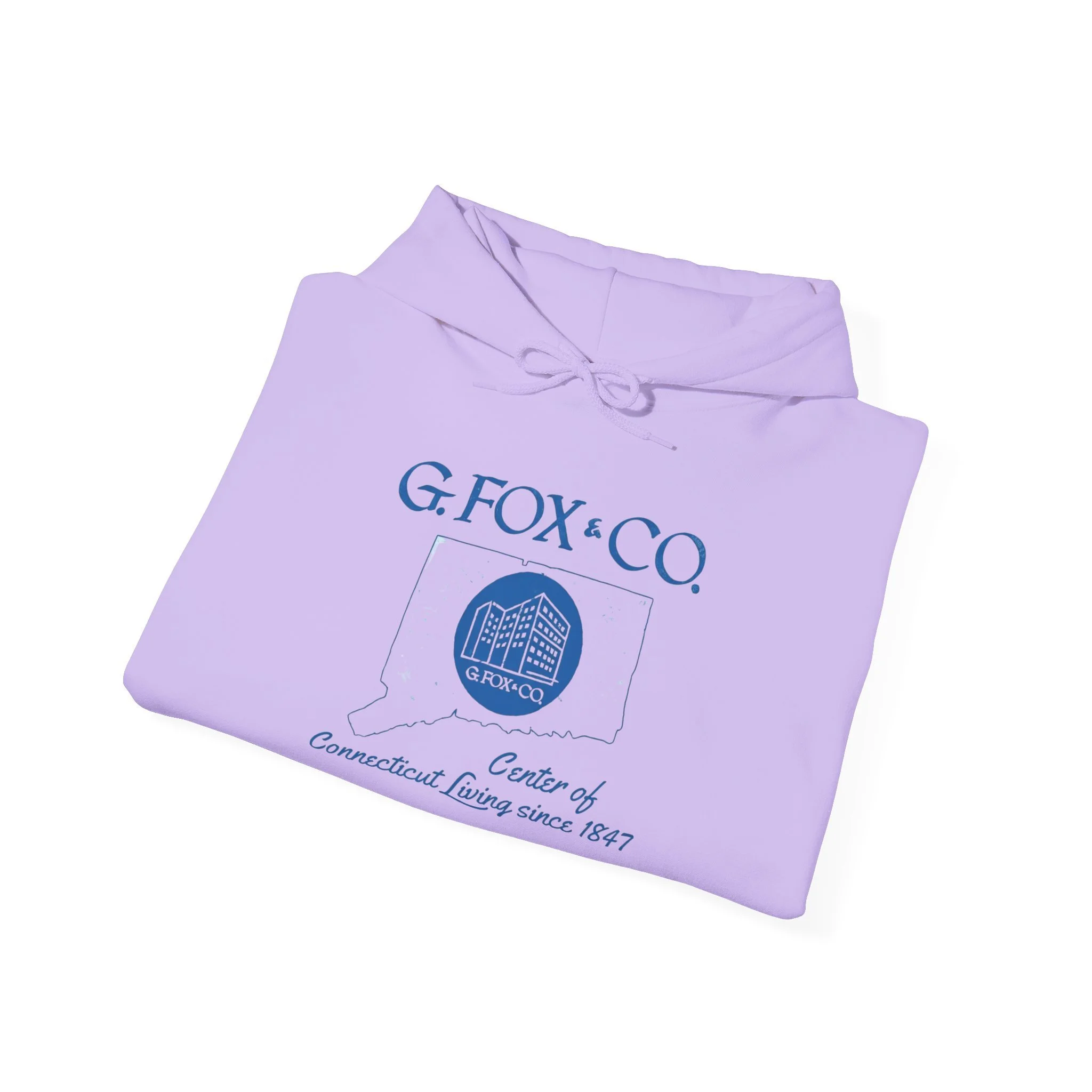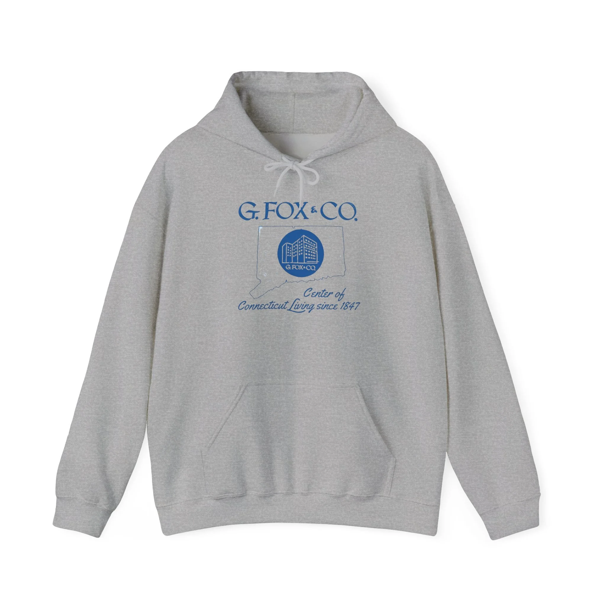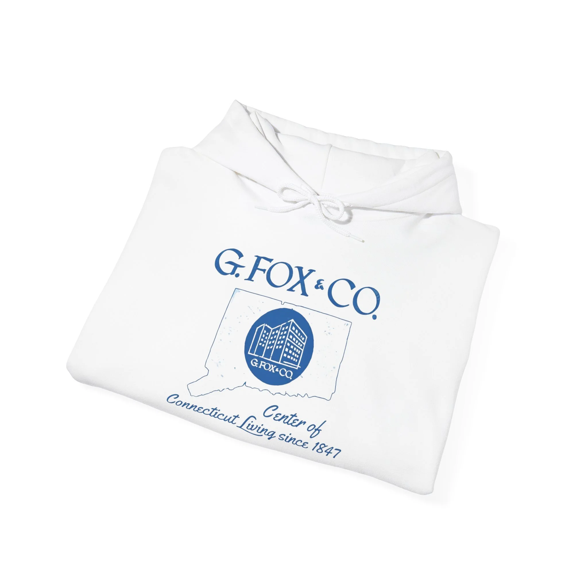 For over 140 years, G. Fox & Co. was the undisputed king of Connecticut retail. Founded in 1847 in Hartford, this legendary department store became a true New England institution — known for its elegant flagship on Main Street, exceptional service, quality merchandise, and that unmistakable sense of pride that came with shopping “at the Fox.” Generations of Connecticut families made special trips downtown for back-to-school clothes, holiday shopping, fine china, furniture, and those memorable Christmas window displays. Even after the flagship closed in the mid-1990s, G. Fox remains a cherished symbol of Connecticut’s golden age of local department stores. This cozy cream hoodie brings the classic G. Fox branding back to life with the elegant blue script, the iconic building logo inside the state outline, and the proud tagline “Center of Connecticut Living since 1847.” Ultra-soft mid-weight fleece that’s perfect for crisp Connecticut mornings, weekend errands, or just repping one of the state’s most beloved retail legends in comfort. Wear it and spark those instant “I used to shop at G. Fox every Christmas!” stories from fellow Nutmeggers who still miss the original Main Street experience.