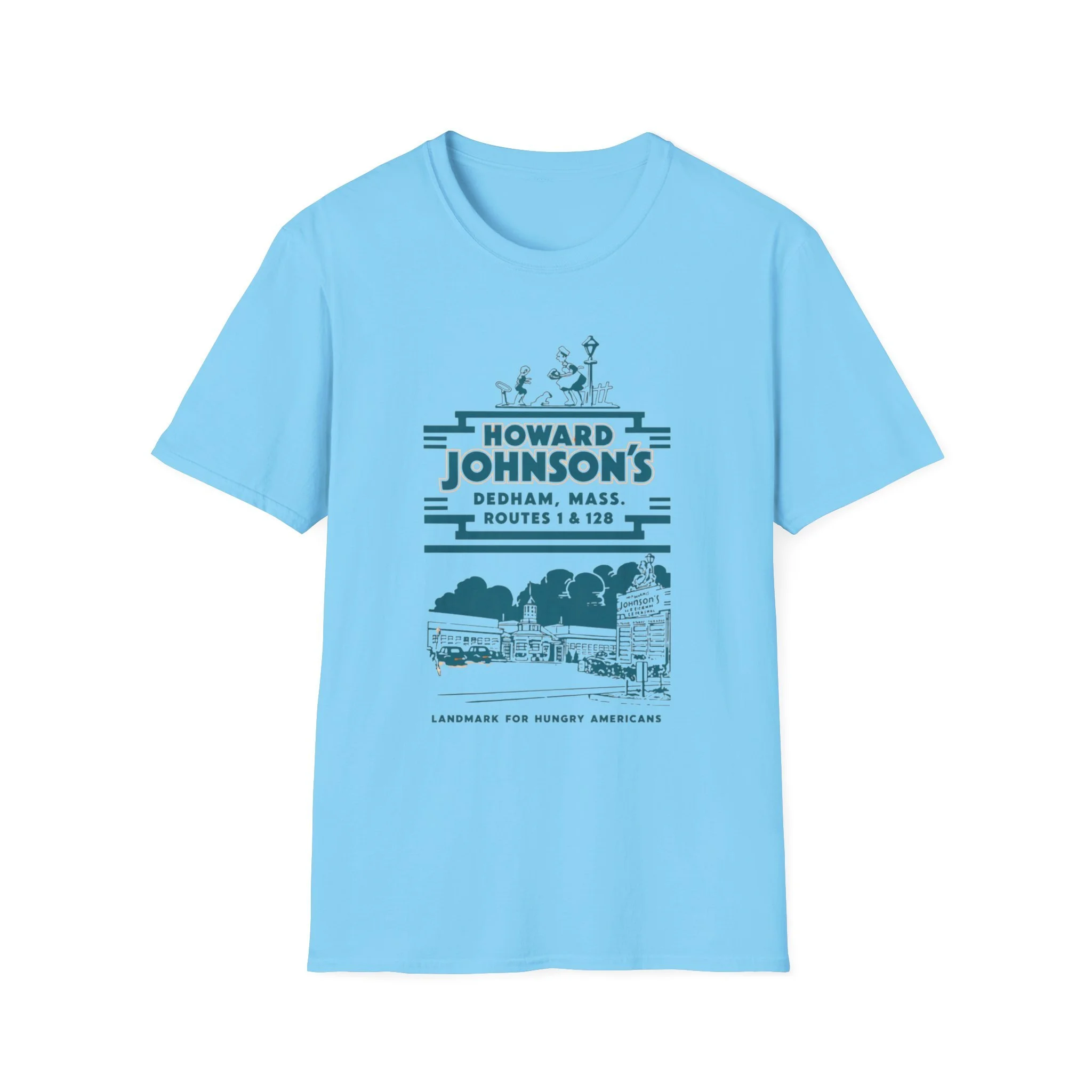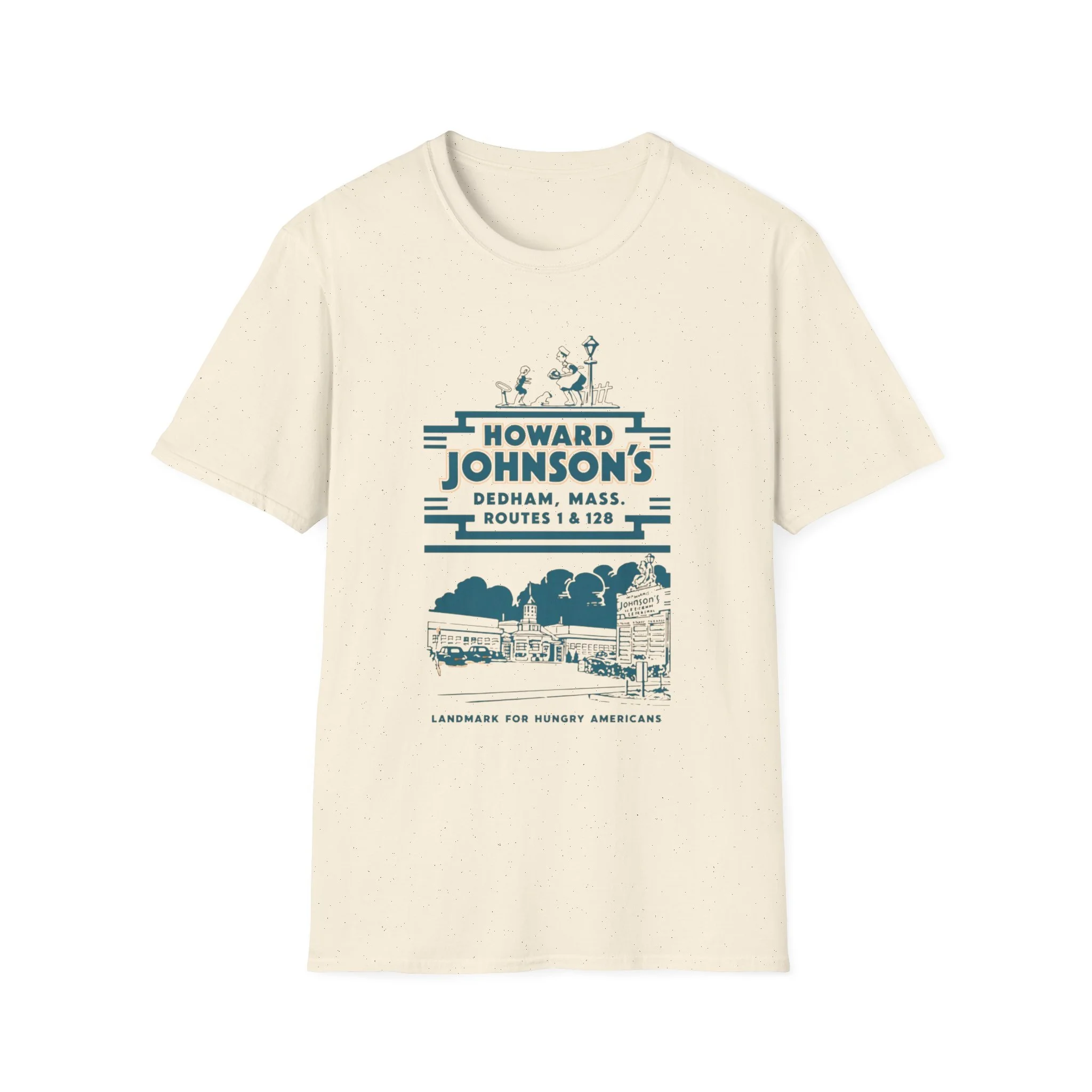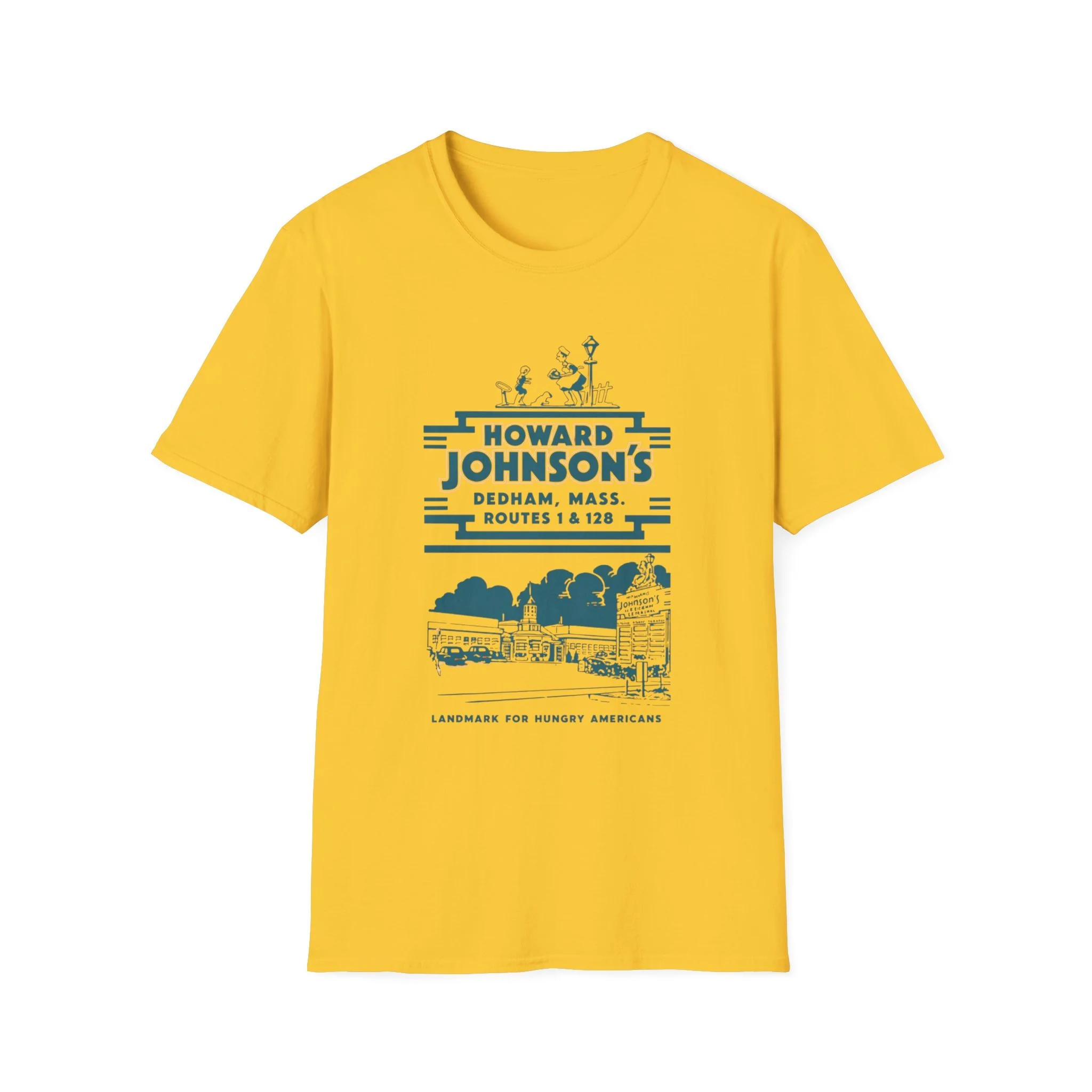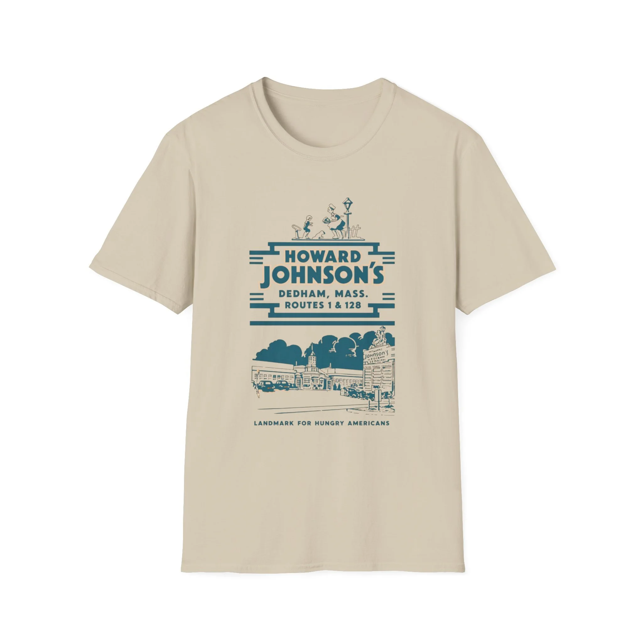 For generations of travelers along Routes 1 and 128 in Dedham, Massachusetts, the orange roof of Howard Johnson’s was a beloved landmark. This classic restaurant and motor lodge served as a reliable stop for hungry families, road-trippers, and locals craving the famous fried clams, hot dogs, ice cream, and 28 flavors. The distinctive architecture, the Simple Simon and the Pieman characters atop the sign, and the proud tagline “Landmark for Hungry Americans” made every HoJo’s location feel like a welcoming destination rather than just another stop on the highway. This t-shirt brings the classic Dedham Howard Johnson’s location back to life with the detailed retro illustration of the restaurant and sign, “HOWARD JOHNSON’S” in bold lettering, the specific “DEDHAM, MASS. ROUTES 1 & 128” location text, and the iconic “LANDMARK FOR HUNGRY AMERICANS” slogan below. Soft, breathable, and built for everyday wear — perfect for anyone who remembers pulling off the road for a meal under the orange roof in Dedham. Wear it and spark those “We always stopped at the Howard Johnson’s in Dedham!” stories from fellow New Englanders who grew up with the familiar orange rooftops lining the highways.