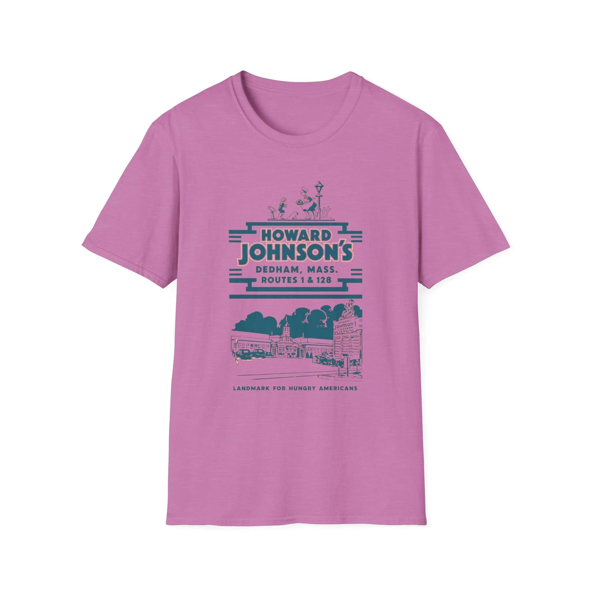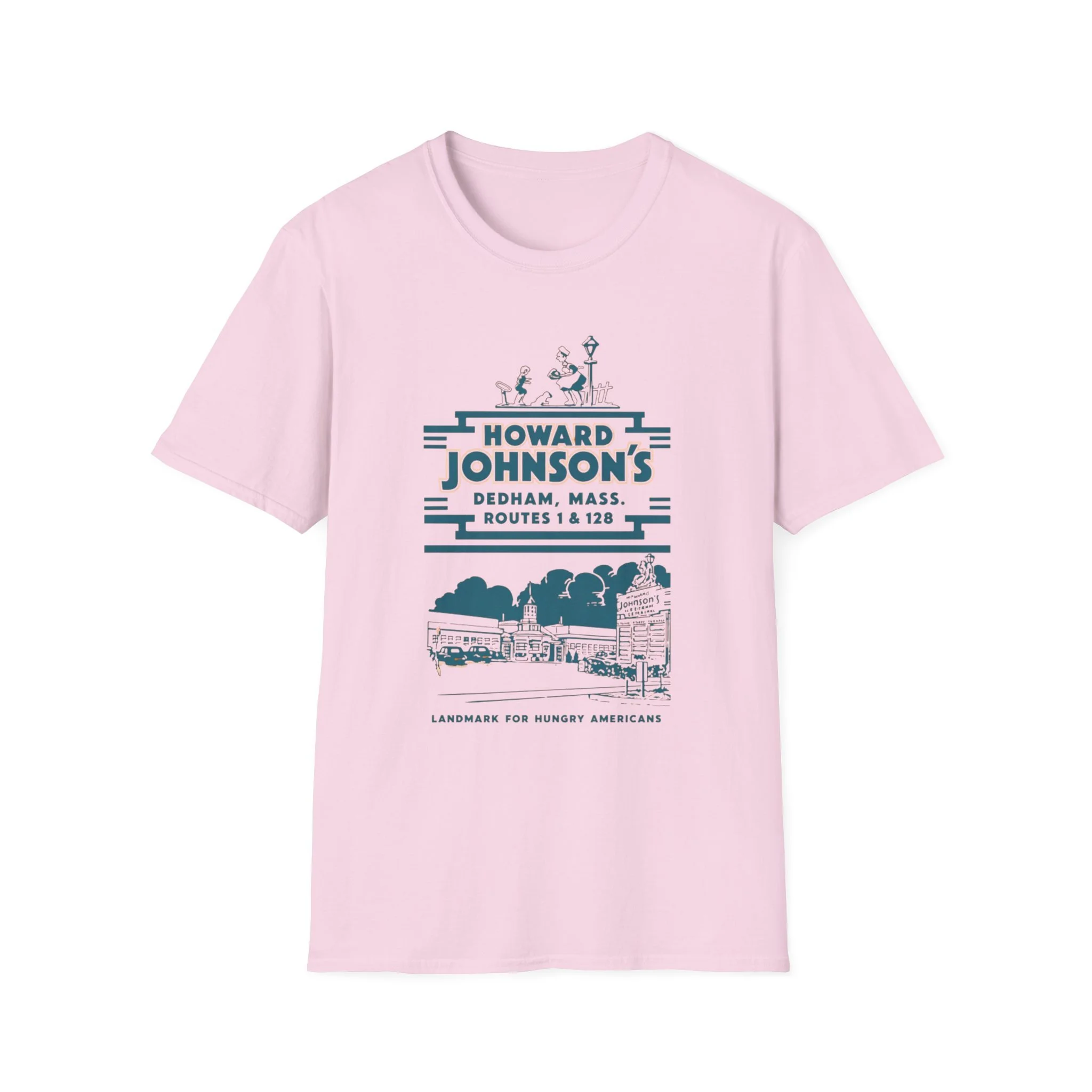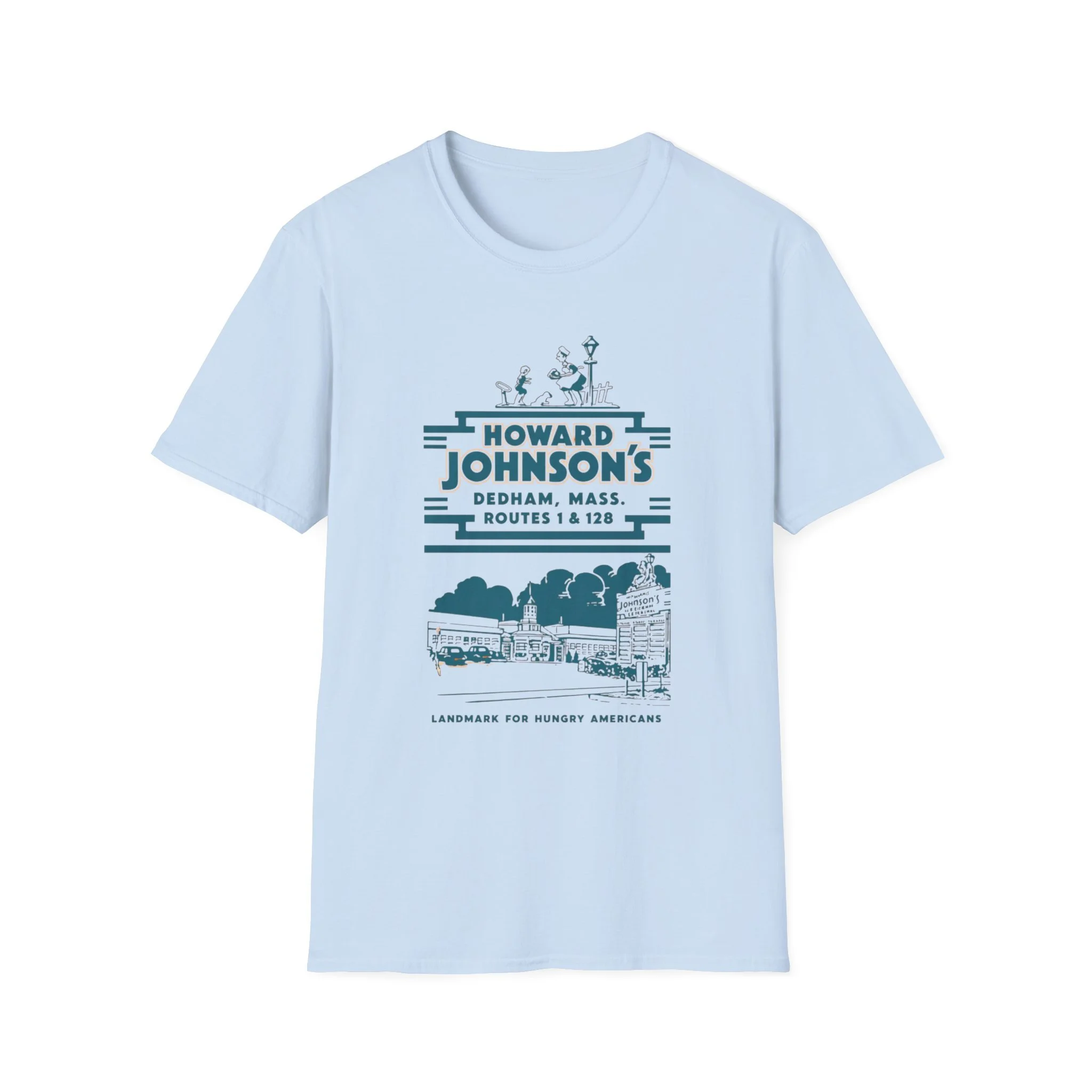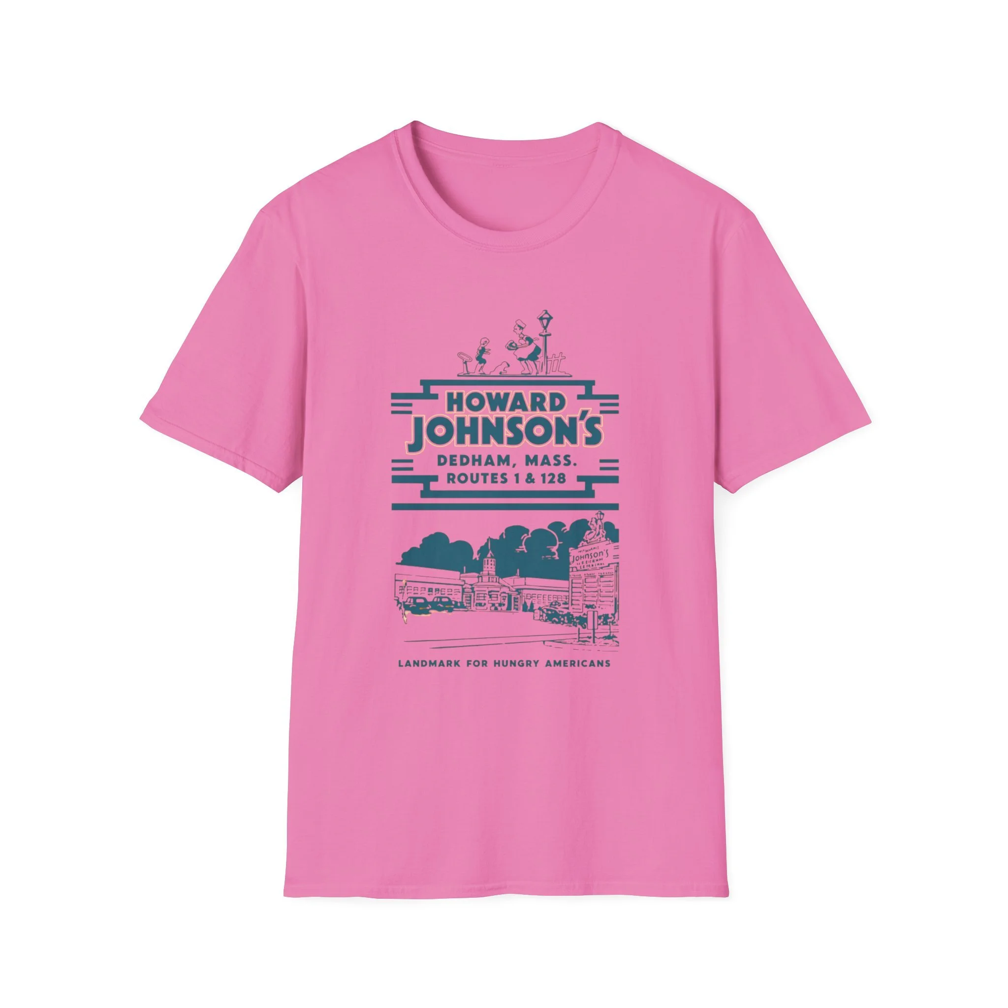 For generations of travelers along Routes 1 and 128 in Dedham, Massachusetts, the orange roof of Howard Johnson’s was a beloved landmark. This classic restaurant and motor lodge served as a reliable stop for hungry families, road-trippers, and locals craving the famous fried clams, hot dogs, ice cream, and 28 flavors. The distinctive architecture, the Simple Simon and the Pieman characters atop the sign, and the proud tagline “Landmark for Hungry Americans” made every HoJo’s location feel like a welcoming destination rather than just another stop on the highway. This t-shirt brings the classic Dedham Howard Johnson’s location back to life with the detailed retro illustration of the restaurant and sign, “HOWARD JOHNSON’S” in bold lettering, the specific “DEDHAM, MASS. ROUTES 1 & 128” location text, and the iconic “LANDMARK FOR HUNGRY AMERICANS” slogan below. Soft, breathable, and built for everyday wear — perfect for anyone who remembers pulling off the road for a meal under the orange roof in Dedham. Wear it and spark those “We always stopped at the Howard Johnson’s in Dedham!” stories from fellow New Englanders who grew up with the familiar orange rooftops lining the highways.
