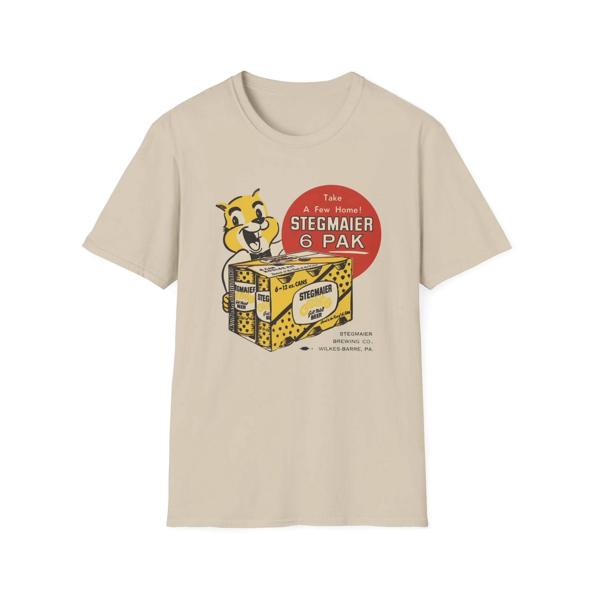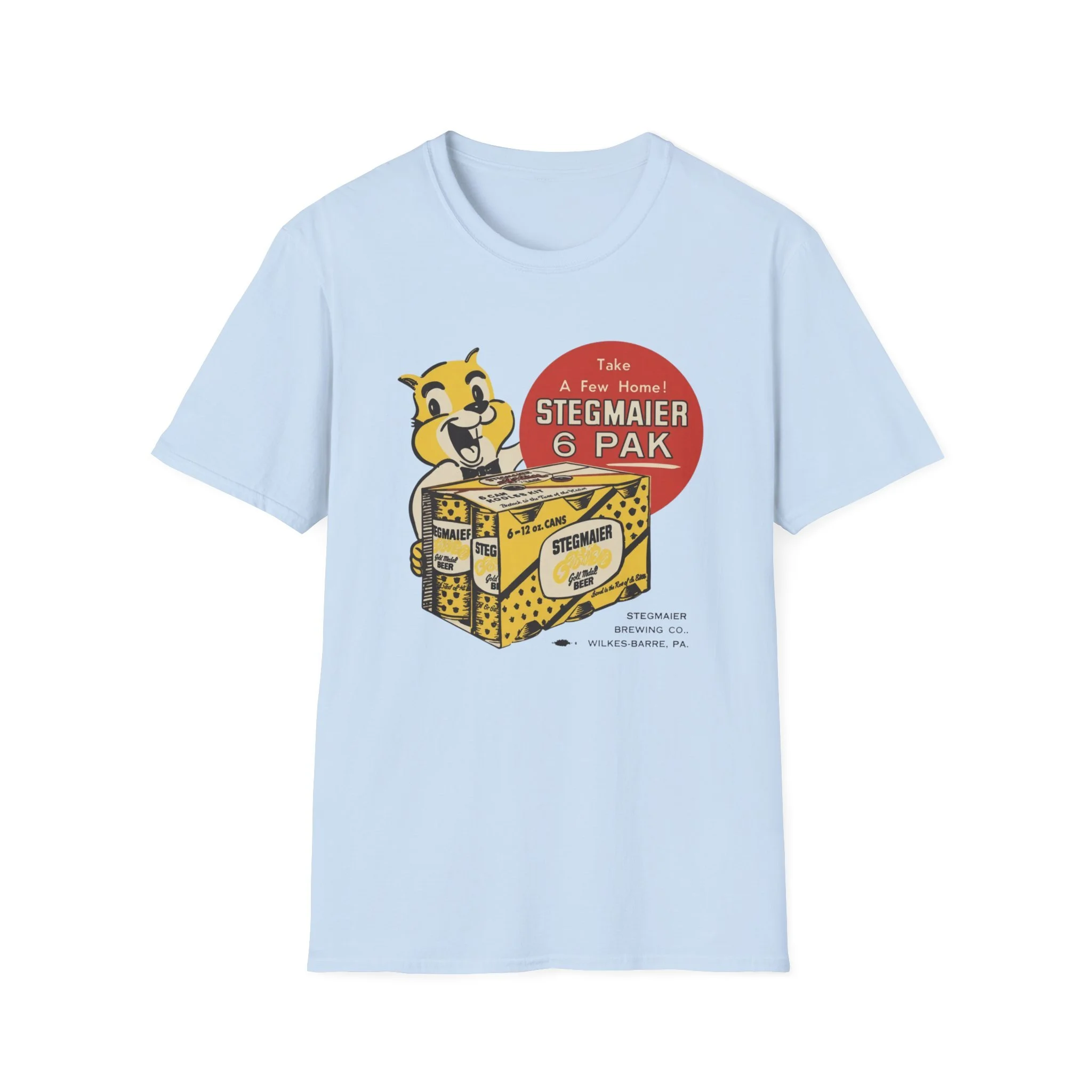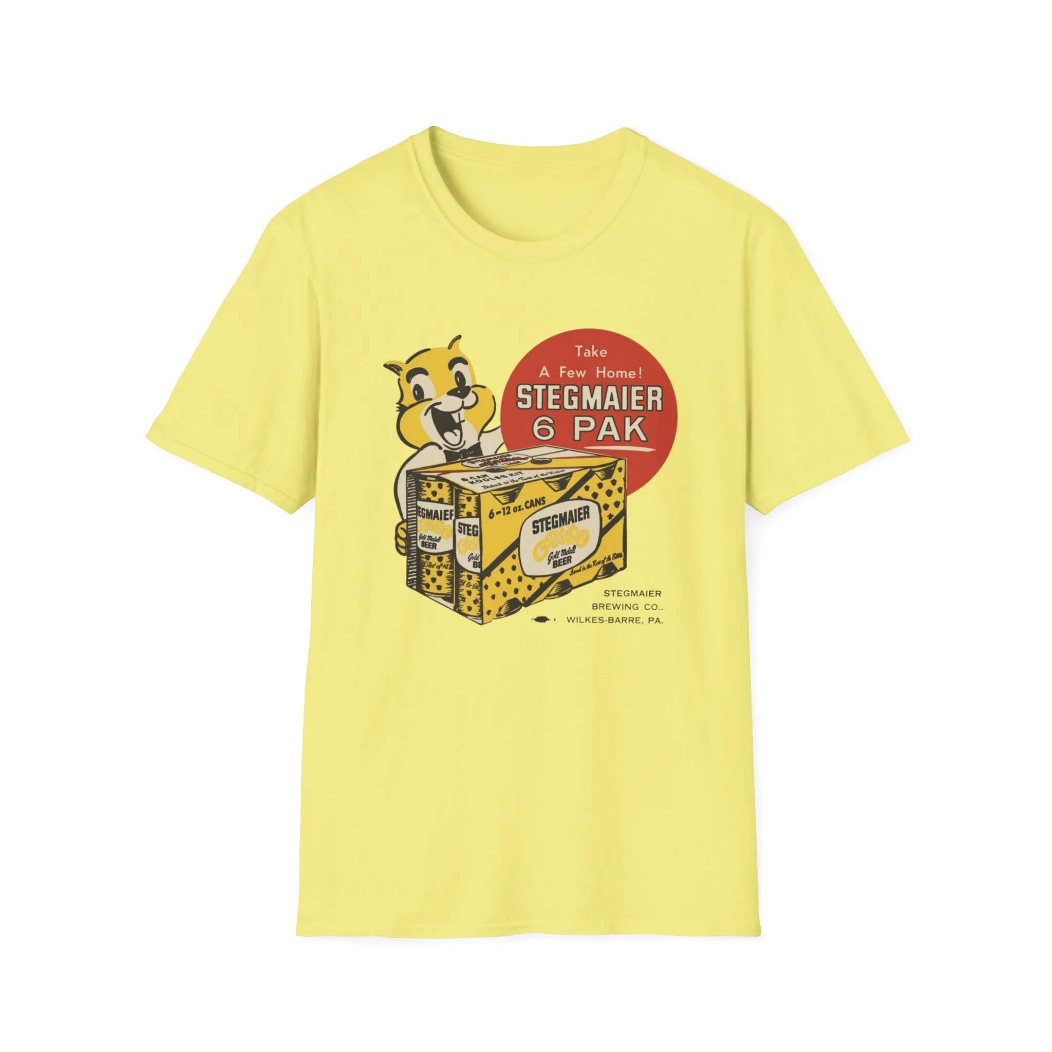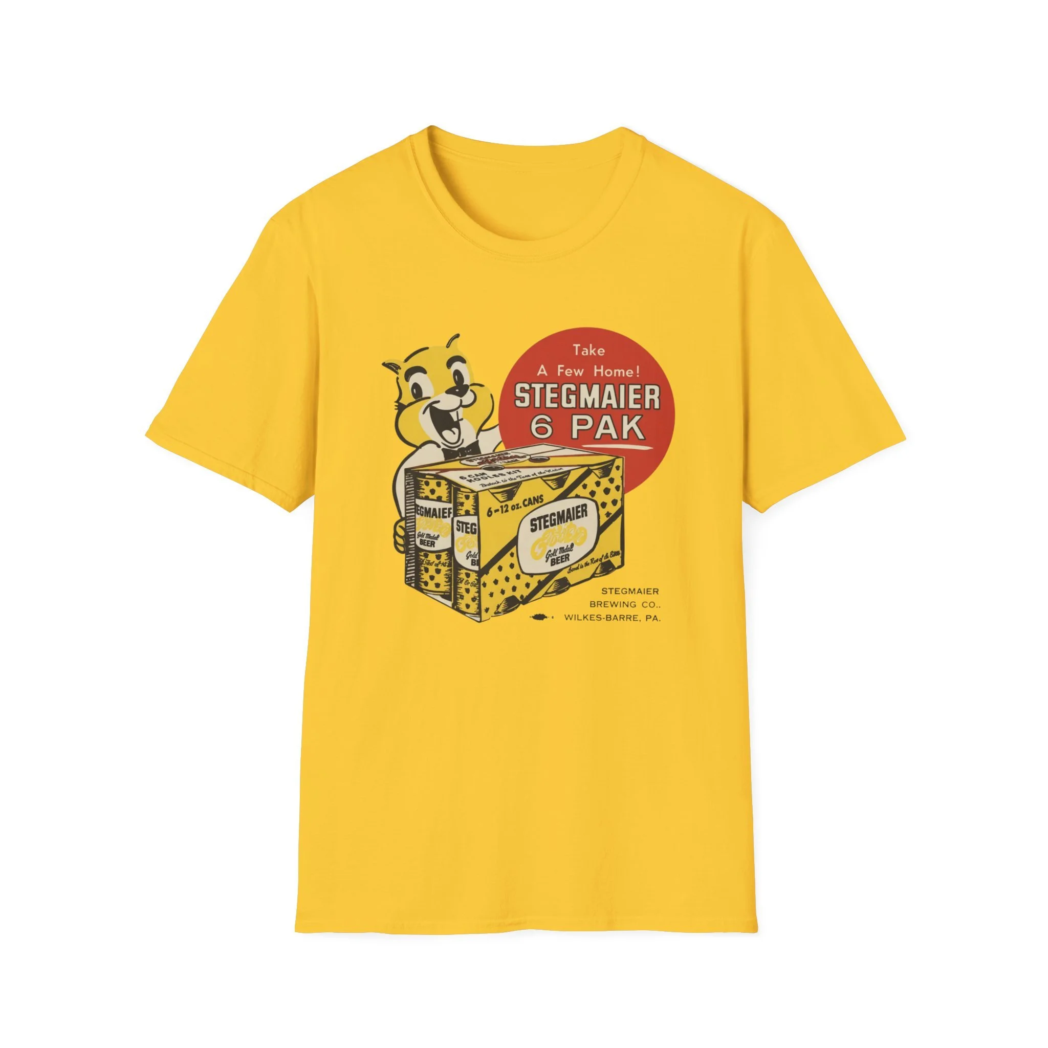 For generations of Northeast beer drinkers, especially in Pennsylvania’s Coal Region and beyond, Stegmaier was the local favorite. Brewed in Wilkes-Barre, this classic Pennsylvania beer was famous for its smooth taste and the cheerful squirrel mascot that invited fans to “Take A Few Home!” The bright yellow-and-black 6-pak carrier with the bold “Stegmaier” branding became a staple in coolers at ballgames, backyard cookouts, hunting camps, and corner bars throughout the region. This t-shirt brings the classic Stegmaier 6-pak back to life with the happy squirrel mascot proudly holding the case of cans, the big red “Take A Few Home! STEGMAIER 6 PAK” circle, and the proud “STEGMAIER BREWING CO. WILKES-BARRE, PA.” detail below. Soft, breathable, and built for everyday wear — perfect for Pennsylvania natives, former Steg drinkers, or anyone who still gets nostalgic for that old-school regional brew. Wear it and spark those “Steg 6-pak on game day!” stories from anyone who remembers grabbing a case from the local distributor or seeing the squirrel on the packaging in the cooler.