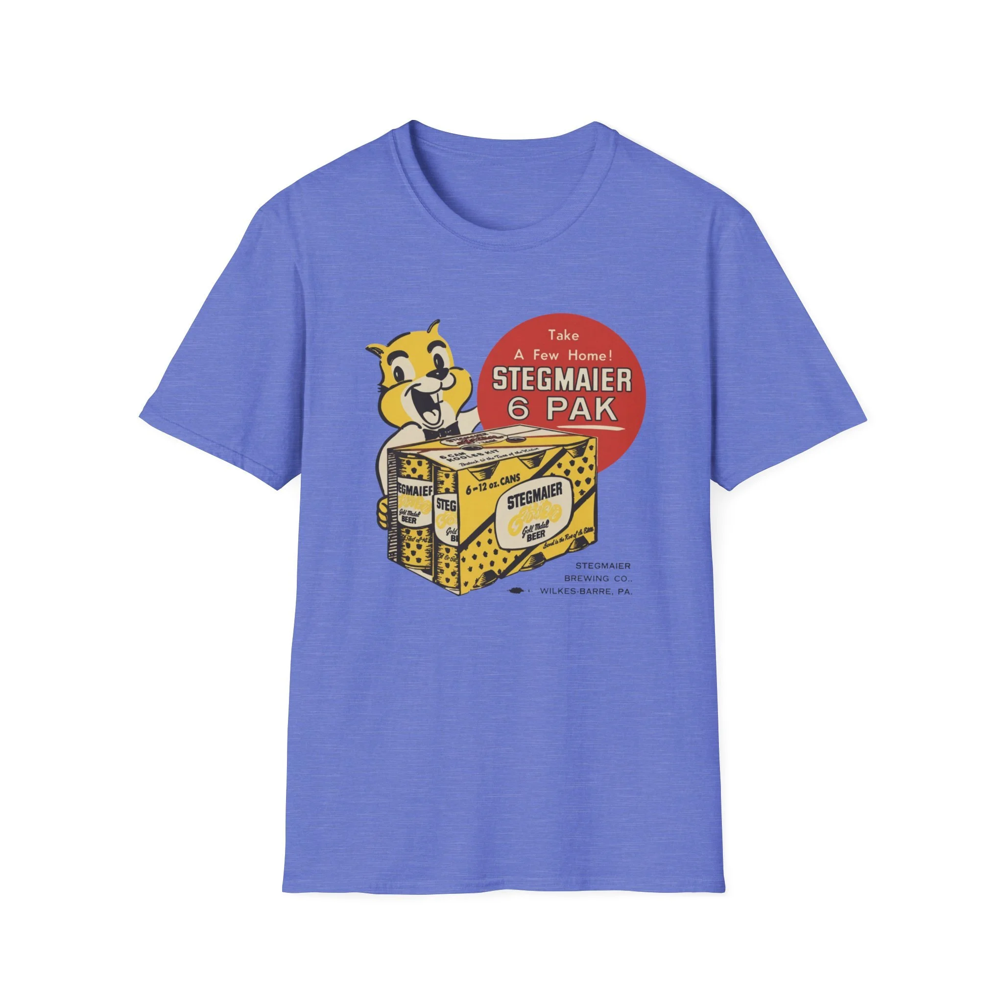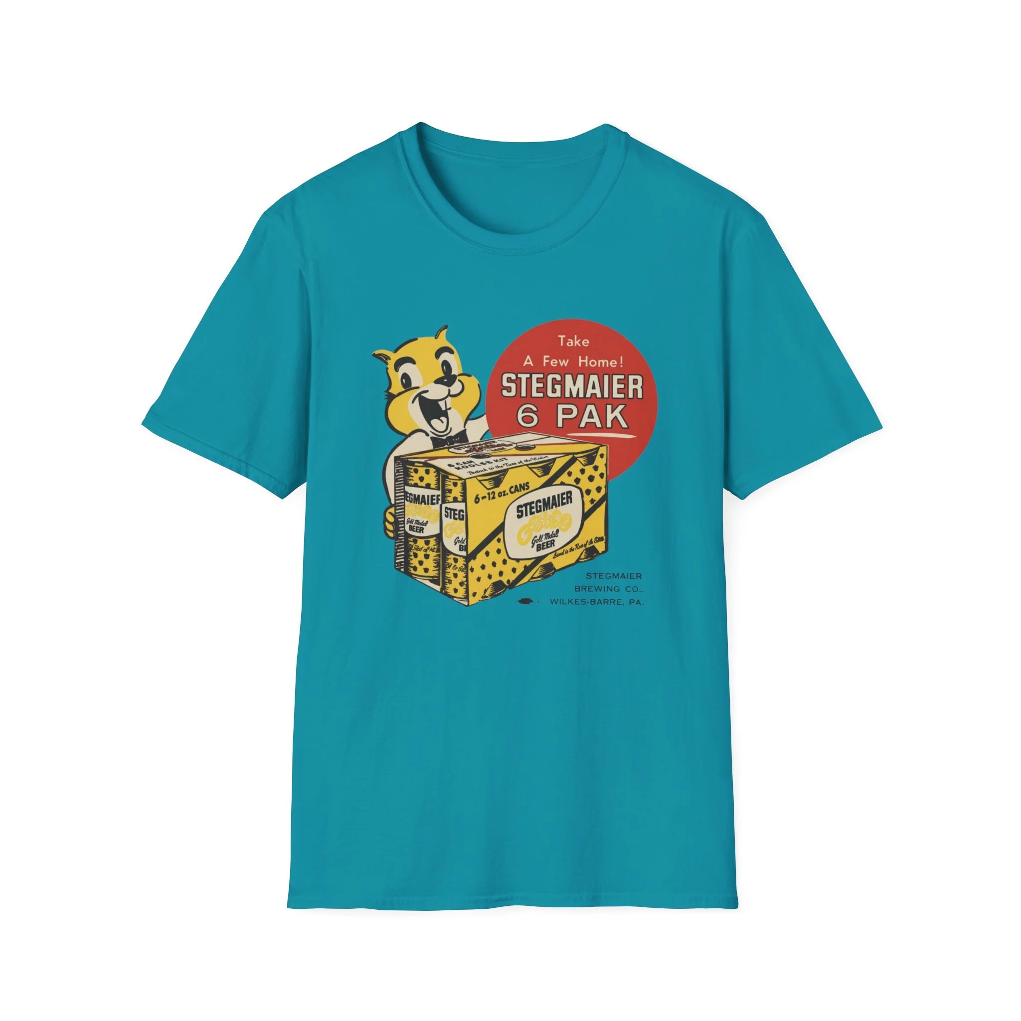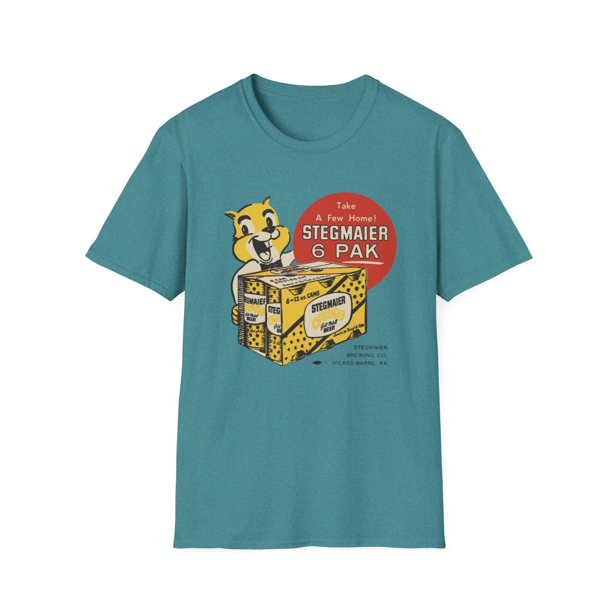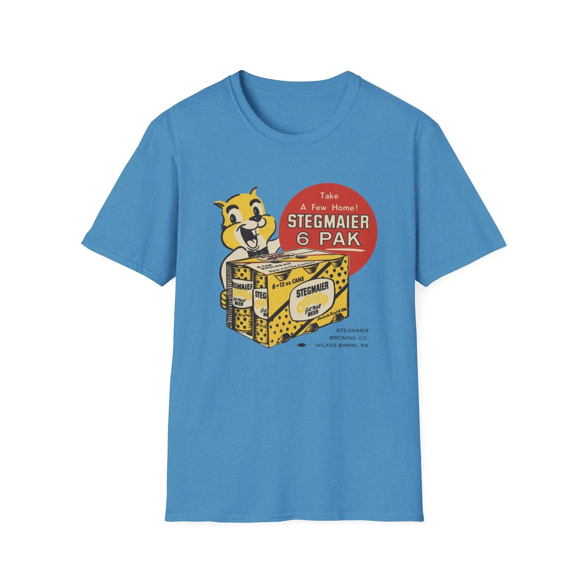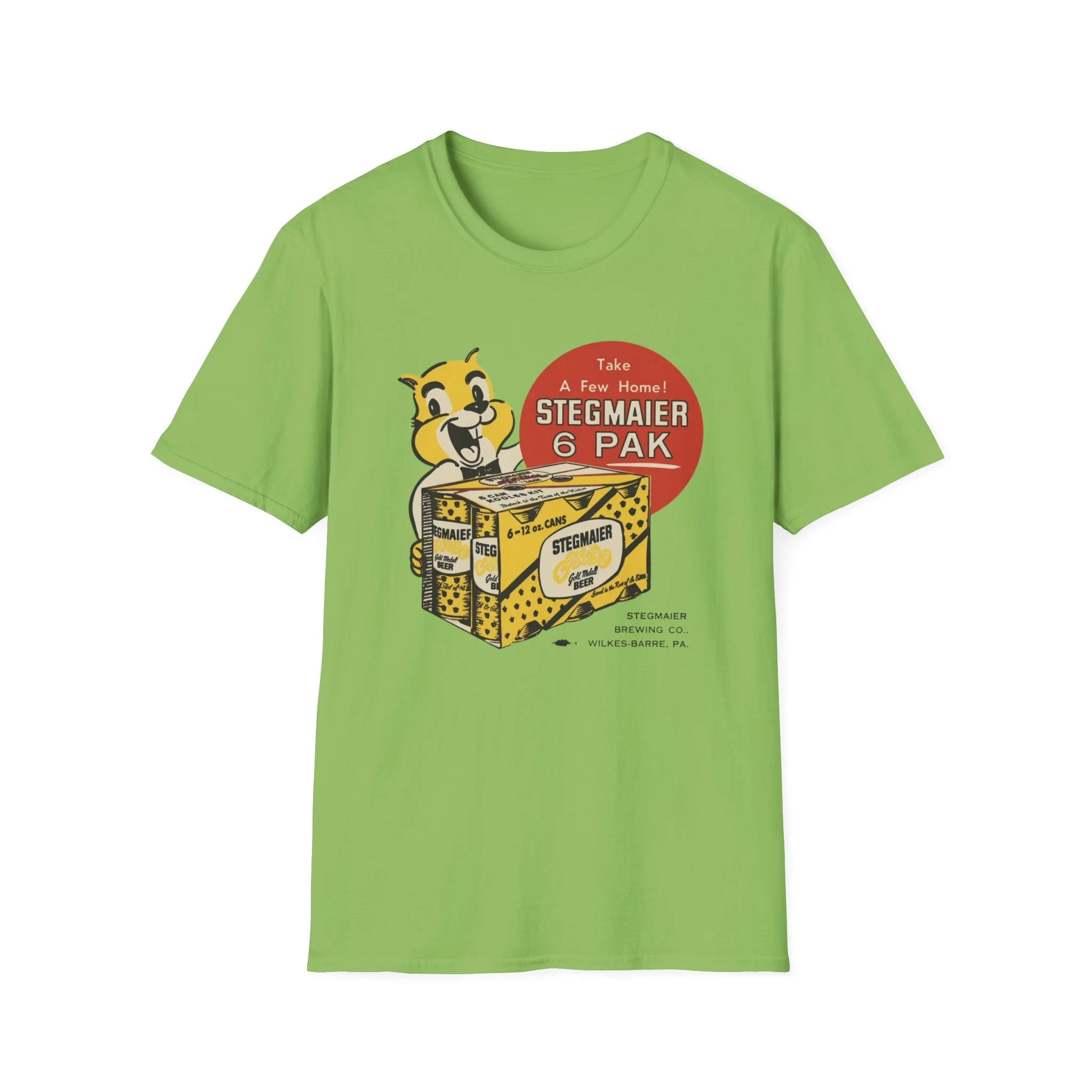 For generations of Northeast beer drinkers, especially in Pennsylvania’s Coal Region and beyond, Stegmaier was the local favorite. Brewed in Wilkes-Barre, this classic Pennsylvania beer was famous for its smooth taste and the cheerful squirrel mascot that invited fans to “Take A Few Home!” The bright yellow-and-black 6-pak carrier with the bold “Stegmaier” branding became a staple in coolers at ballgames, backyard cookouts, hunting camps, and corner bars throughout the region. This t-shirt brings the classic Stegmaier 6-pak back to life with the happy squirrel mascot proudly holding the case of cans, the big red “Take A Few Home! STEGMAIER 6 PAK” circle, and the proud “STEGMAIER BREWING CO. WILKES-BARRE, PA.” detail below. Soft, breathable, and built for everyday wear — perfect for Pennsylvania natives, former Steg drinkers, or anyone who still gets nostalgic for that old-school regional brew. Wear it and spark those “Steg 6-pak on game day!” stories from anyone who remembers grabbing a case from the local distributor or seeing the squirrel on the packaging in the cooler.