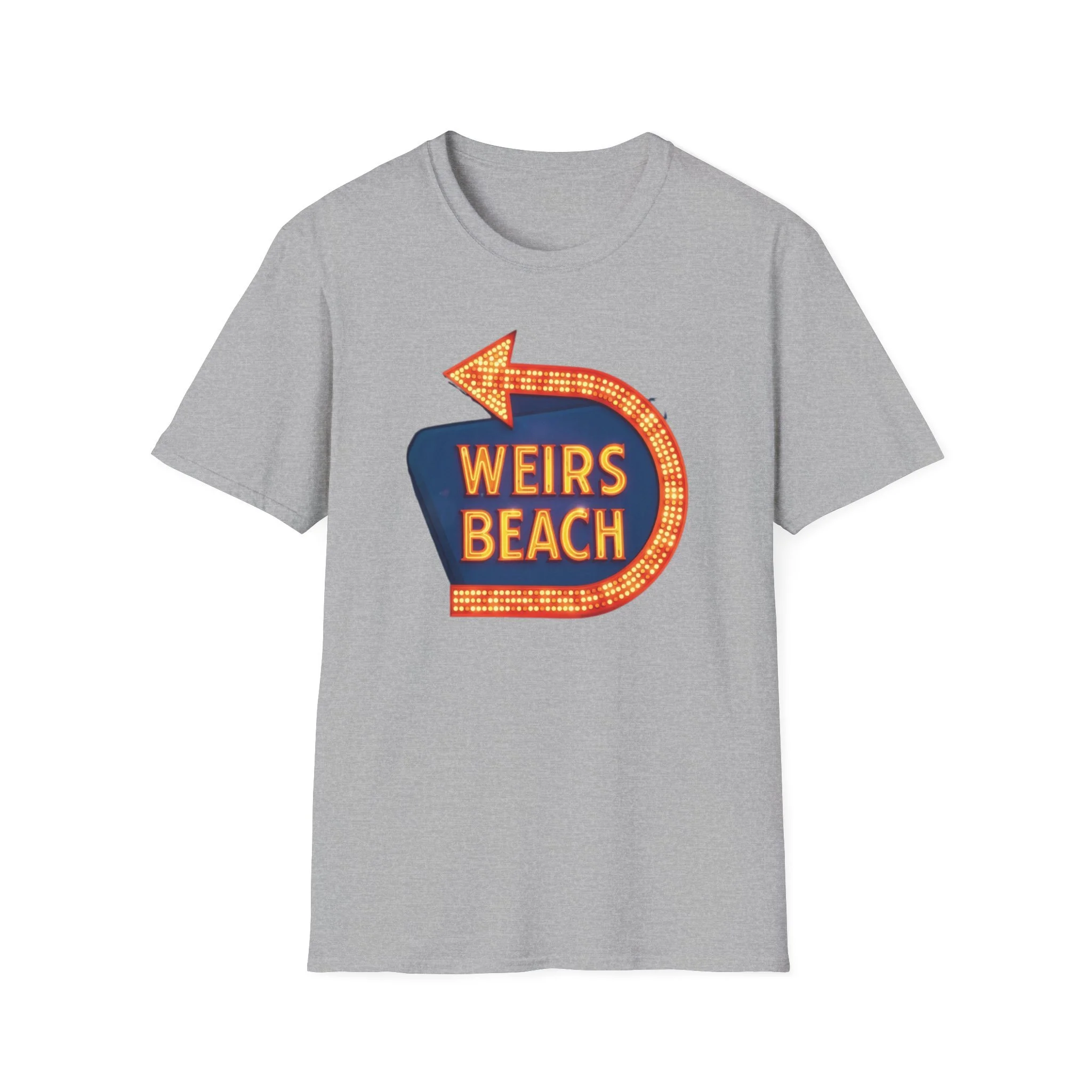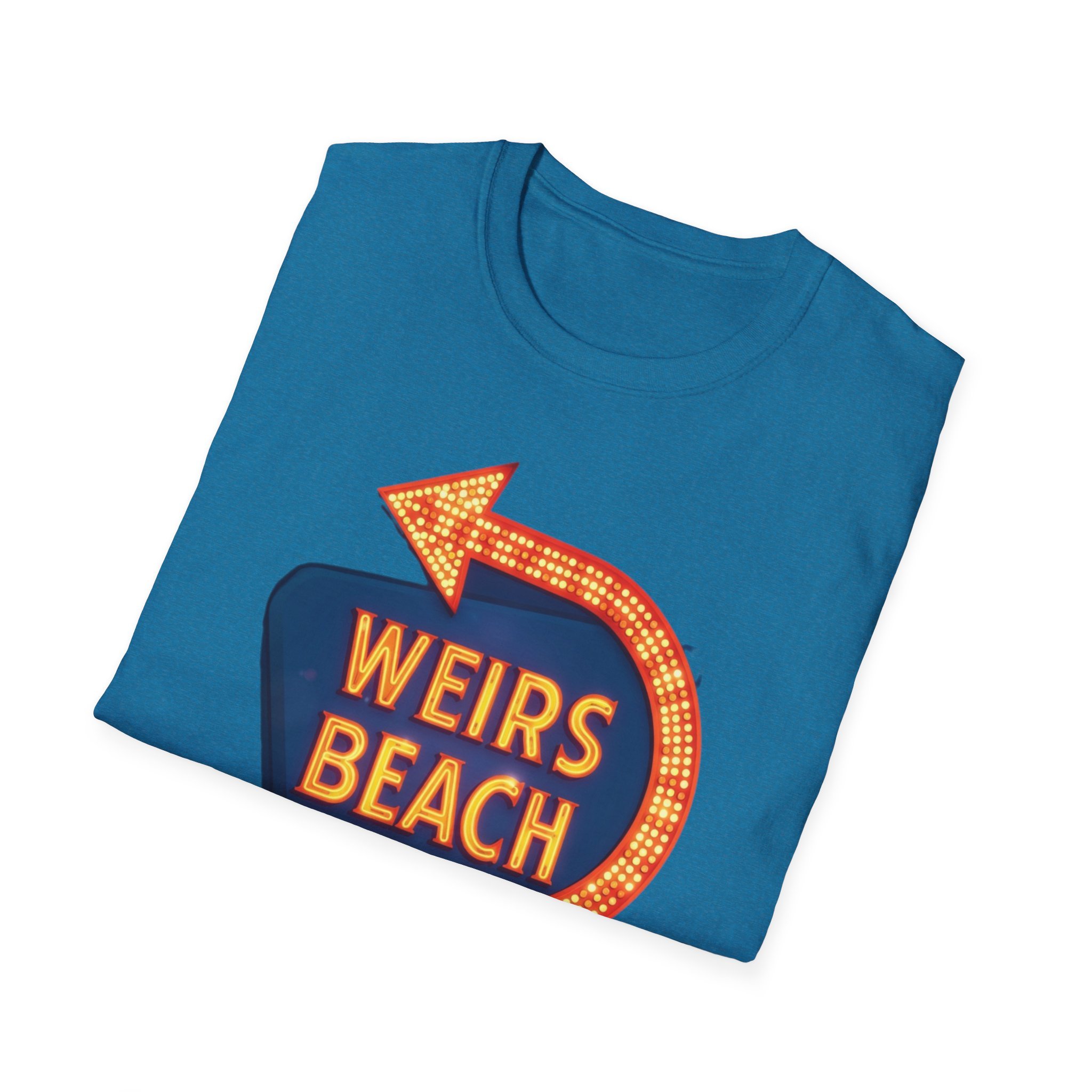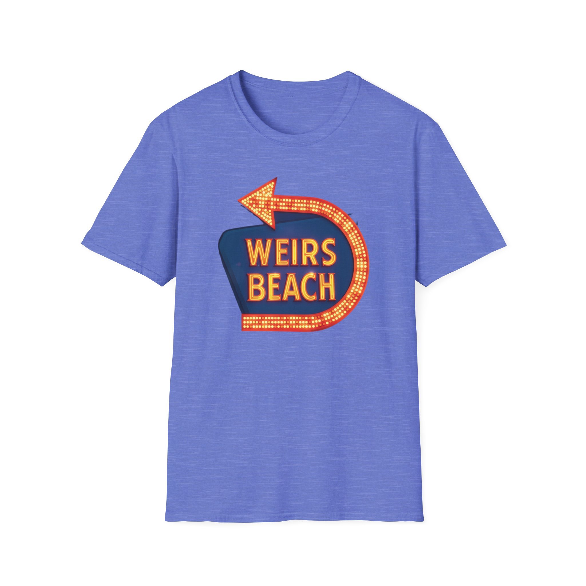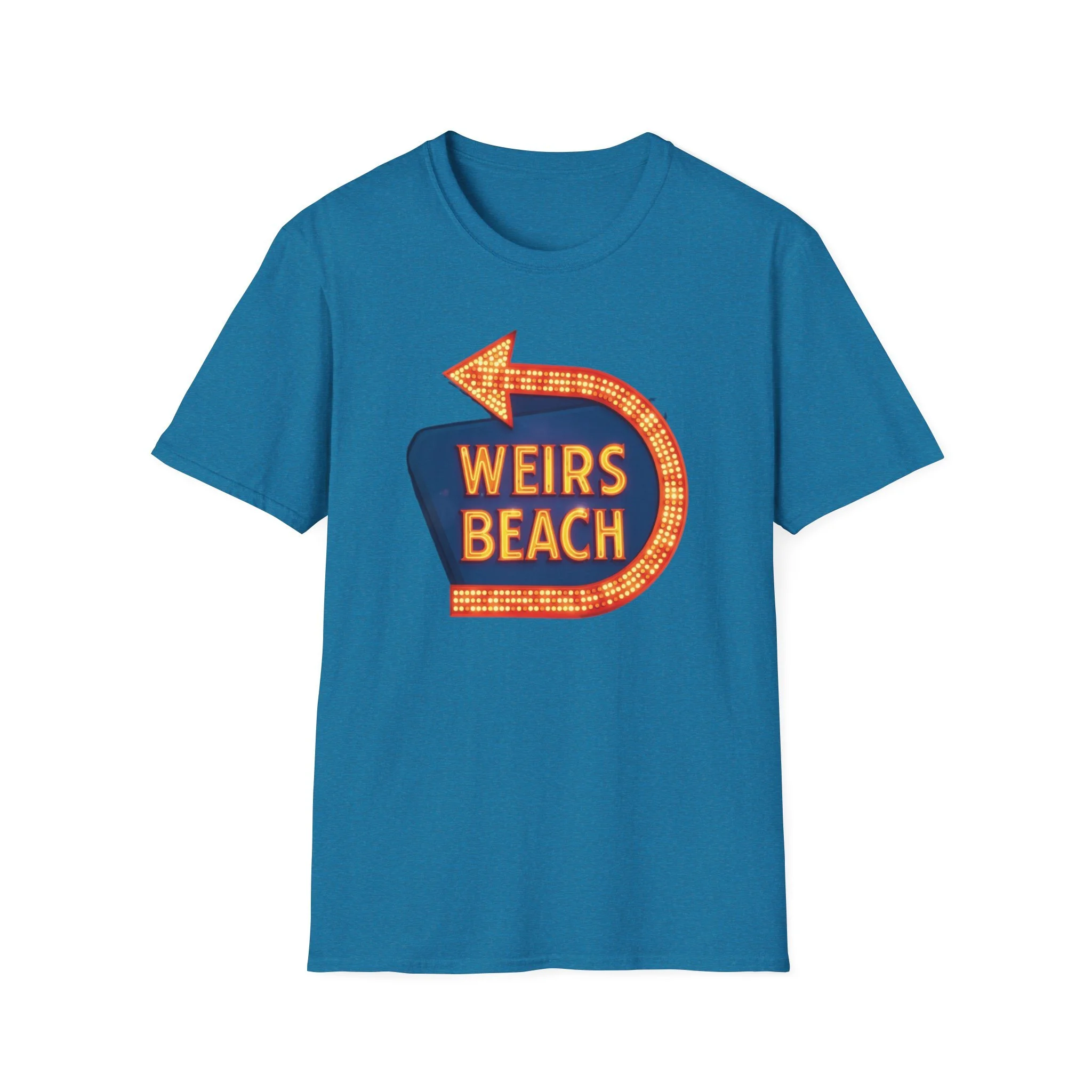 Right on the shores of Lake Winnipesaukee in Laconia, New Hampshire, Weirs Beach has been the beating heart of summer fun in the Lakes Region for generations. With its iconic boardwalk, arcades, shops, restaurants, and that famous giant arrow sign pointing the way, Weirs Beach has delivered classic lakeside vibes — swimming, boating, mini-golf, fireworks, and endless summer nights — since the early 20th century. The bright, retro marquee-style “WEIRS BEACH” sign with its glowing orange bulbs and arrow became a true landmark for anyone cruising Route 3 or heading to the water. This vibrant blue t-shirt brings that classic Weirs Beach energy back with the bold, illuminated retro sign design — the big arrow curving around the glowing “WEIRS BEACH” lettering. Soft, breathable, and perfect for hot summer days at the lake, beach hangs, or just repping one of New Hampshire’s most beloved lakeside destinations. Wear it and spark those instant “Heading to Weirs Beach this weekend!” memories from anyone who’s ever walked the boardwalk or watched the fireworks over the lake.