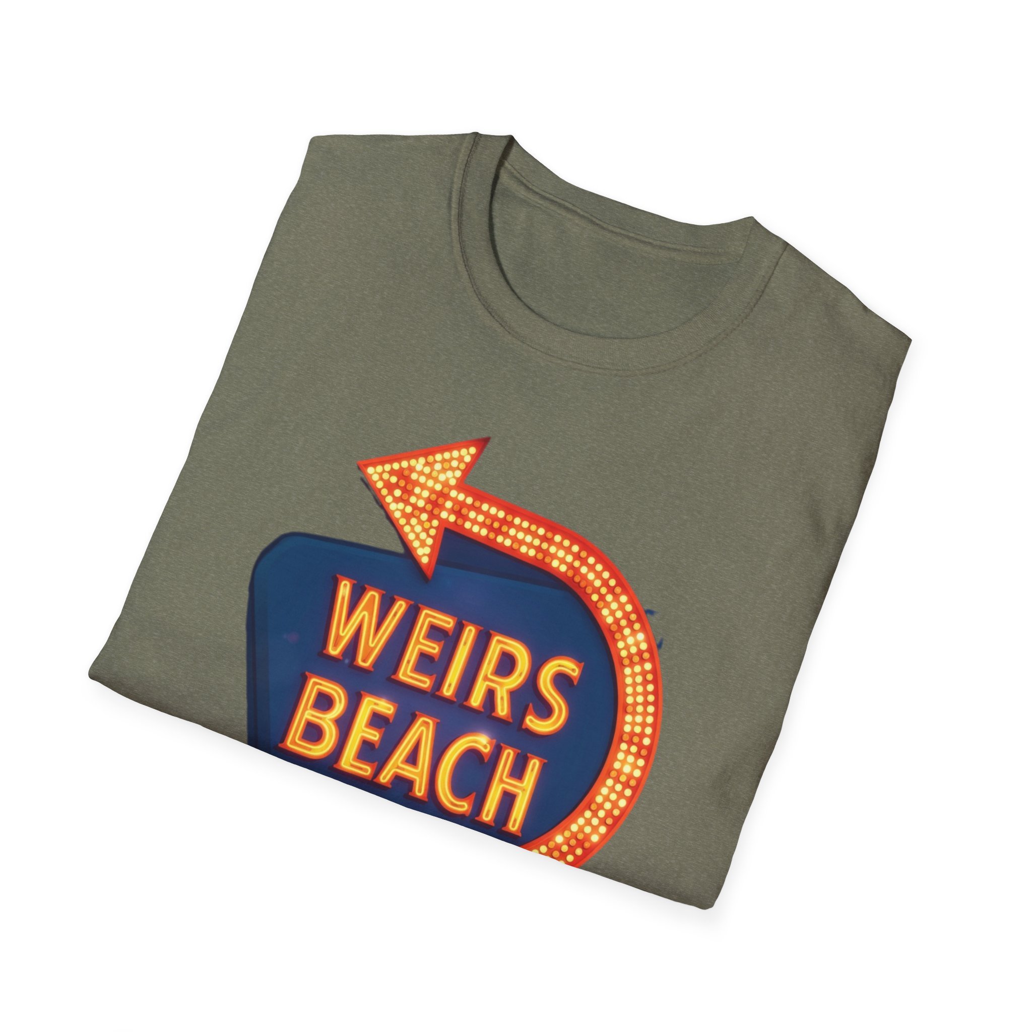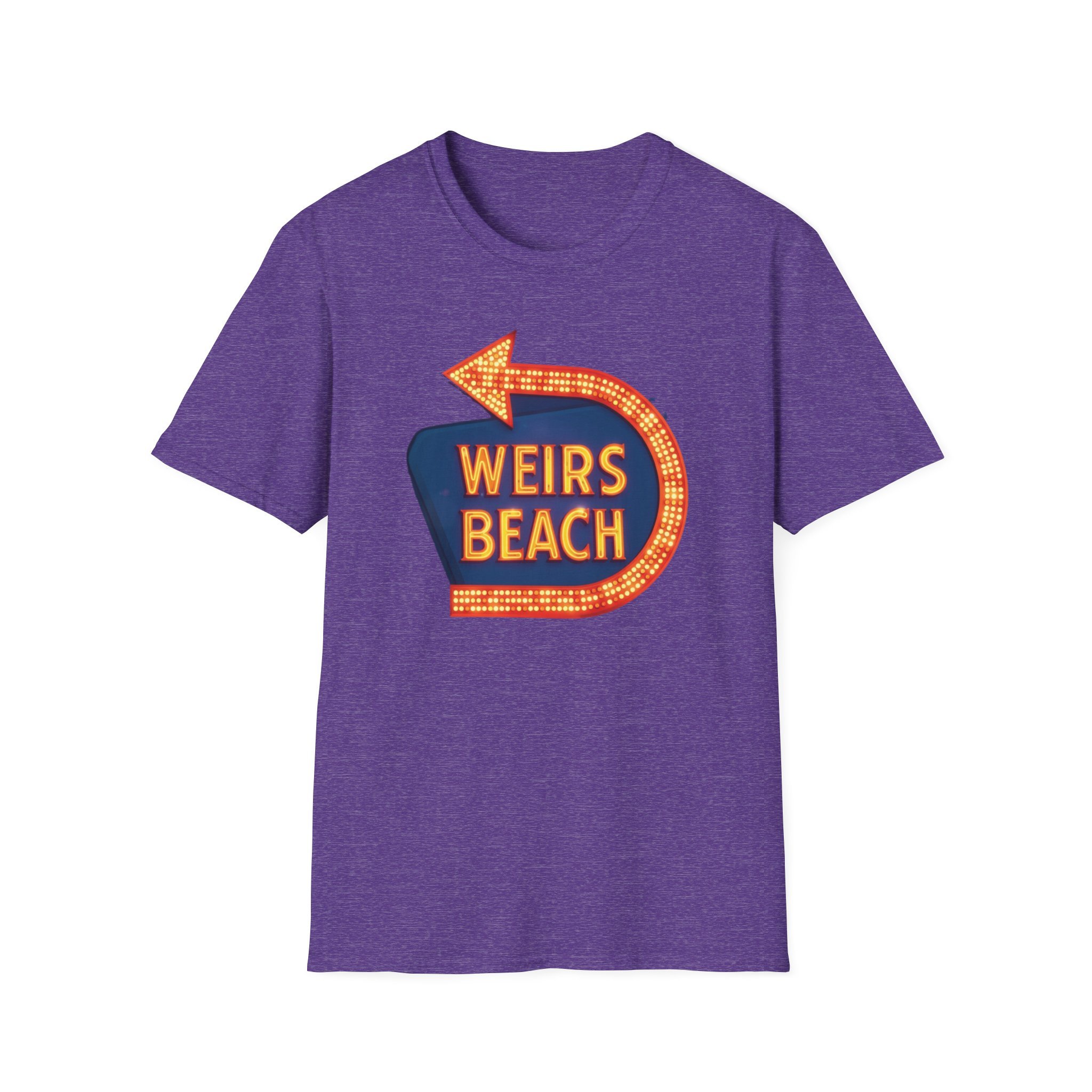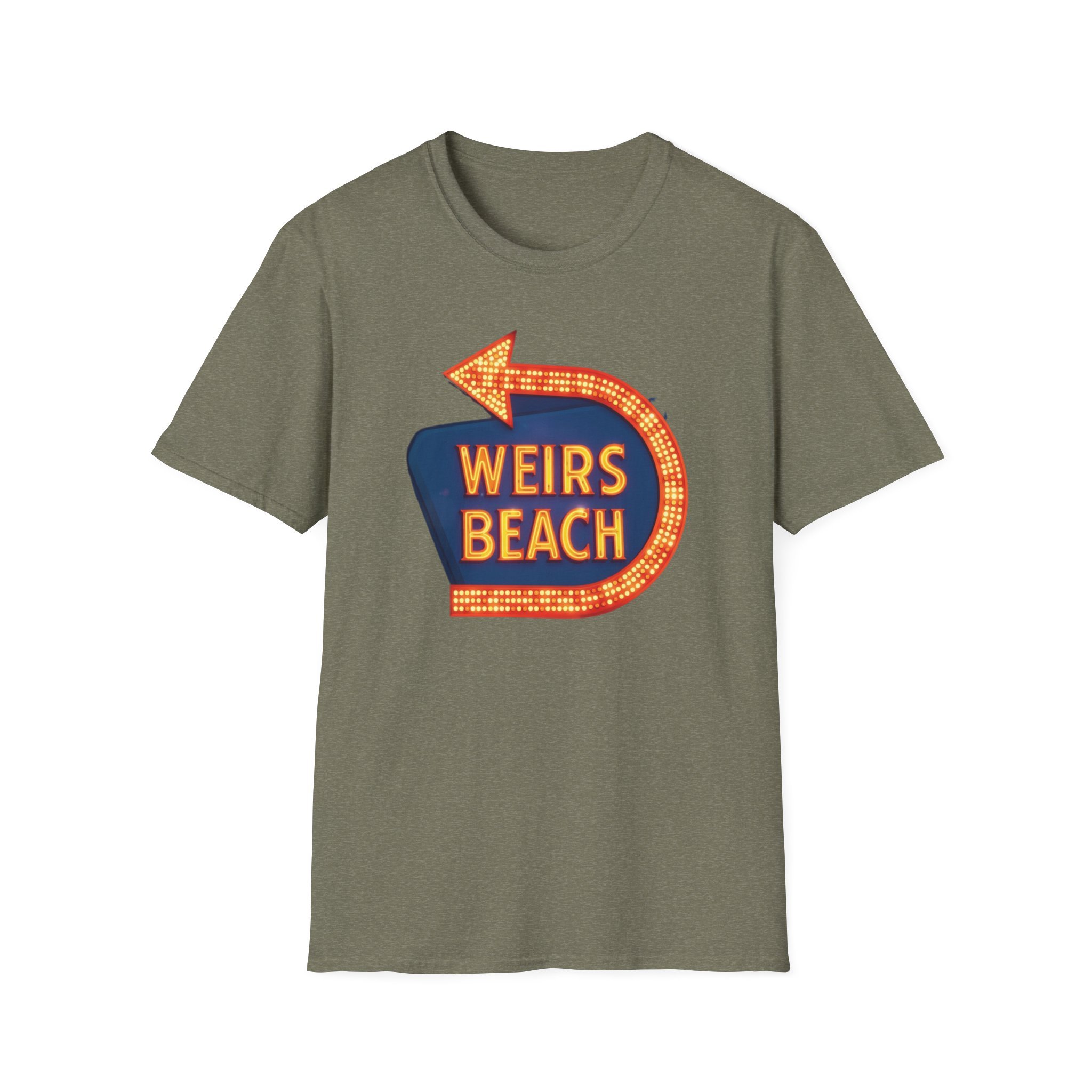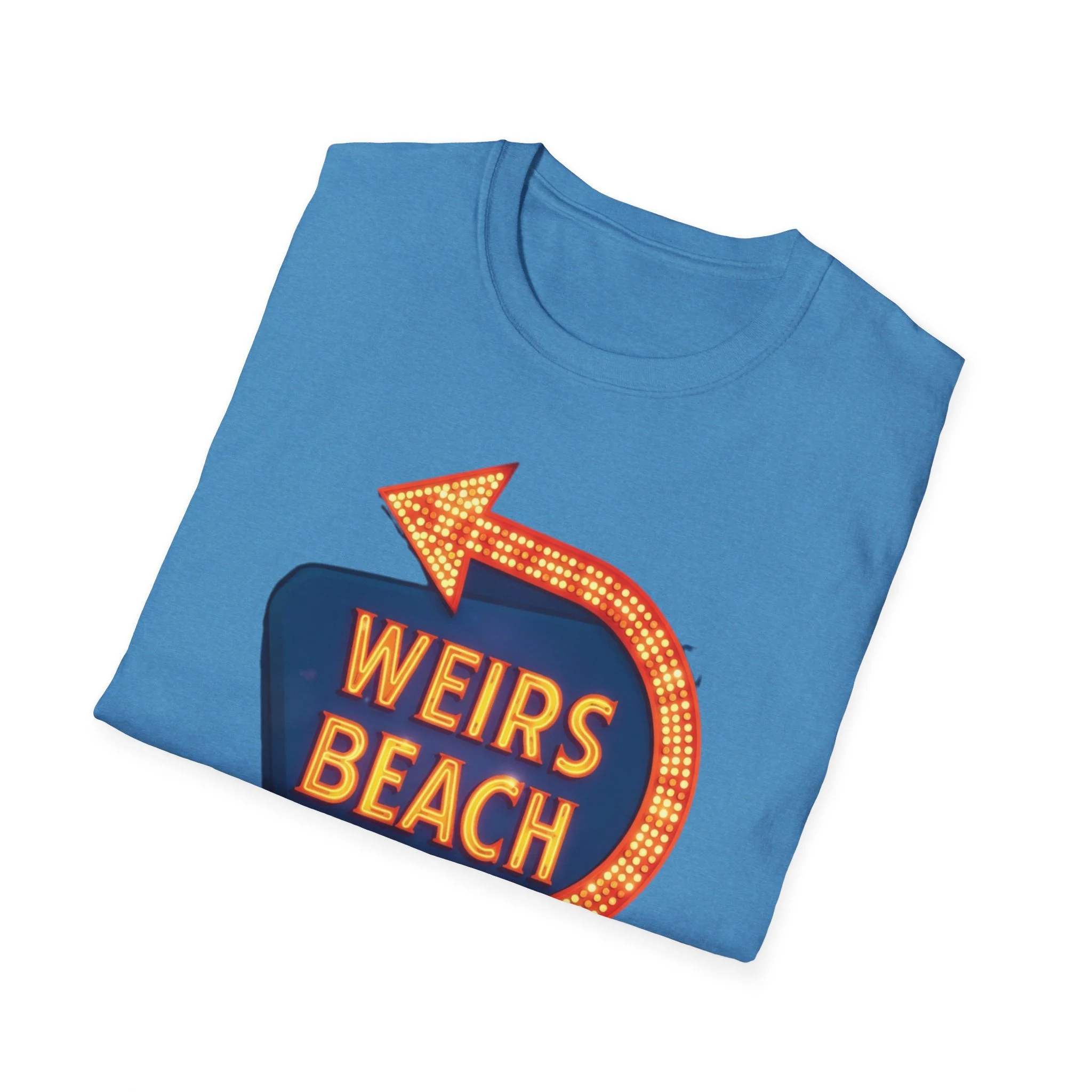 Right on the shores of Lake Winnipesaukee in Laconia, New Hampshire, Weirs Beach has been the beating heart of summer fun in the Lakes Region for generations. With its iconic boardwalk, arcades, shops, restaurants, and that famous giant arrow sign pointing the way, Weirs Beach has delivered classic lakeside vibes — swimming, boating, mini-golf, fireworks, and endless summer nights — since the early 20th century. The bright, retro marquee-style “WEIRS BEACH” sign with its glowing orange bulbs and arrow became a true landmark for anyone cruising Route 3 or heading to the water. This vibrant blue t-shirt brings that classic Weirs Beach energy back with the bold, illuminated retro sign design — the big arrow curving around the glowing “WEIRS BEACH” lettering. Soft, breathable, and perfect for hot summer days at the lake, beach hangs, or just repping one of New Hampshire’s most beloved lakeside destinations. Wear it and spark those instant “Heading to Weirs Beach this weekend!” memories from anyone who’s ever walked the boardwalk or watched the fireworks over the lake.