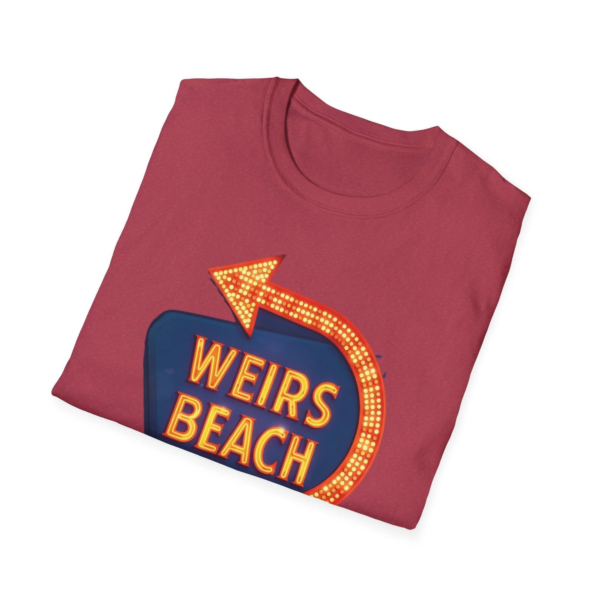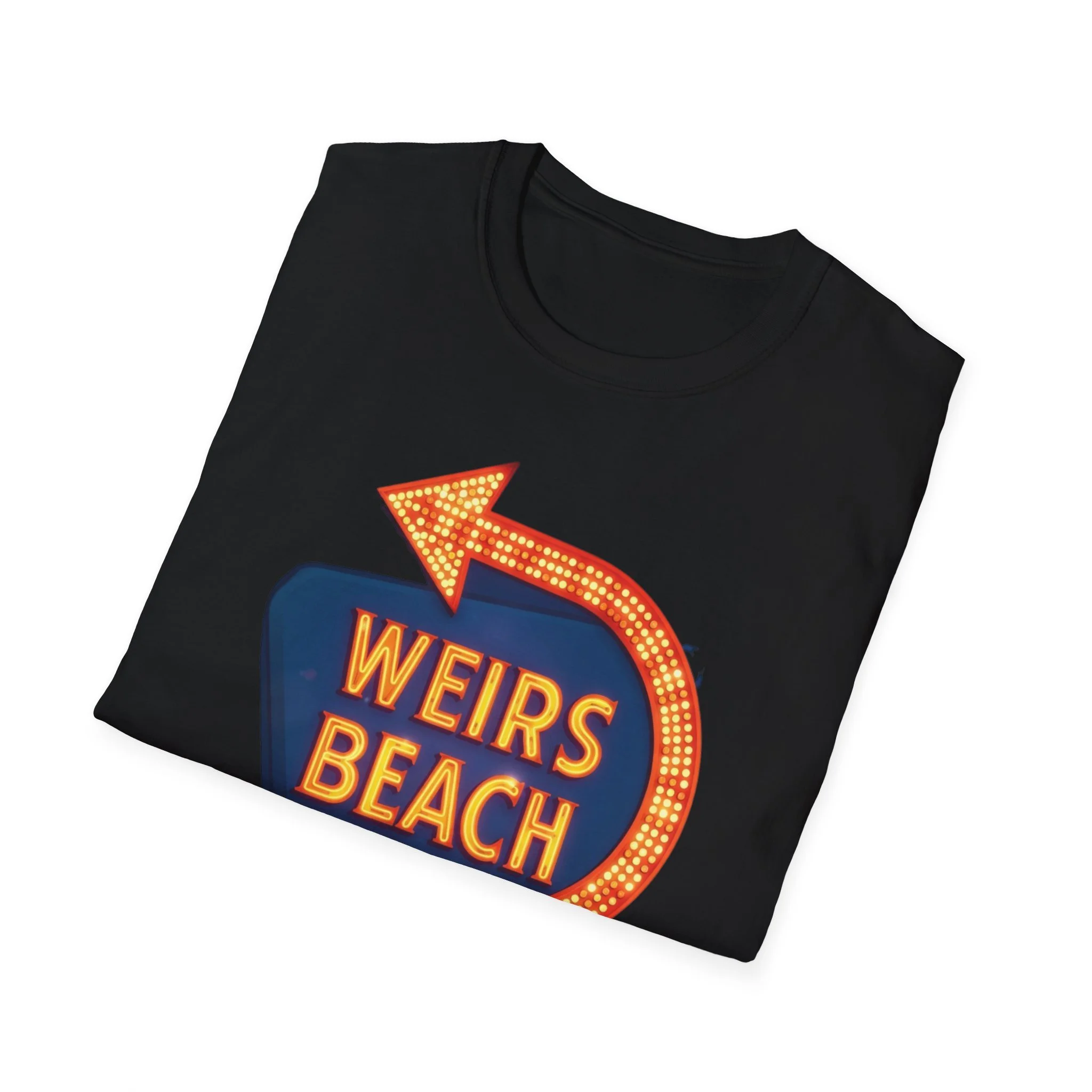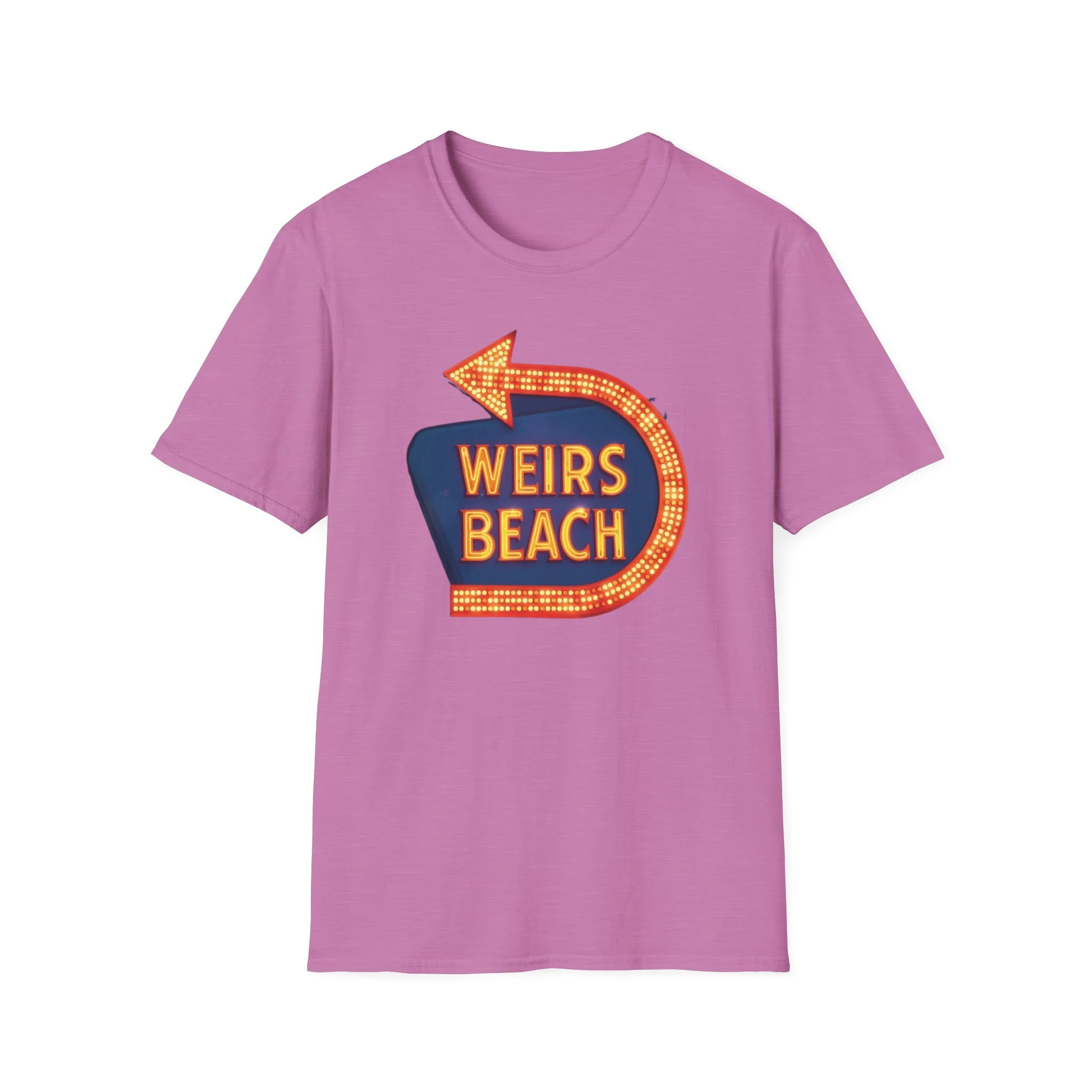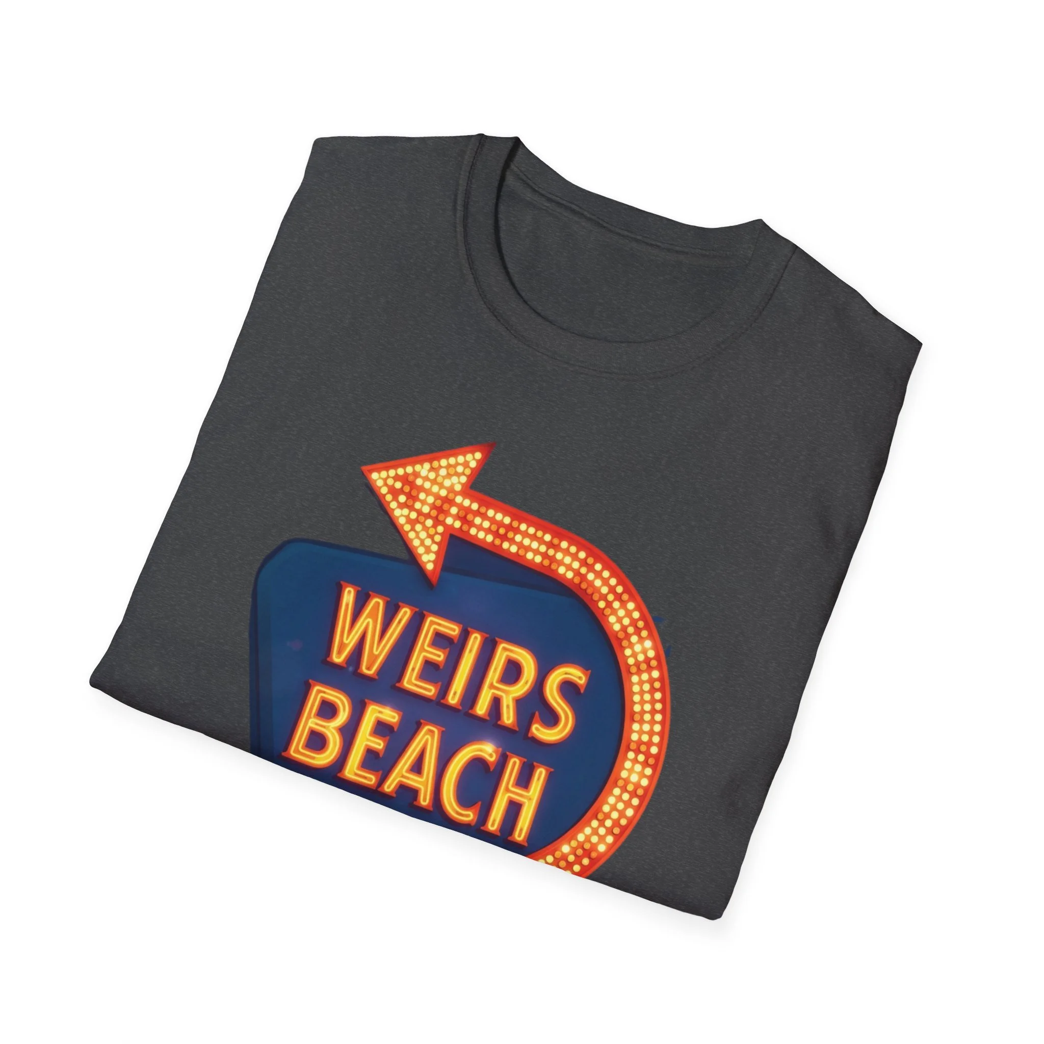 Right on the shores of Lake Winnipesaukee in Laconia, New Hampshire, Weirs Beach has been the beating heart of summer fun in the Lakes Region for generations. With its iconic boardwalk, arcades, shops, restaurants, and that famous giant arrow sign pointing the way, Weirs Beach has delivered classic lakeside vibes — swimming, boating, mini-golf, fireworks, and endless summer nights — since the early 20th century. The bright, retro marquee-style “WEIRS BEACH” sign with its glowing orange bulbs and arrow became a true landmark for anyone cruising Route 3 or heading to the water. This vibrant blue t-shirt brings that classic Weirs Beach energy back with the bold, illuminated retro sign design — the big arrow curving around the glowing “WEIRS BEACH” lettering. Soft, breathable, and perfect for hot summer days at the lake, beach hangs, or just repping one of New Hampshire’s most beloved lakeside destinations. Wear it and spark those instant “Heading to Weirs Beach this weekend!” memories from anyone who’s ever walked the boardwalk or watched the fireworks over the lake.