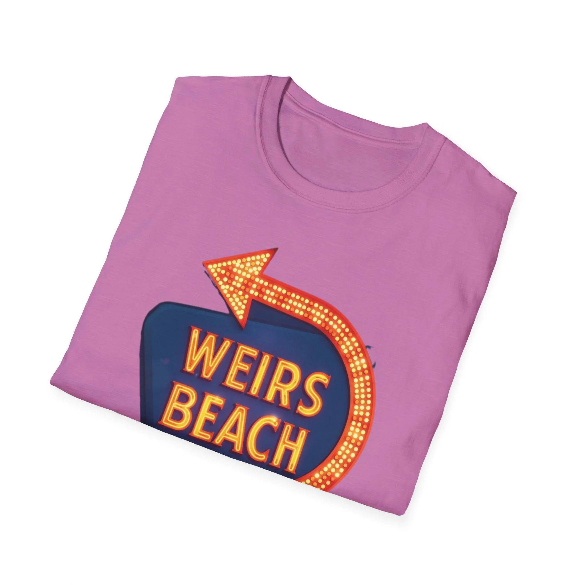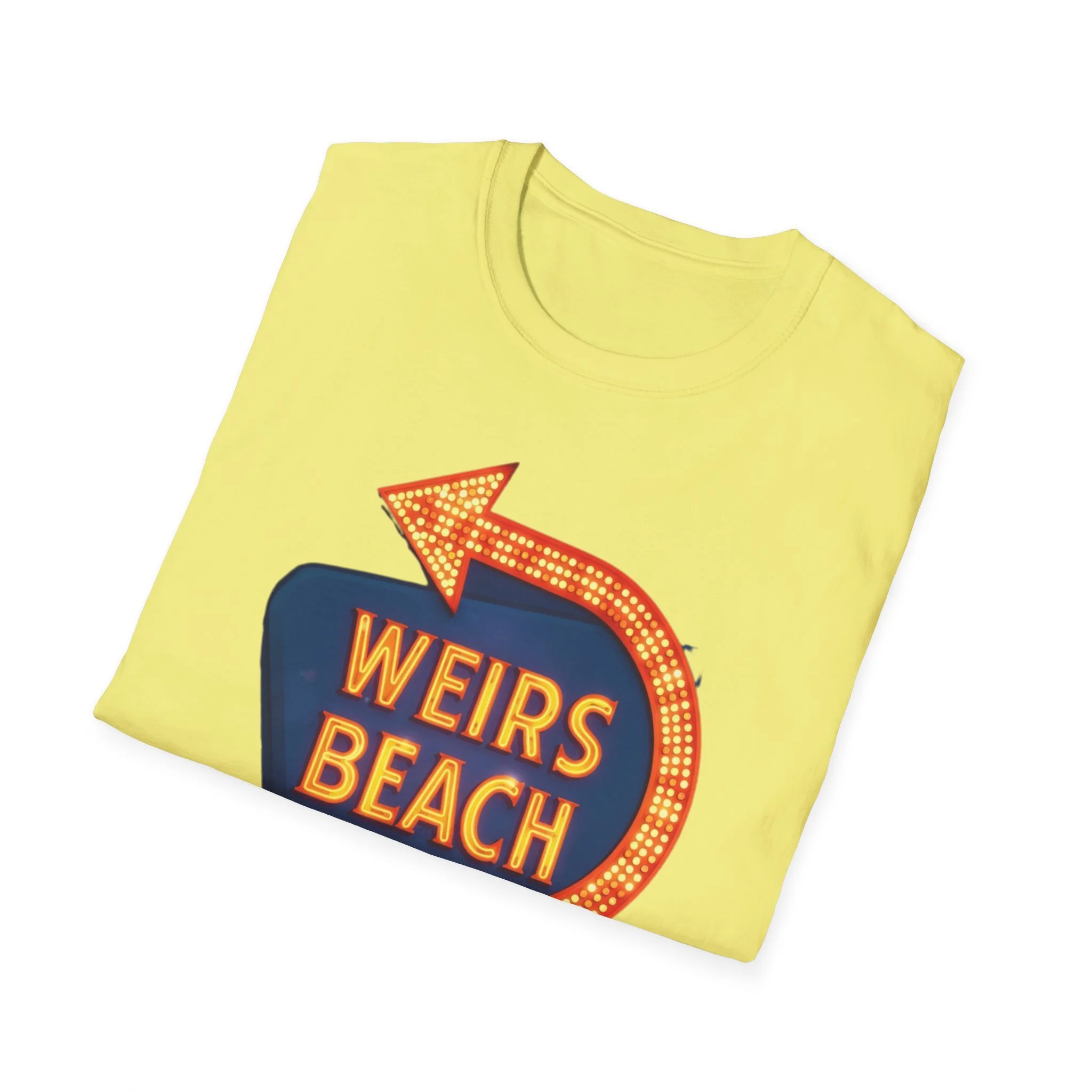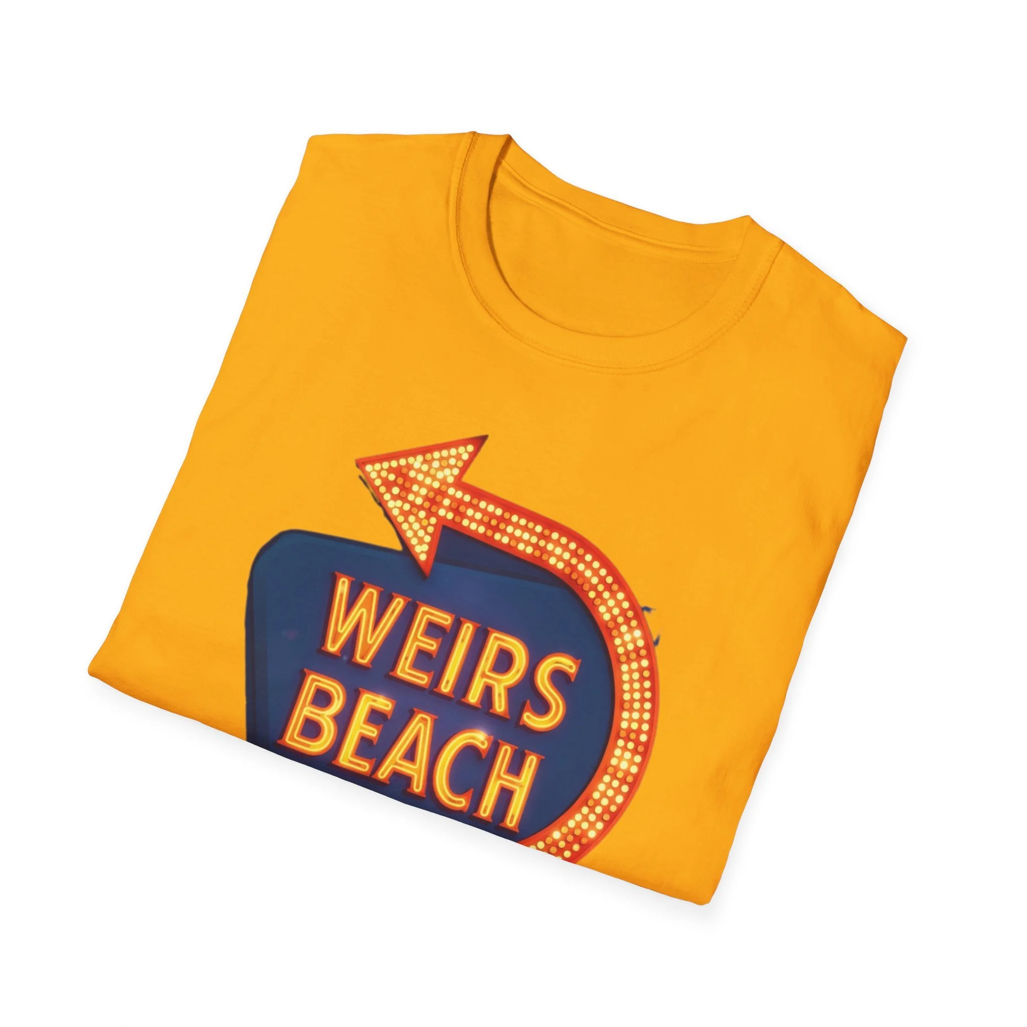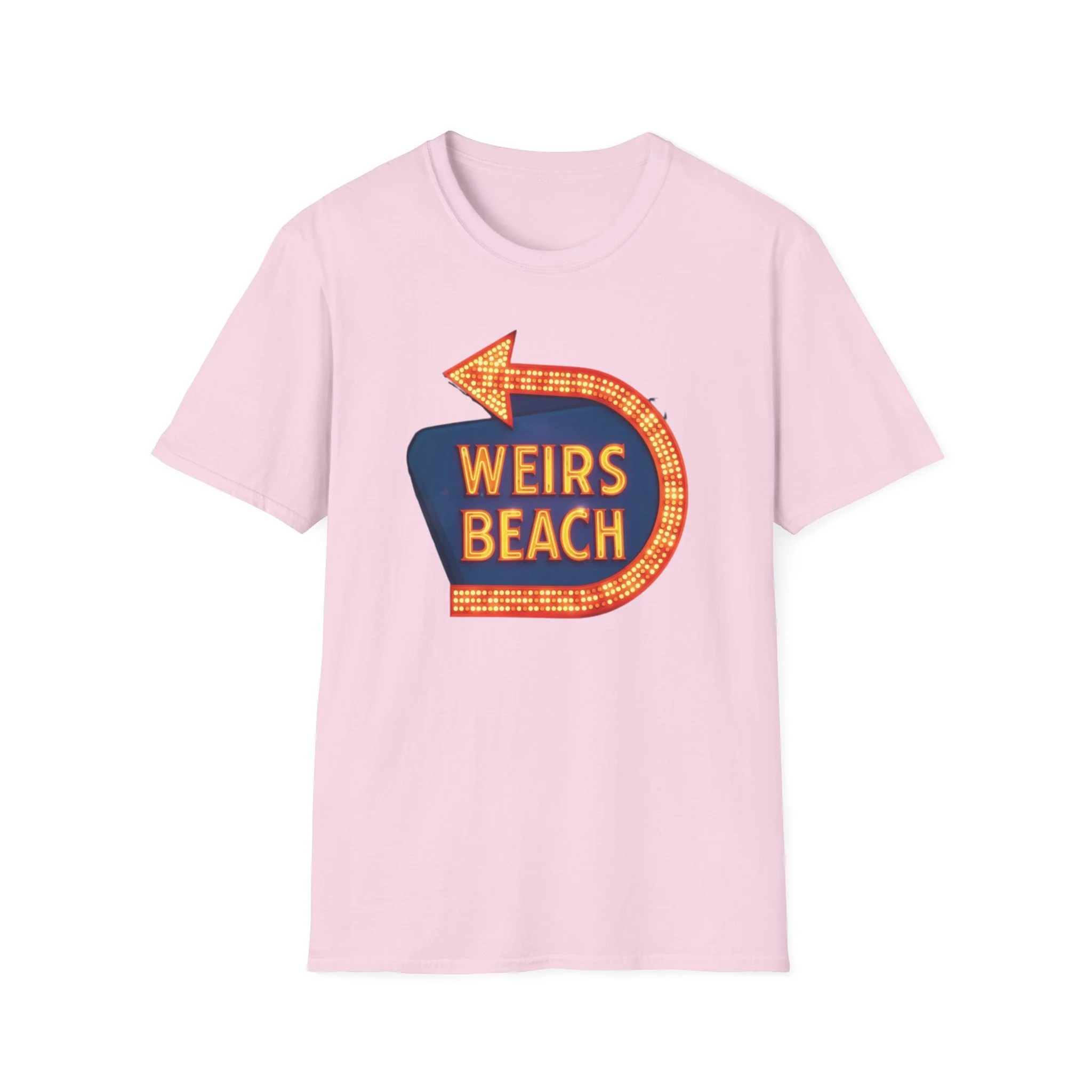 Right on the shores of Lake Winnipesaukee in Laconia, New Hampshire, Weirs Beach has been the beating heart of summer fun in the Lakes Region for generations. With its iconic boardwalk, arcades, shops, restaurants, and that famous giant arrow sign pointing the way, Weirs Beach has delivered classic lakeside vibes — swimming, boating, mini-golf, fireworks, and endless summer nights — since the early 20th century. The bright, retro marquee-style “WEIRS BEACH” sign with its glowing orange bulbs and arrow became a true landmark for anyone cruising Route 3 or heading to the water. This vibrant blue t-shirt brings that classic Weirs Beach energy back with the bold, illuminated retro sign design — the big arrow curving around the glowing “WEIRS BEACH” lettering. Soft, breathable, and perfect for hot summer days at the lake, beach hangs, or just repping one of New Hampshire’s most beloved lakeside destinations. Wear it and spark those instant “Heading to Weirs Beach this weekend!” memories from anyone who’s ever walked the boardwalk or watched the fireworks over the lake.