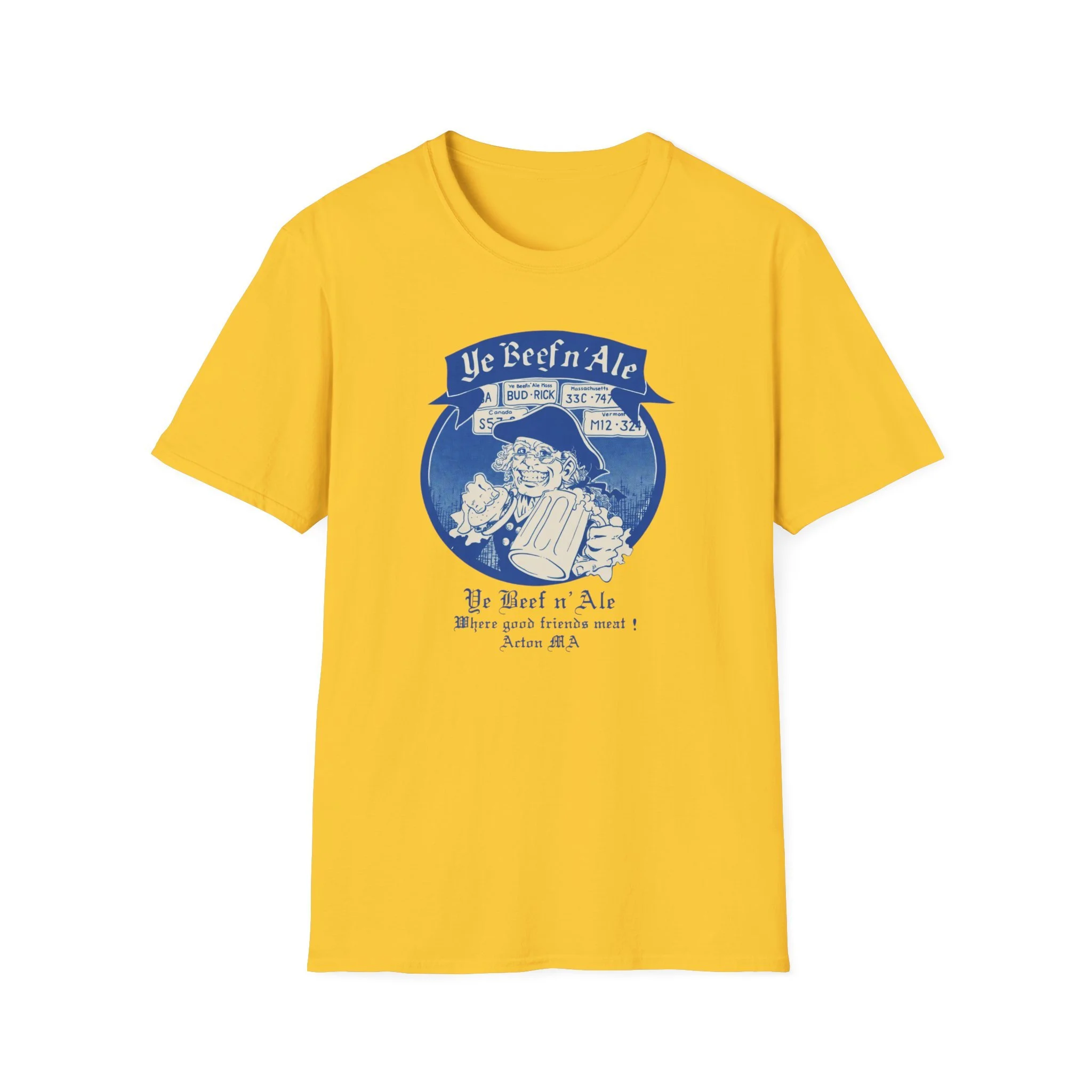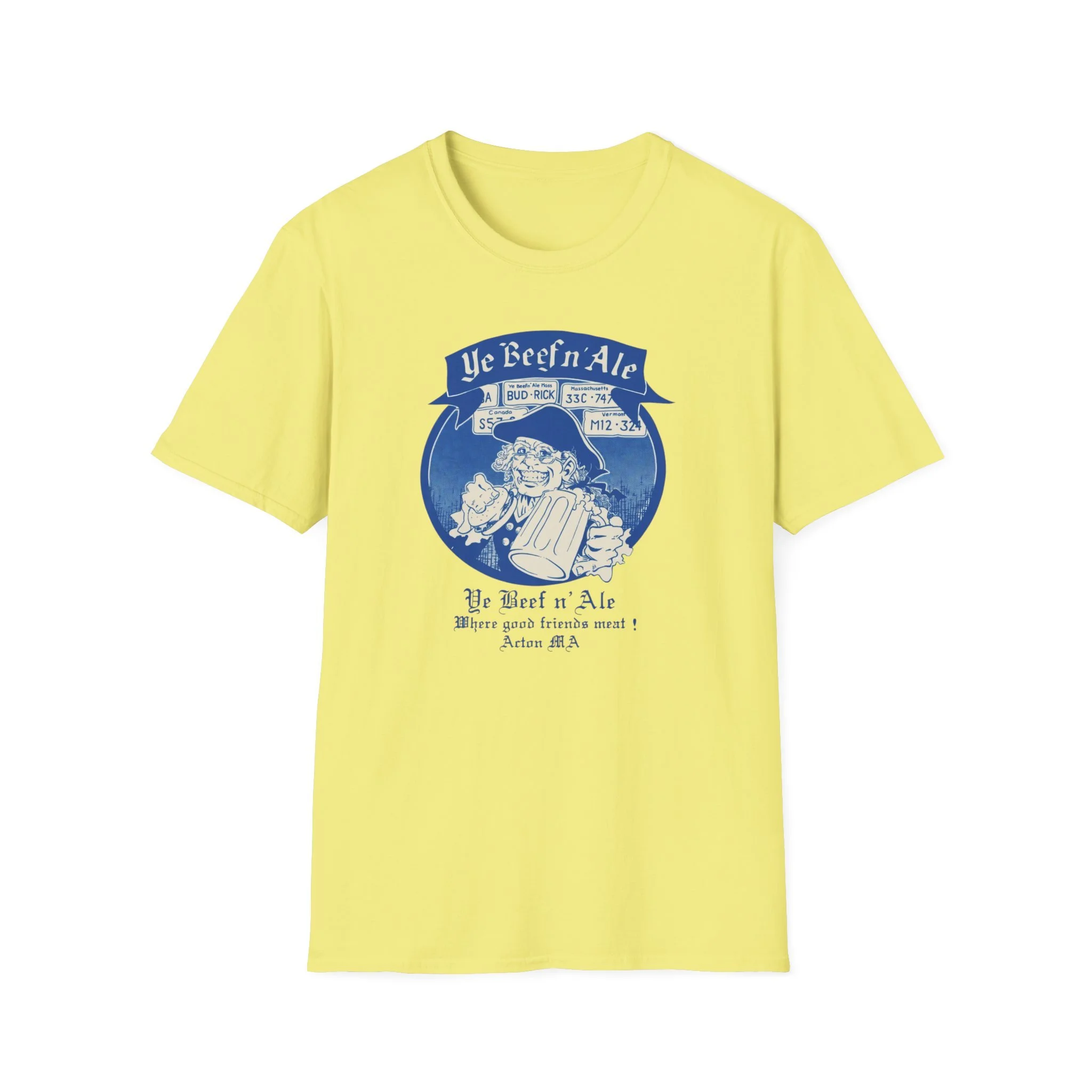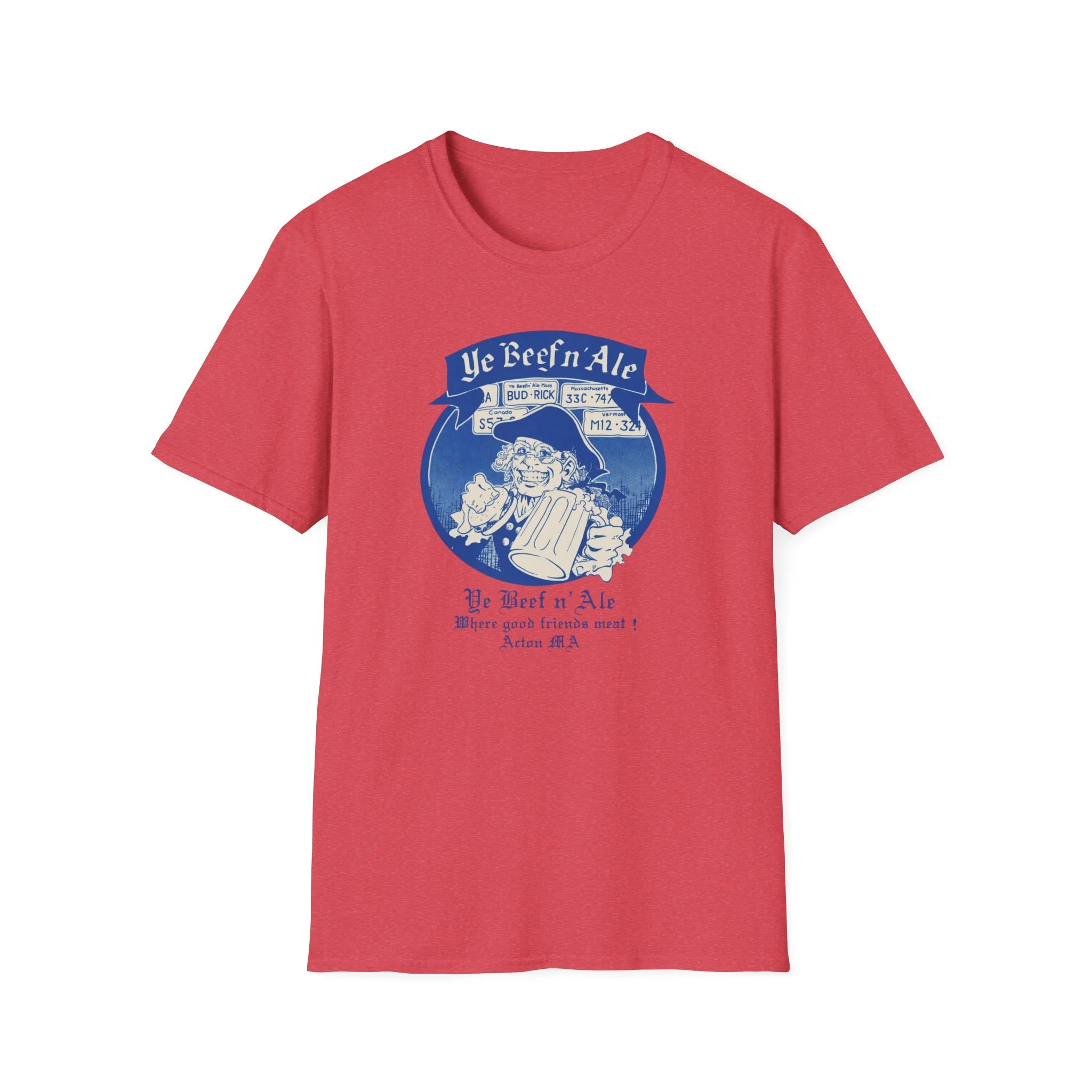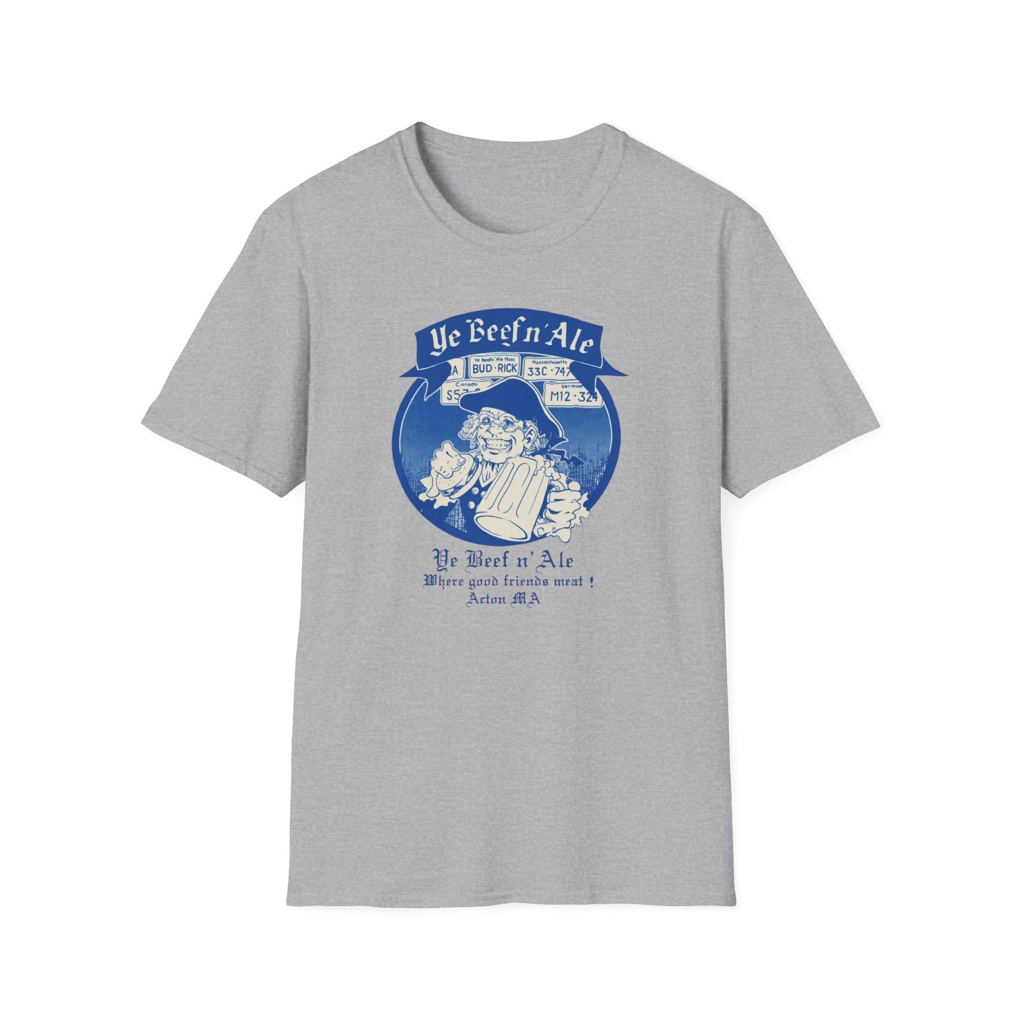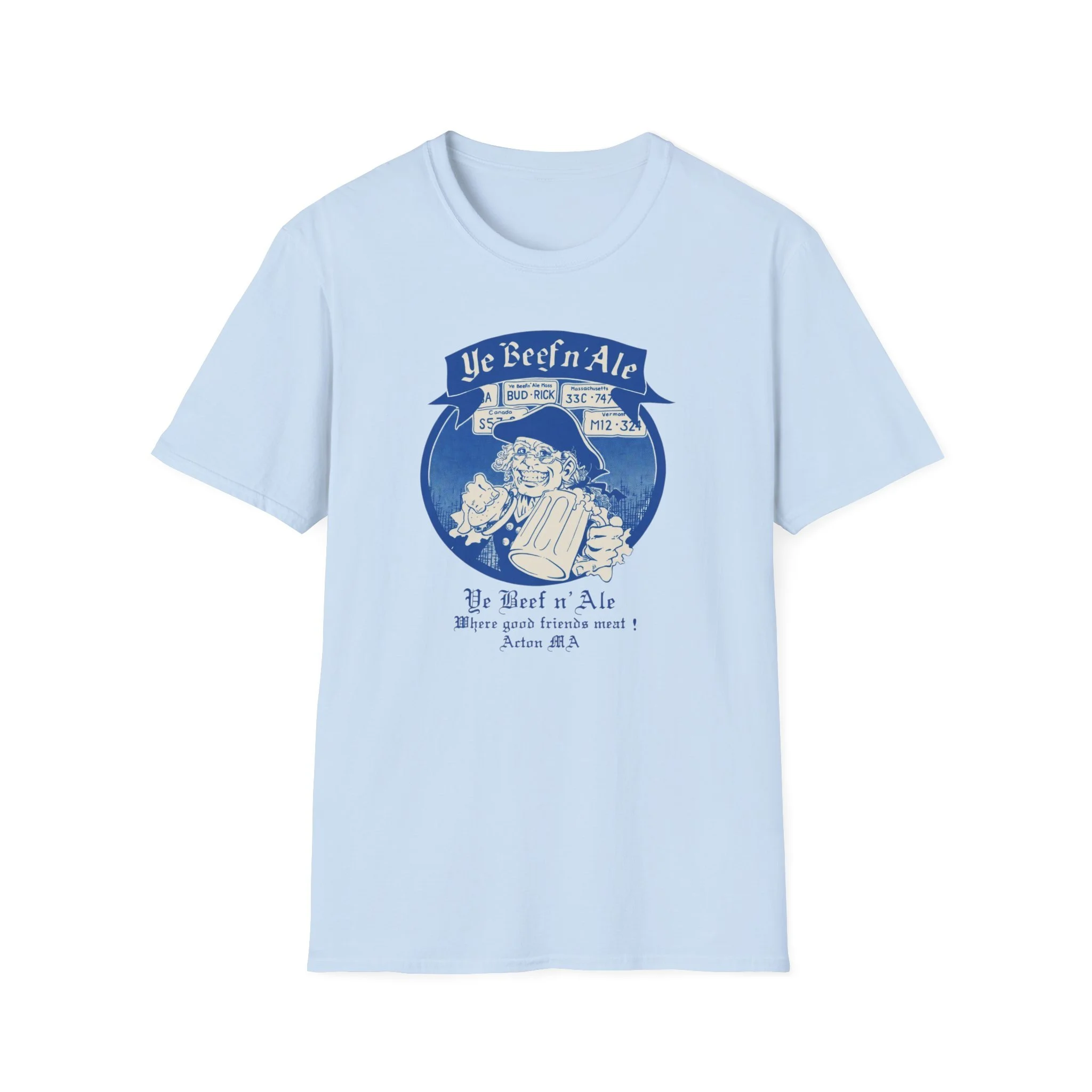 For decades, Ye Beef 'n' Ale in Acton, Massachusetts, was a beloved local gathering spot where good friends truly did meet. With its friendly gnome-like mascot cheerfully hoisting a frothy mug, vintage license plate accents, and the warm tagline “Where good friends meet!”, this classic pub and restaurant became a favorite for hearty meals, cold drinks, and that genuine neighborhood welcome. It captured the unpretentious, welcoming spirit of old-school New England dining at its best. This t-shirt faithfully revives the classic Ye Beef 'n' Ale branding with the smiling character, the bold blue banner “Ye Beef 'n' Ale,” the surrounding license plate details, and the heartfelt “Where good friends meet!” slogan with “Acton MA” below. Soft, breathable, and built for everyday wear — perfect for former regulars, Acton locals, or anyone who appreciates a slice of genuine Massachusetts pub nostalgia. Wear it and spark those “Remember going to Ye Beef 'n' Ale?” stories from anyone who ever enjoyed a meal or a pint where good friends met in Acton.