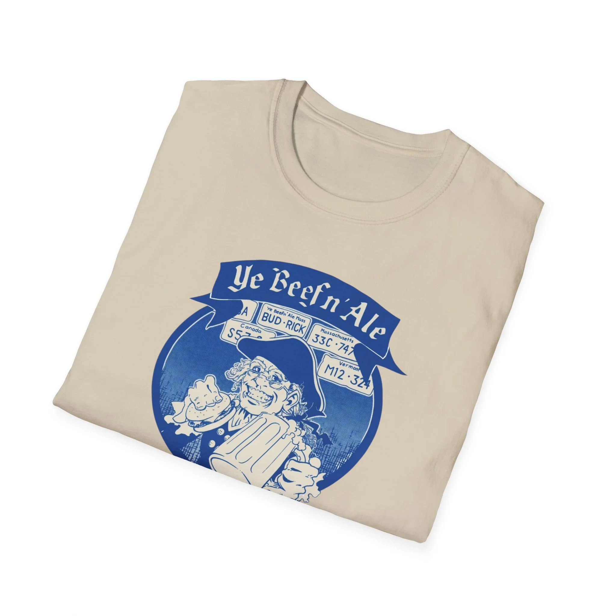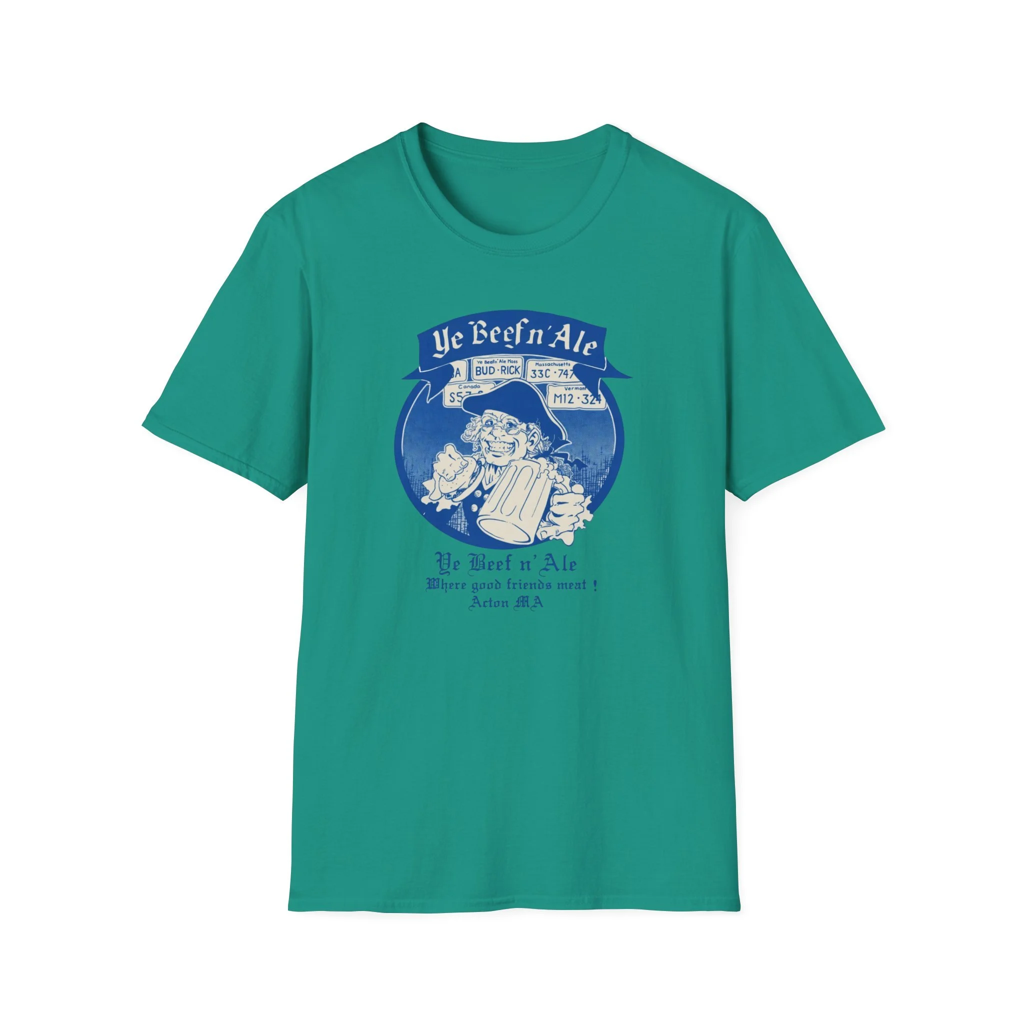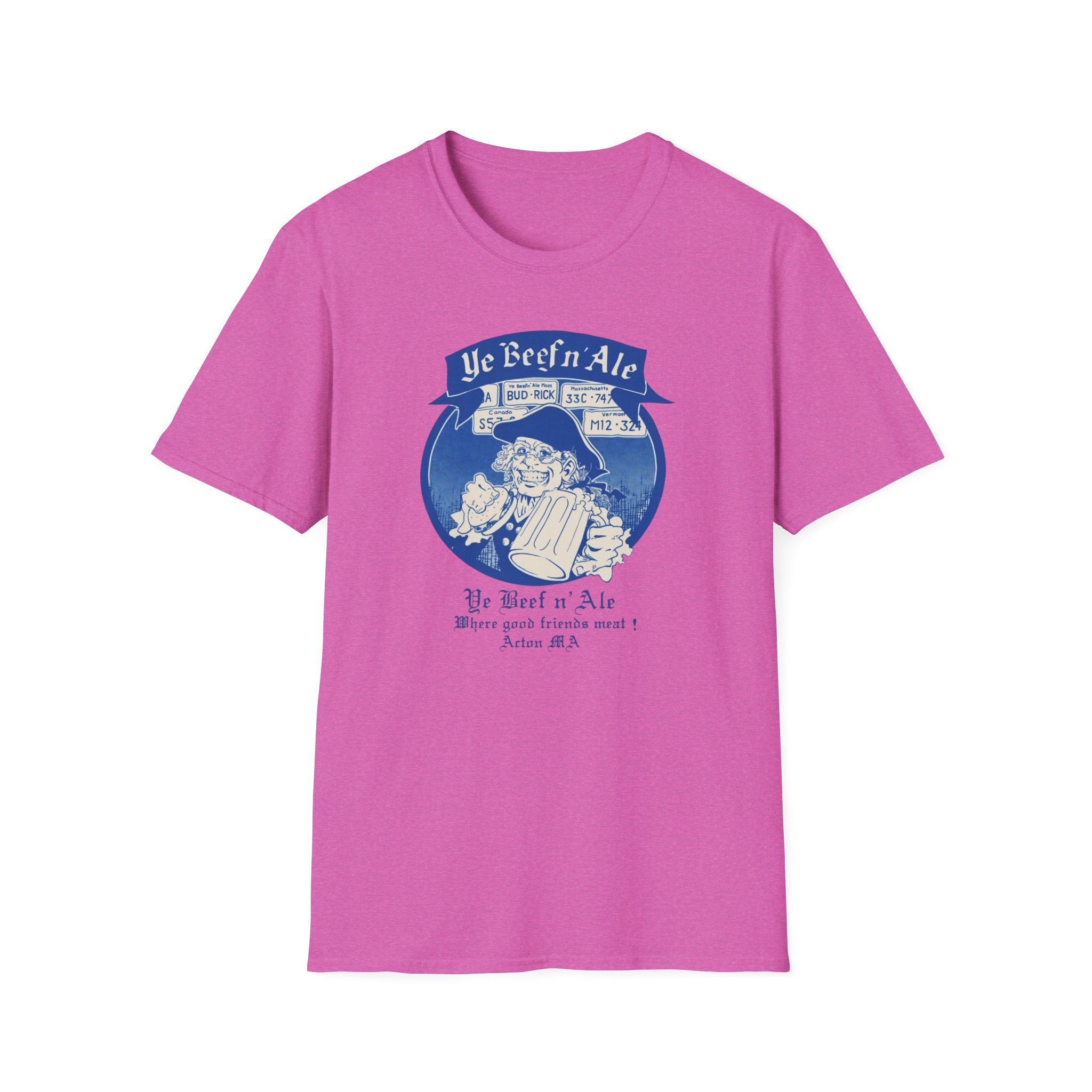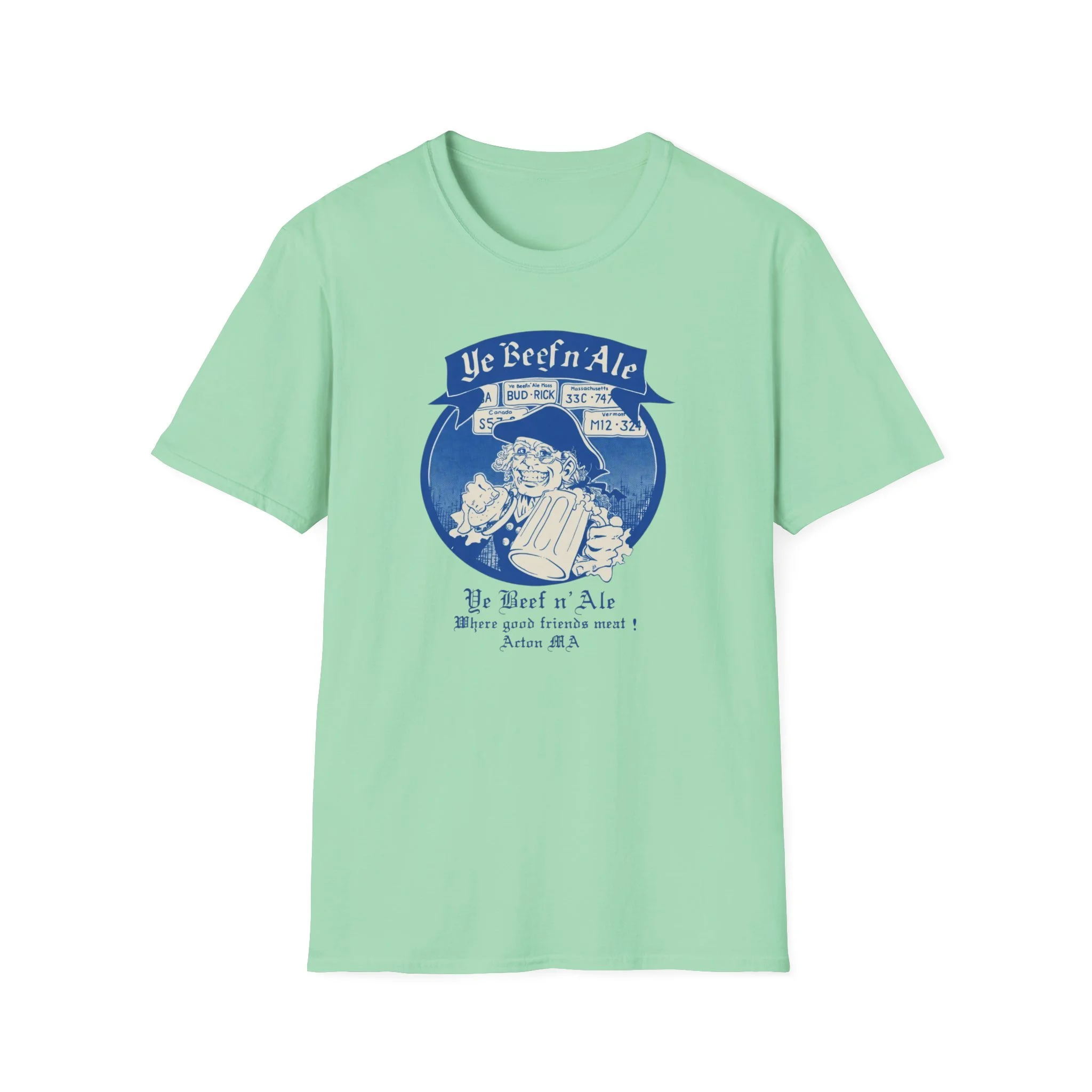 For decades, Ye Beef 'n' Ale in Acton, Massachusetts, was a beloved local gathering spot where good friends truly did meet. With its friendly gnome-like mascot cheerfully hoisting a frothy mug, vintage license plate accents, and the warm tagline “Where good friends meet!”, this classic pub and restaurant became a favorite for hearty meals, cold drinks, and that genuine neighborhood welcome. It captured the unpretentious, welcoming spirit of old-school New England dining at its best. This t-shirt faithfully revives the classic Ye Beef 'n' Ale branding with the smiling character, the bold blue banner “Ye Beef 'n' Ale,” the surrounding license plate details, and the heartfelt “Where good friends meet!” slogan with “Acton MA” below. Soft, breathable, and built for everyday wear — perfect for former regulars, Acton locals, or anyone who appreciates a slice of genuine Massachusetts pub nostalgia. Wear it and spark those “Remember going to Ye Beef 'n' Ale?” stories from anyone who ever enjoyed a meal or a pint where good friends met in Acton.